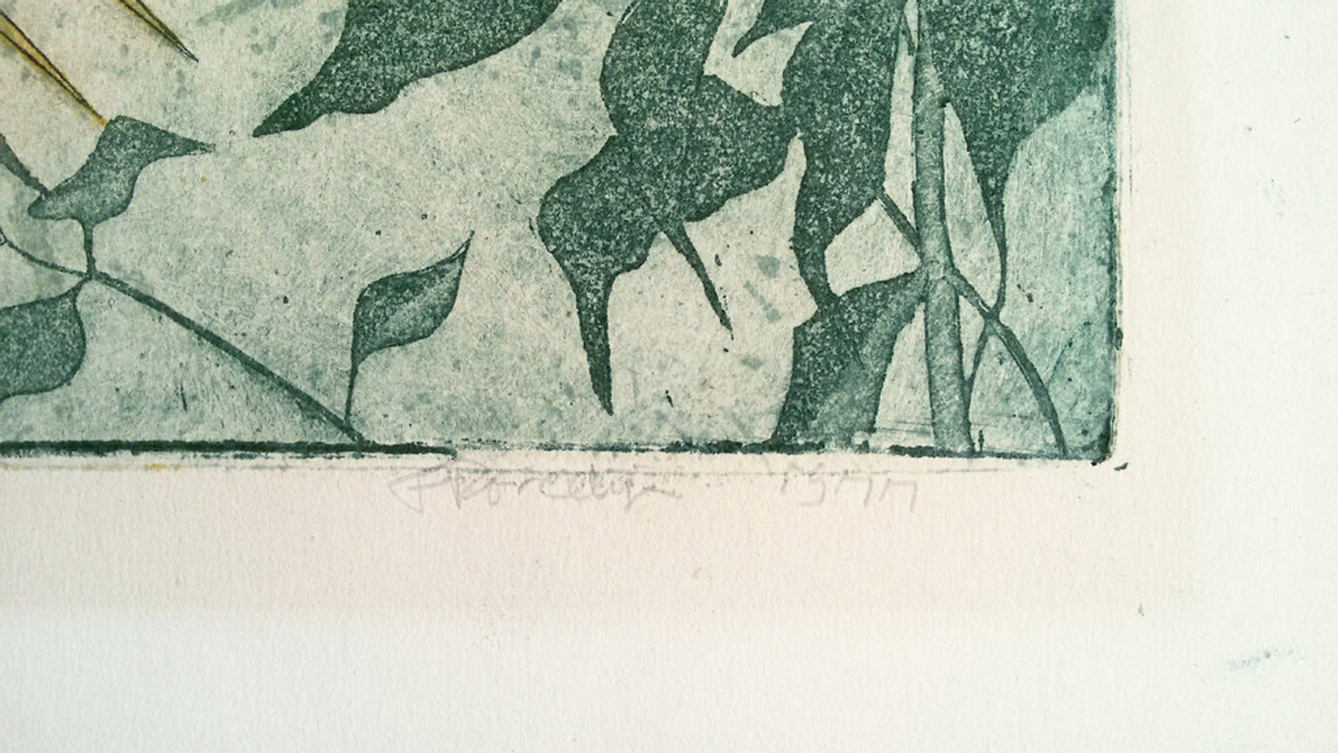 Mooi werk van Frank Porcelijn. Aquatint ets op geschept papier, met potlood gesigneerd, gedateerd (1977), getiteld en genummerd (9/20). Afkomstig uit de kunstcollectie van ABNAMRO. Beeld in goede conditie, marge en blad in redelijk goede conditie.