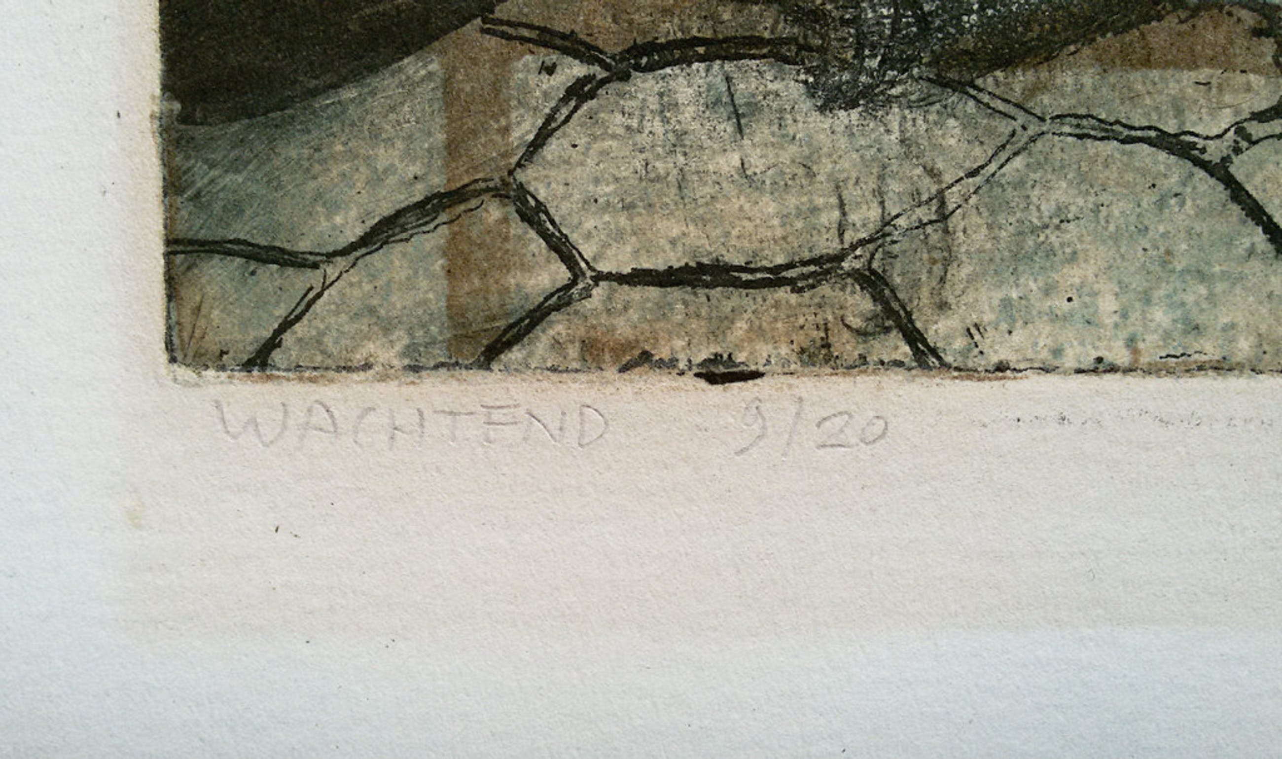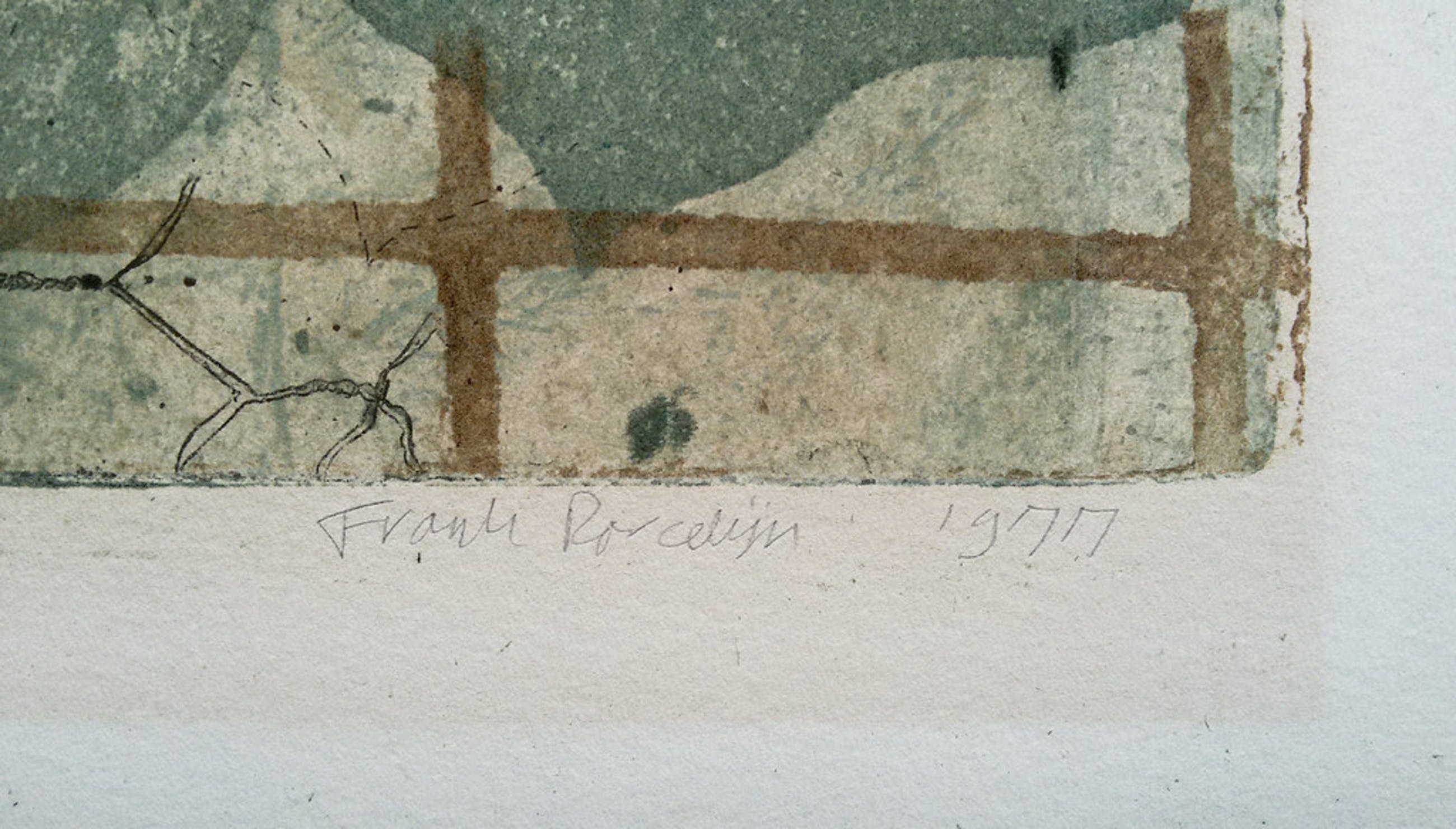 Mooi, karakteristiek werk van Frank Porcelijn. Aquatint ets op geschept papier, met potlood gesigneerd, gedateerd (1977), getiteld en genummerd (9/20). Afkomstig uit de kunstcollectie van ABNAMRO. Beeld in goede conditie, marge en blad in redelijke conditie.