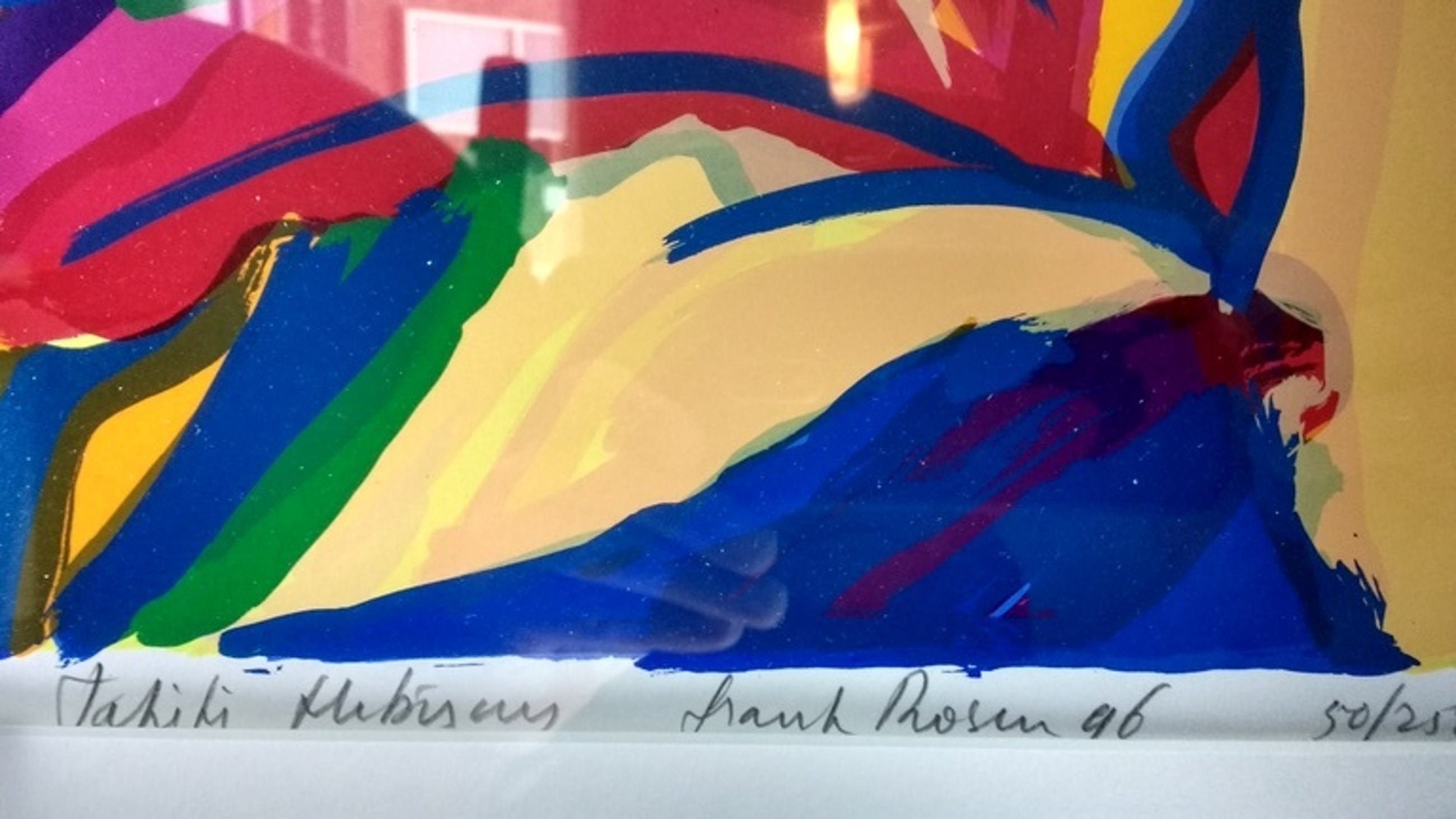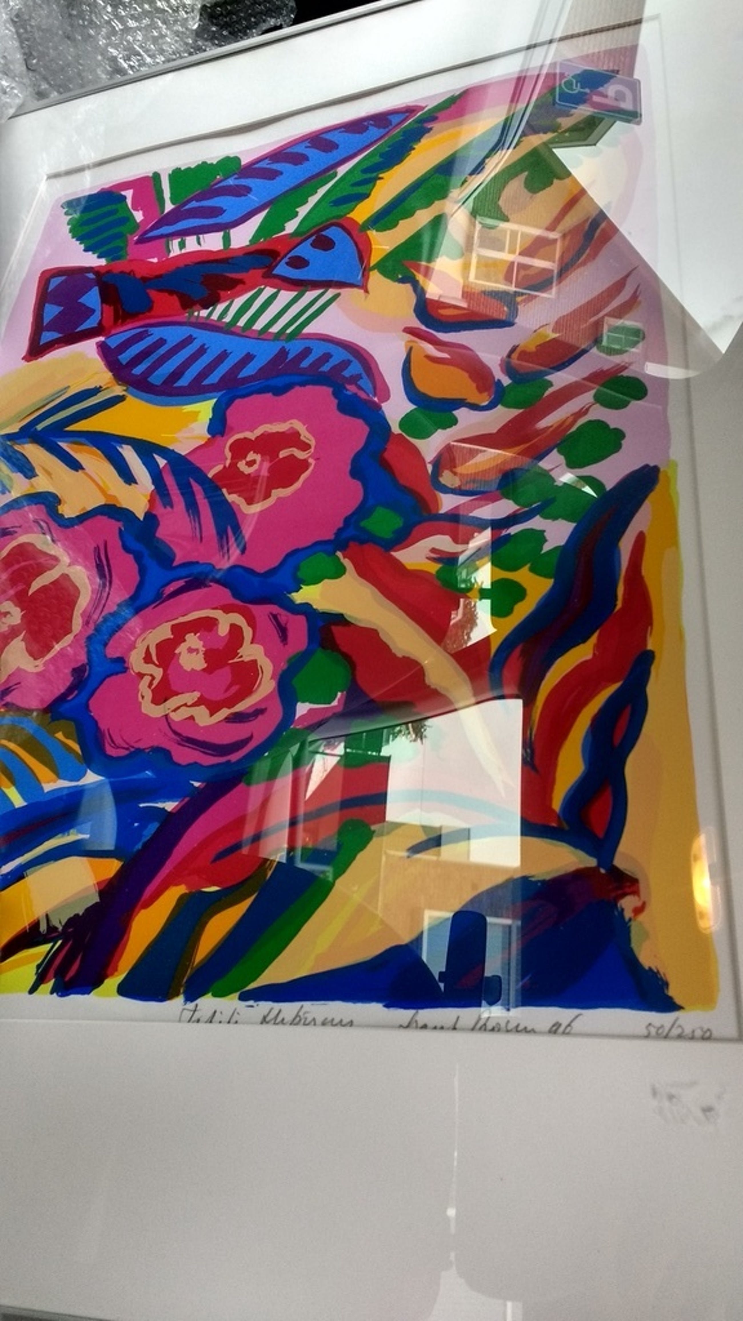 Groot kleurrijk werk in perfecte staat met aluminium lijst ca 85 x 65 cm.
