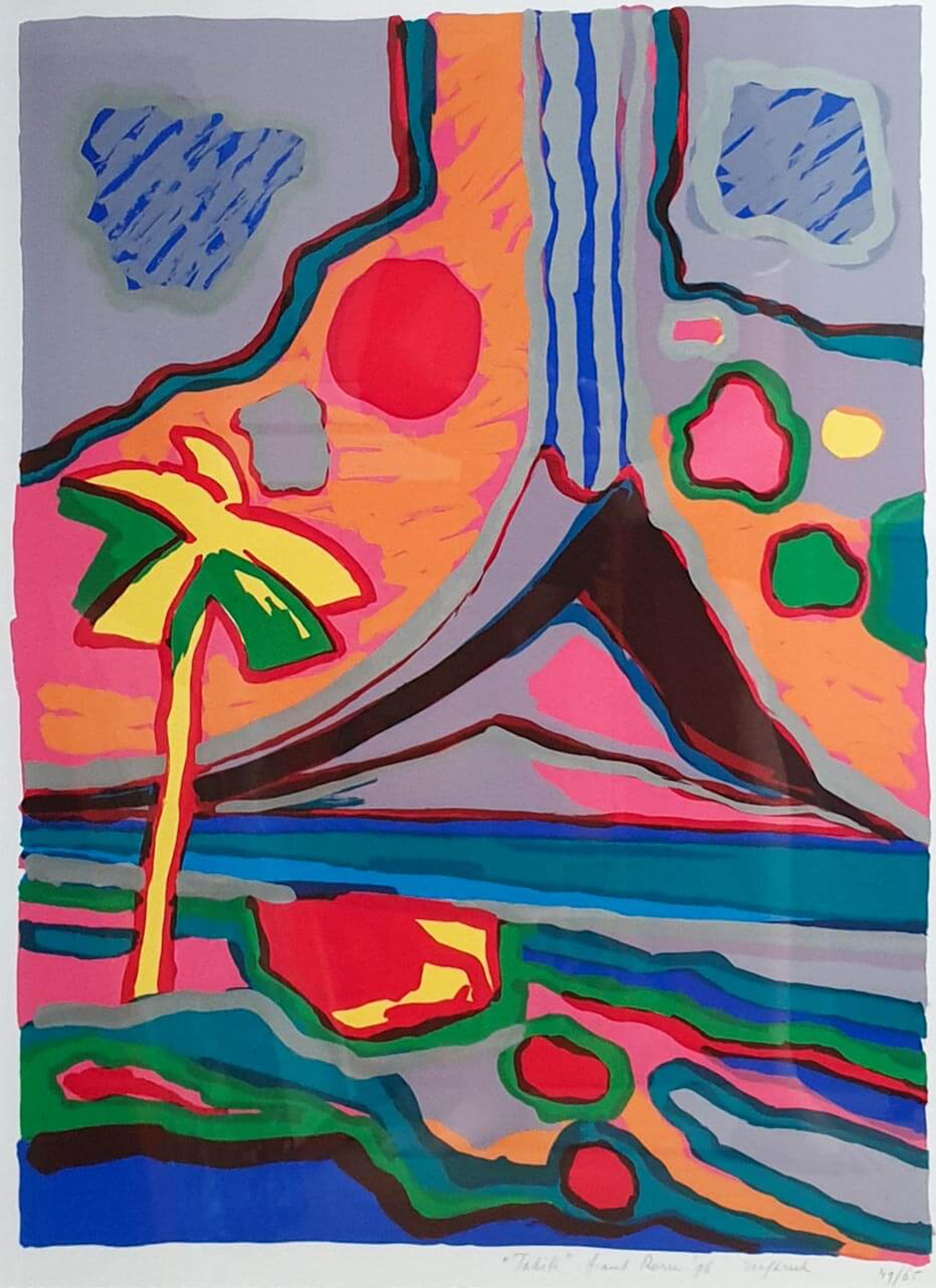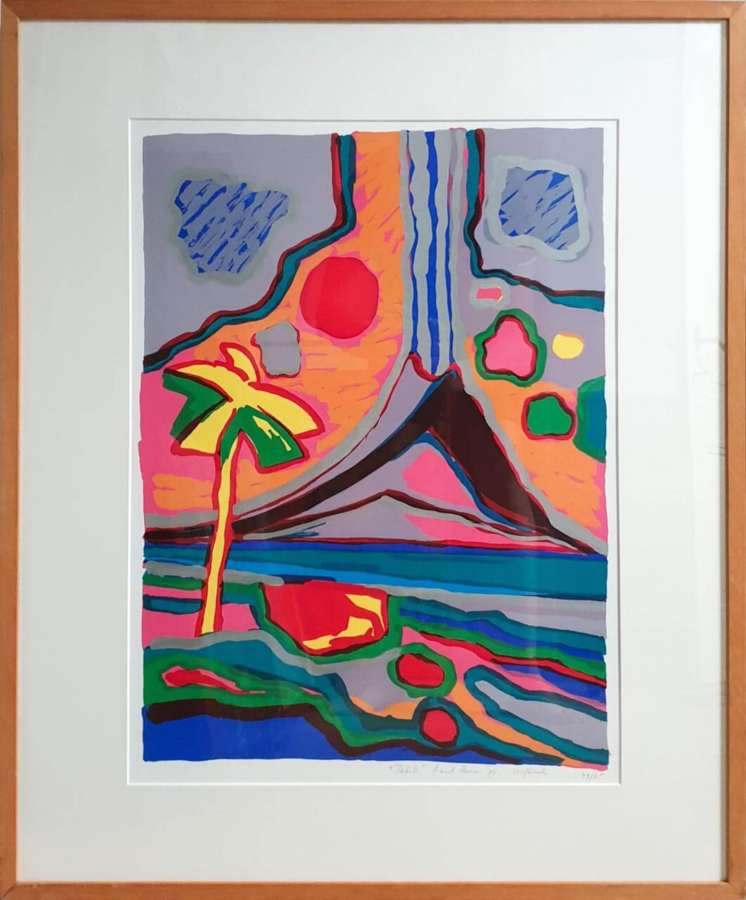 Zeer kleurrijk werk van Frank Rosen uit 1996. Professioneel ingelijst, de houten lijst heeft gebruikerssporen