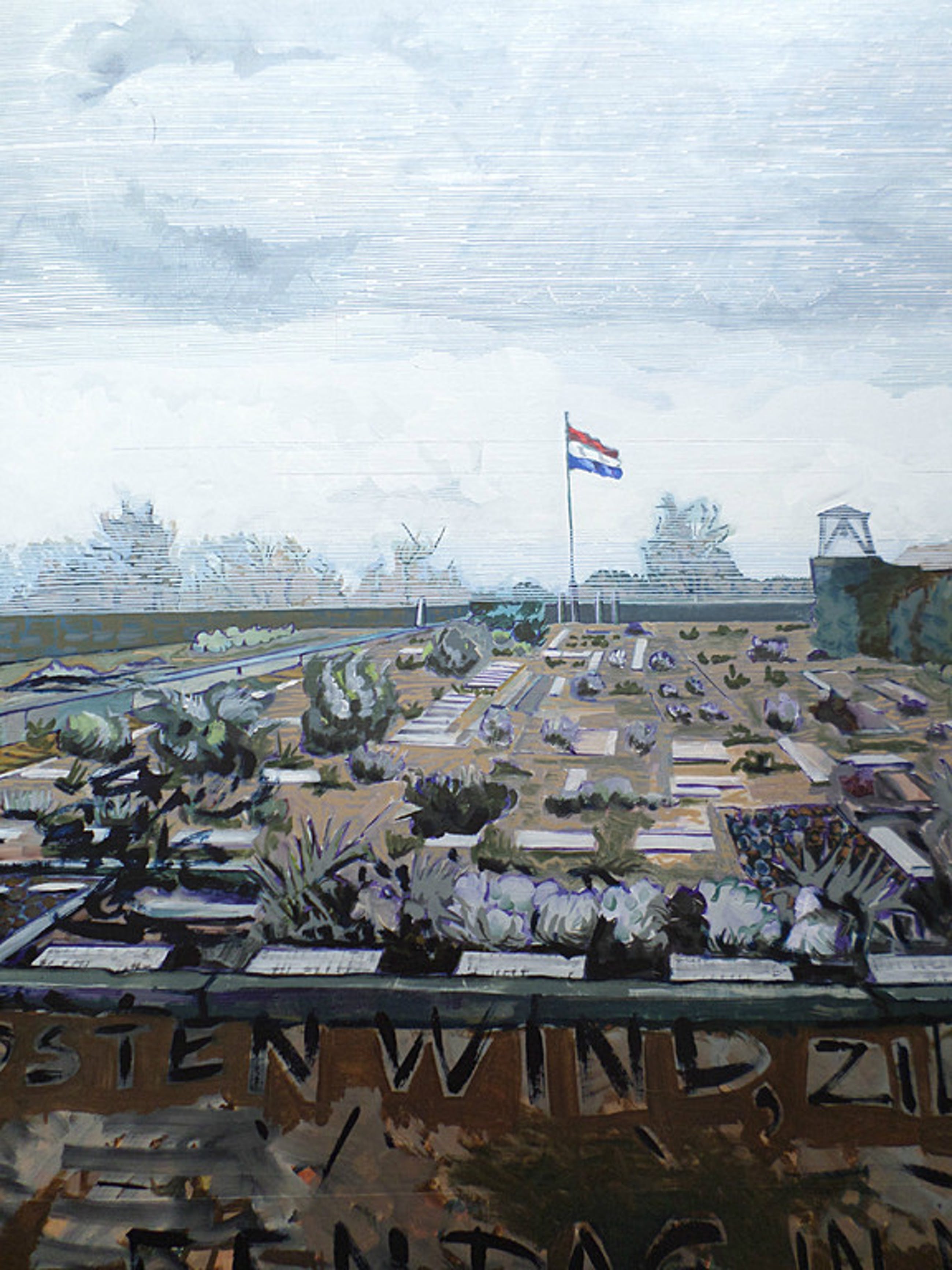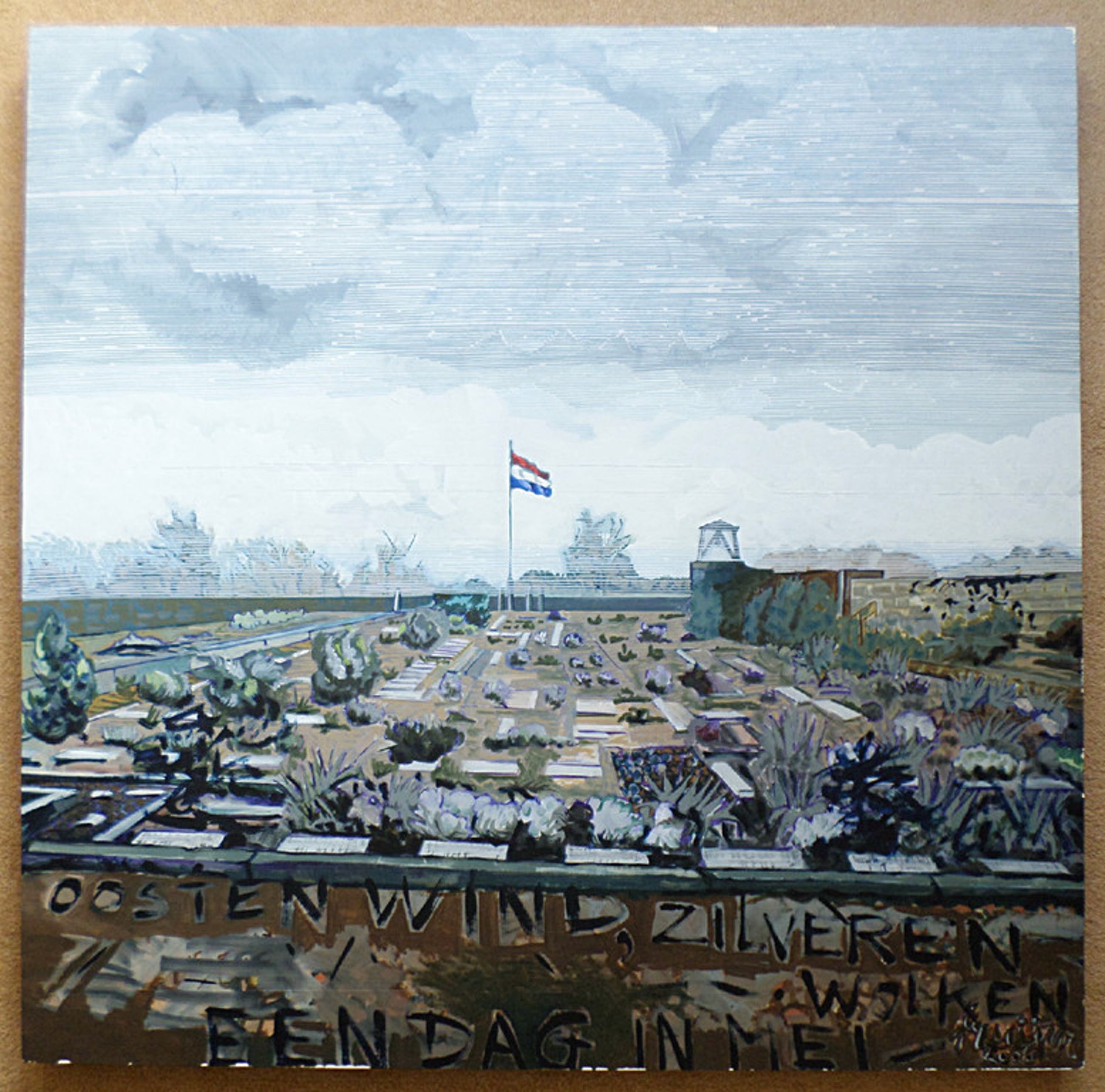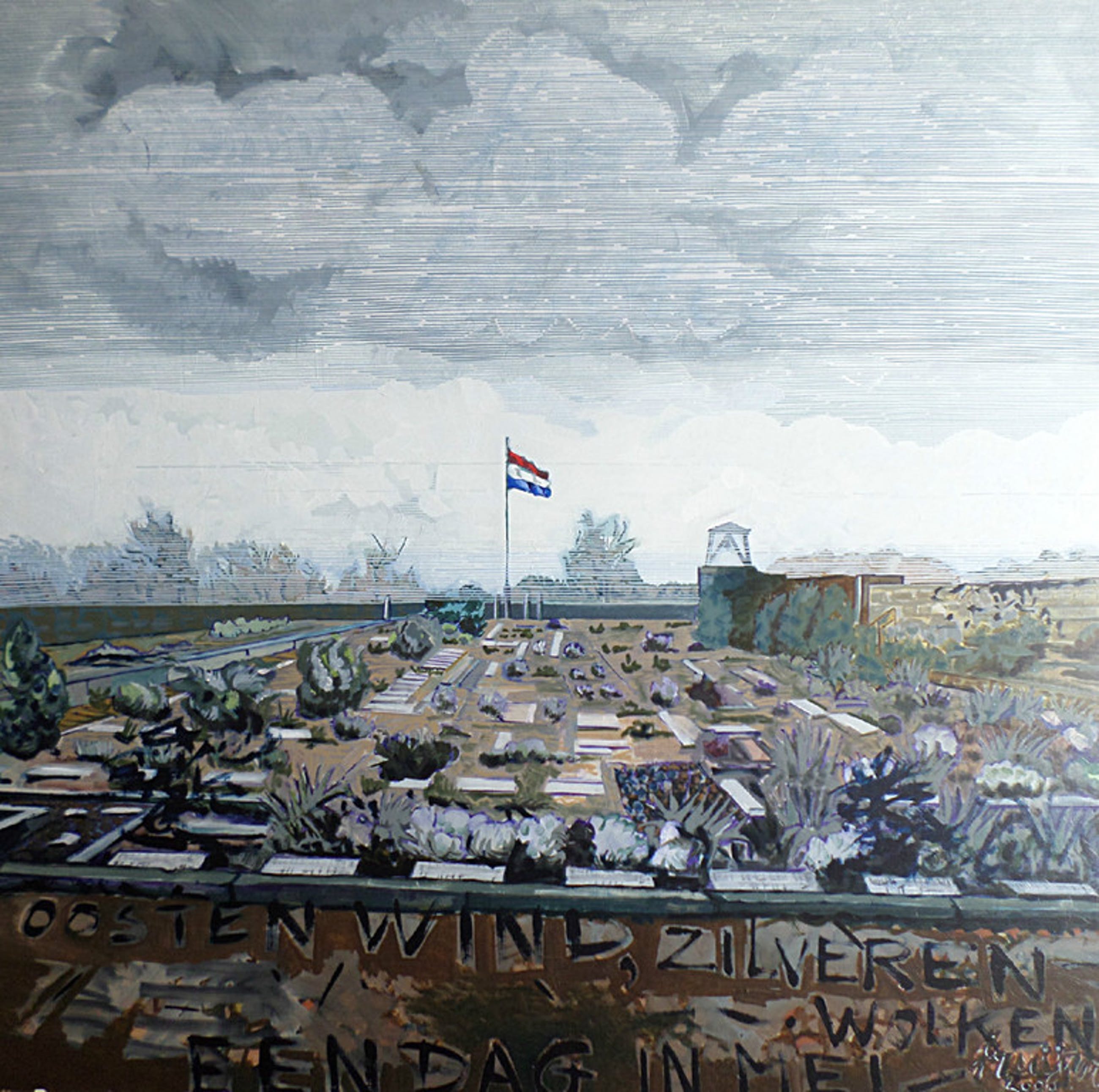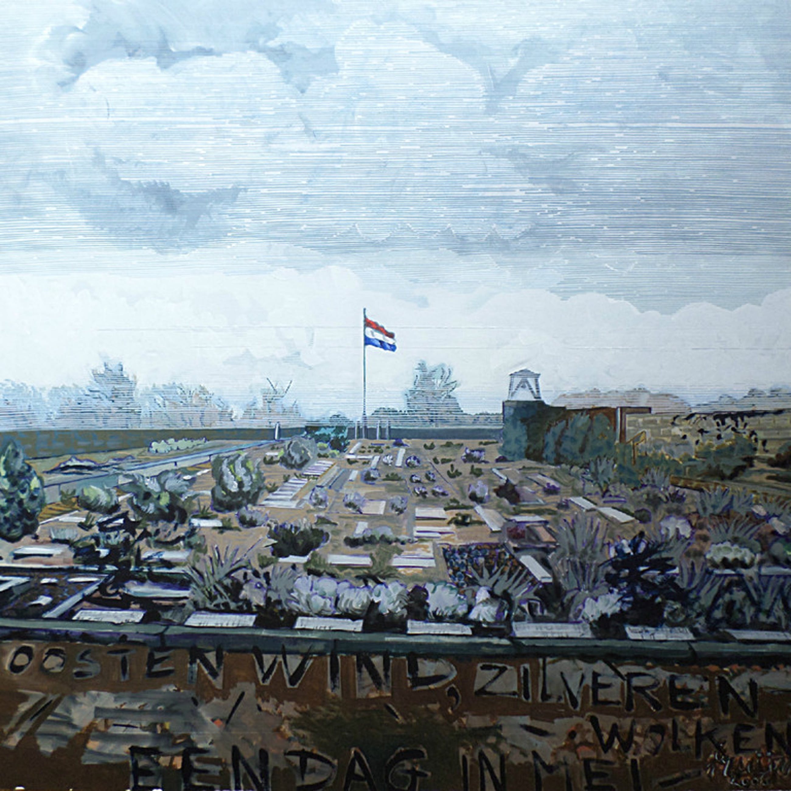 Zeer groot schilderij van Frank Ruijter uit 2006, voorstellende de nationale erebegraafplaats in Overveen (gemeente Bloemendaal) waar elk jaar op 4 mei de doden uit de Tweede Wereldoorlog worden herdacht en waar o.a. de verzetsstrijdster Hannie Schaft ligt begraven. Olieverf op paneel, zeer groot en sterk geconstrueerd, gesigneerd en gedateerd rechtsonder en gemonogrammeerd in verso. De conditie is zeer goed met uitzondering van wat missende schilfertjes aan de randen, vooral de onderkant (zie foto 3), maar die zijn goed te retoucheren.