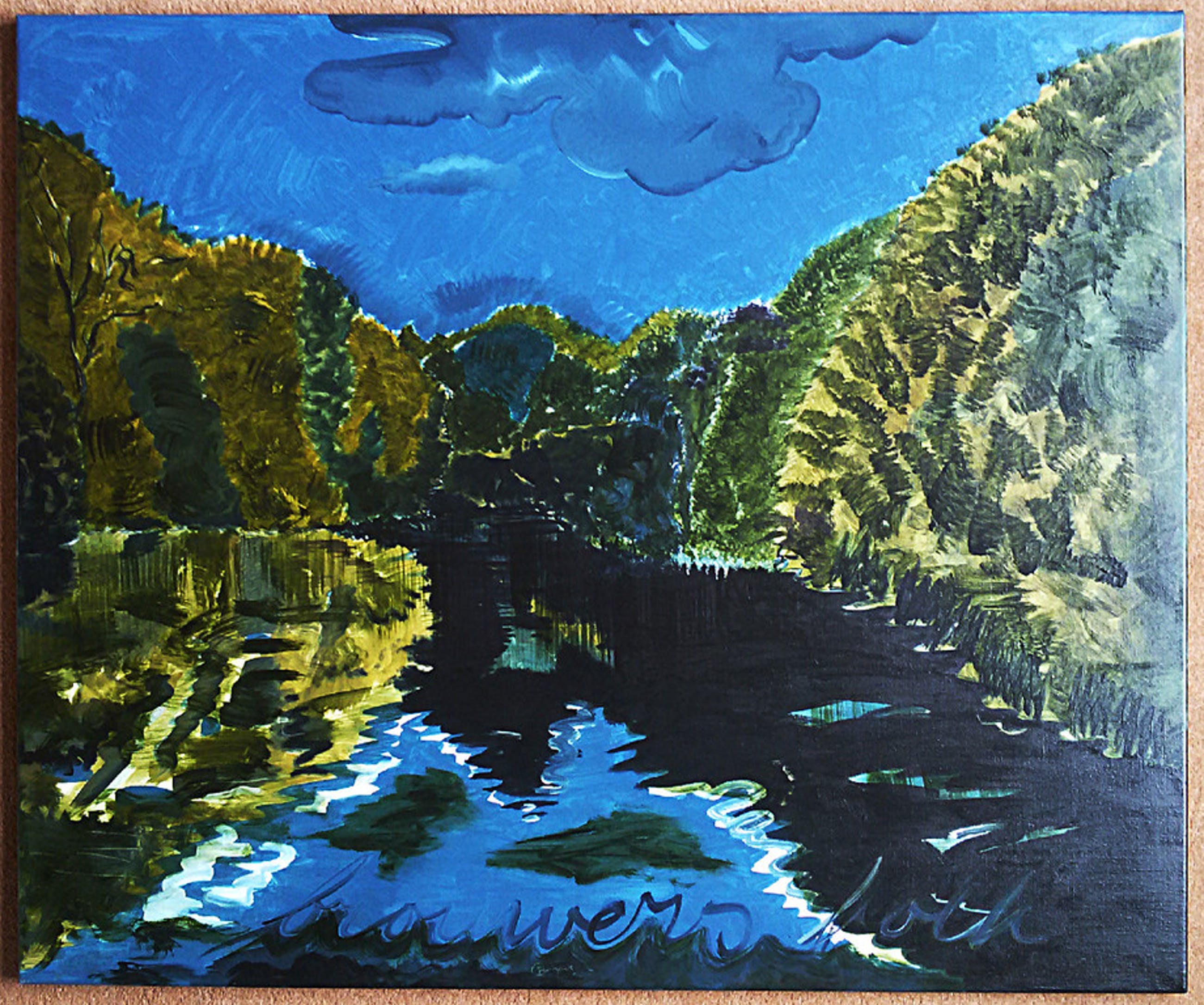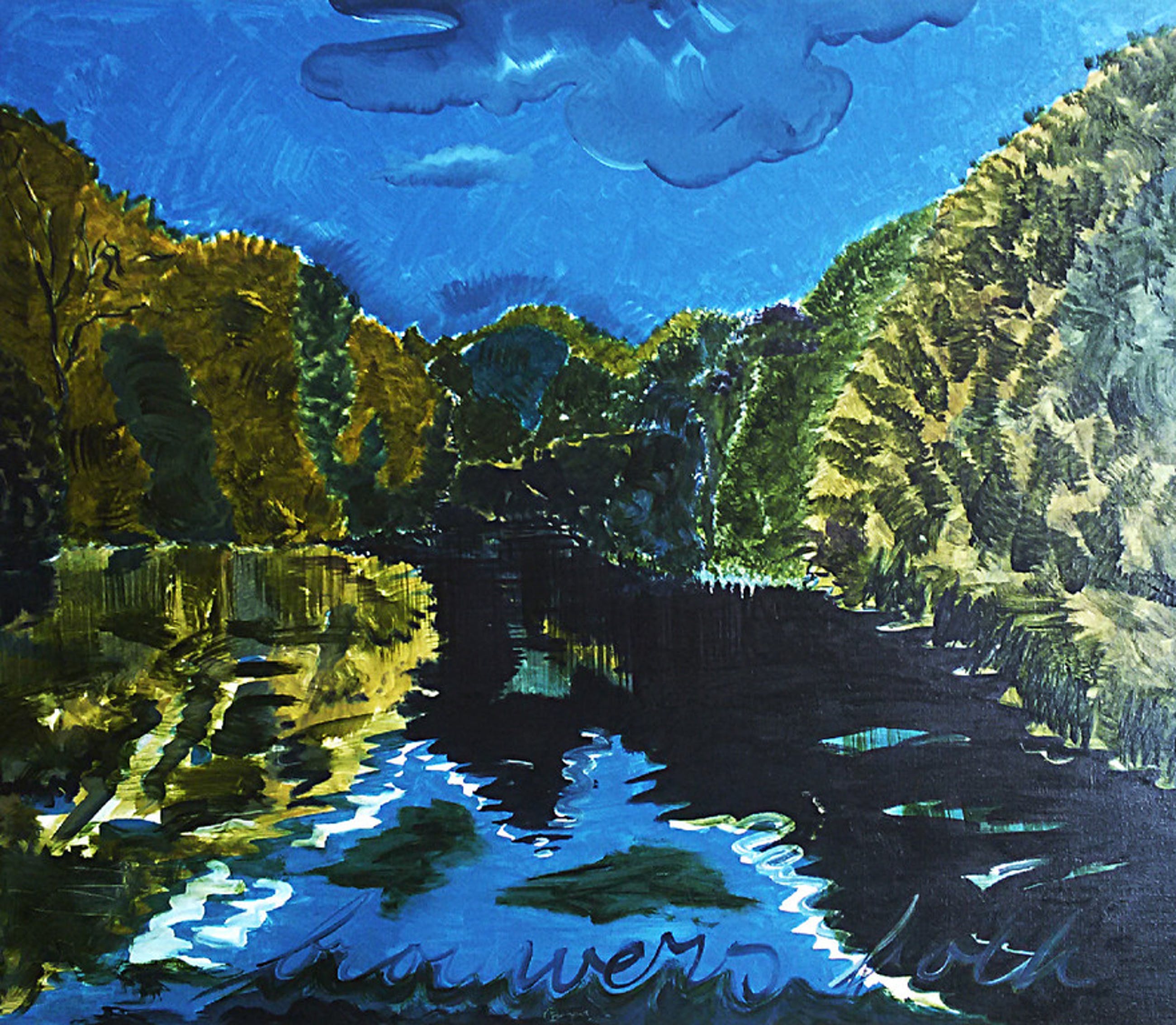 Zeer groot schilderij van Frank Ruijter uit 2000, voorstellende de Brouwerskolk in Overveen (gemeente Bloemendaal). Olieverf op doek, gespannen op zeer solide spieraam, gesigneerd midden onder en gemonogrammeerd en gedateerd in verso. Alles in uitstekende conditie.