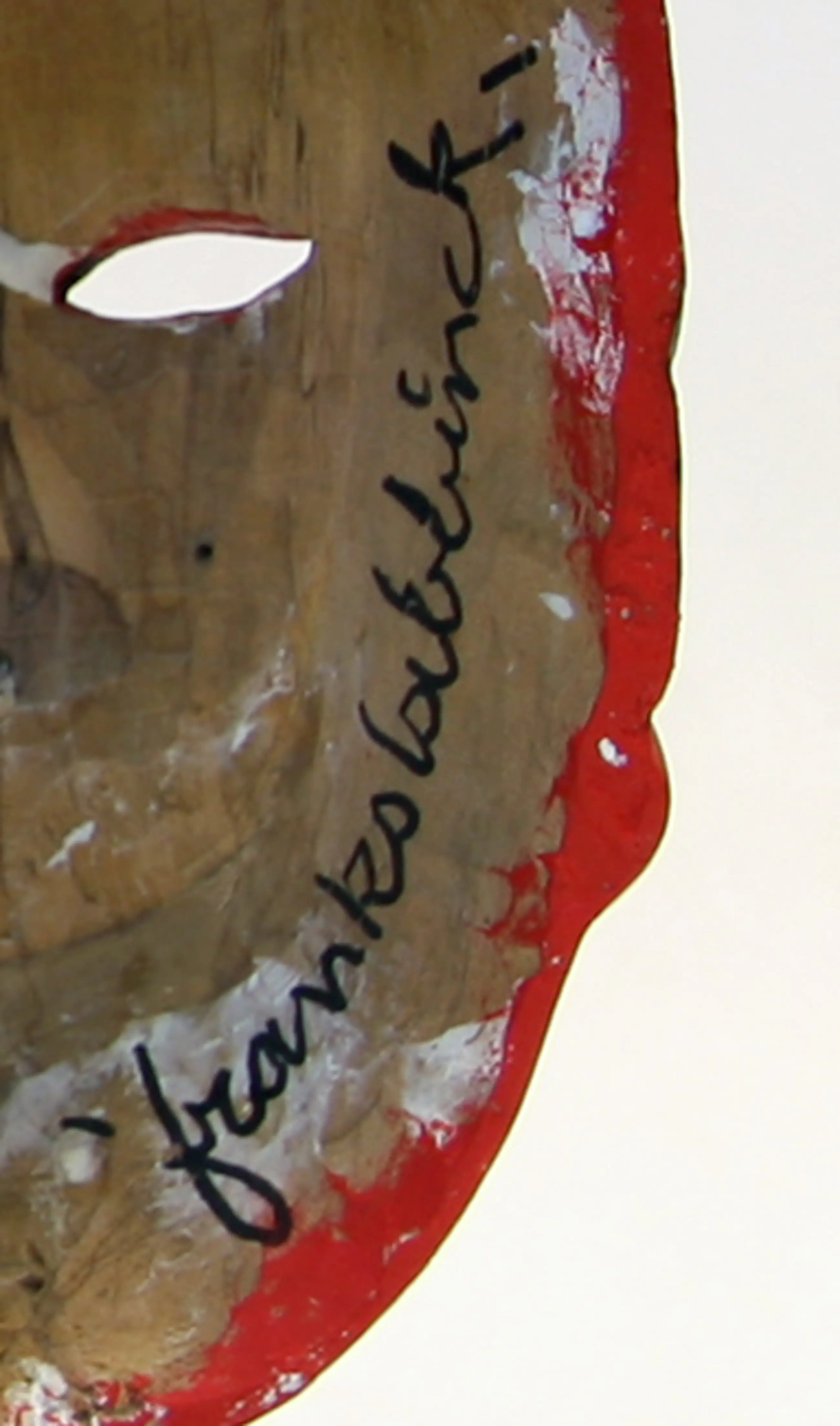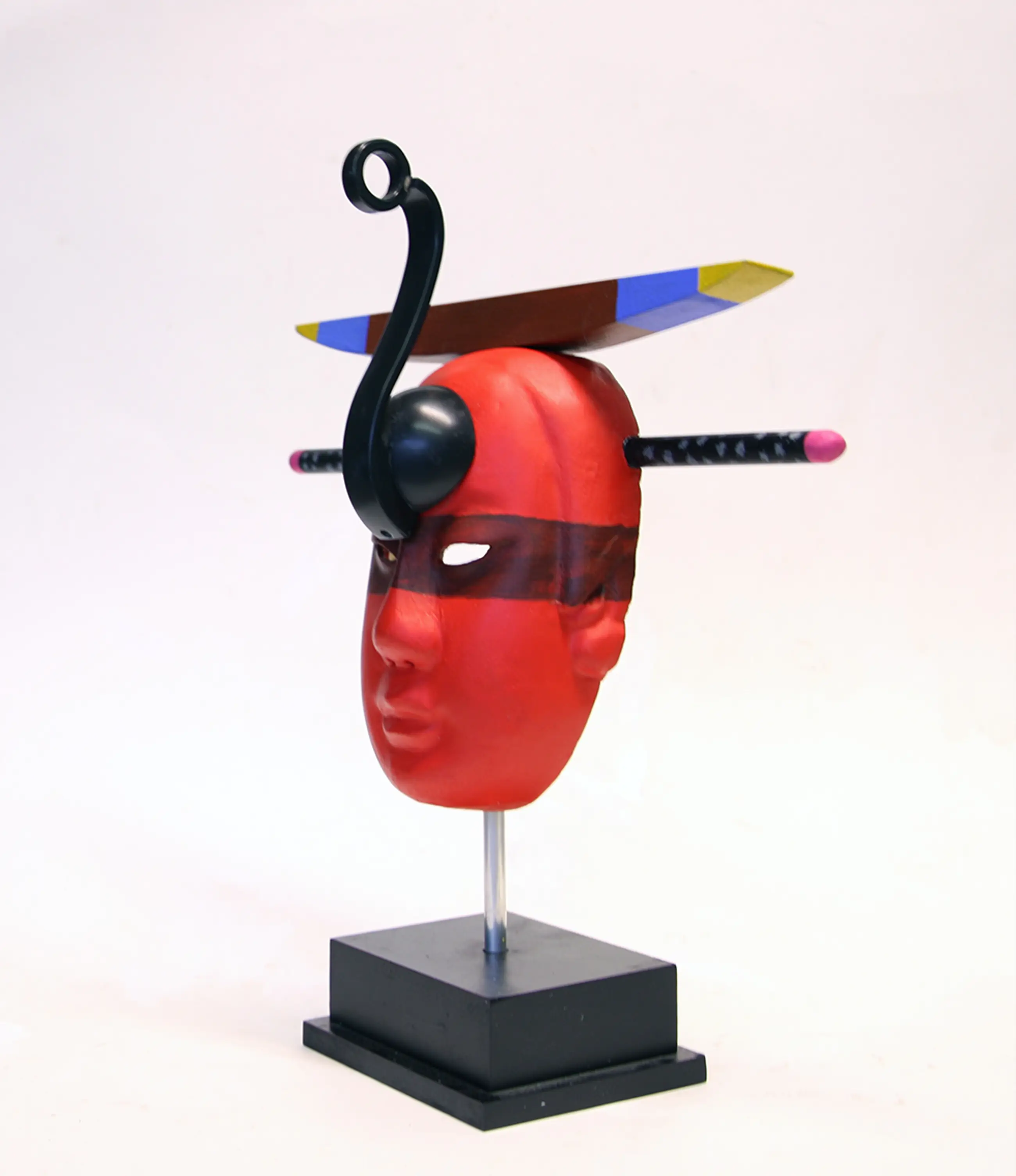 Origineel werk werk van Frank Slabbinck. Geinspireerd op Japans No masker Het voorhoofd stuk is een onderdeel van een waterkraan Gesigneerd. Hoogte 37cm breedte 30cm diepte 11cm Zonder de sokkel.