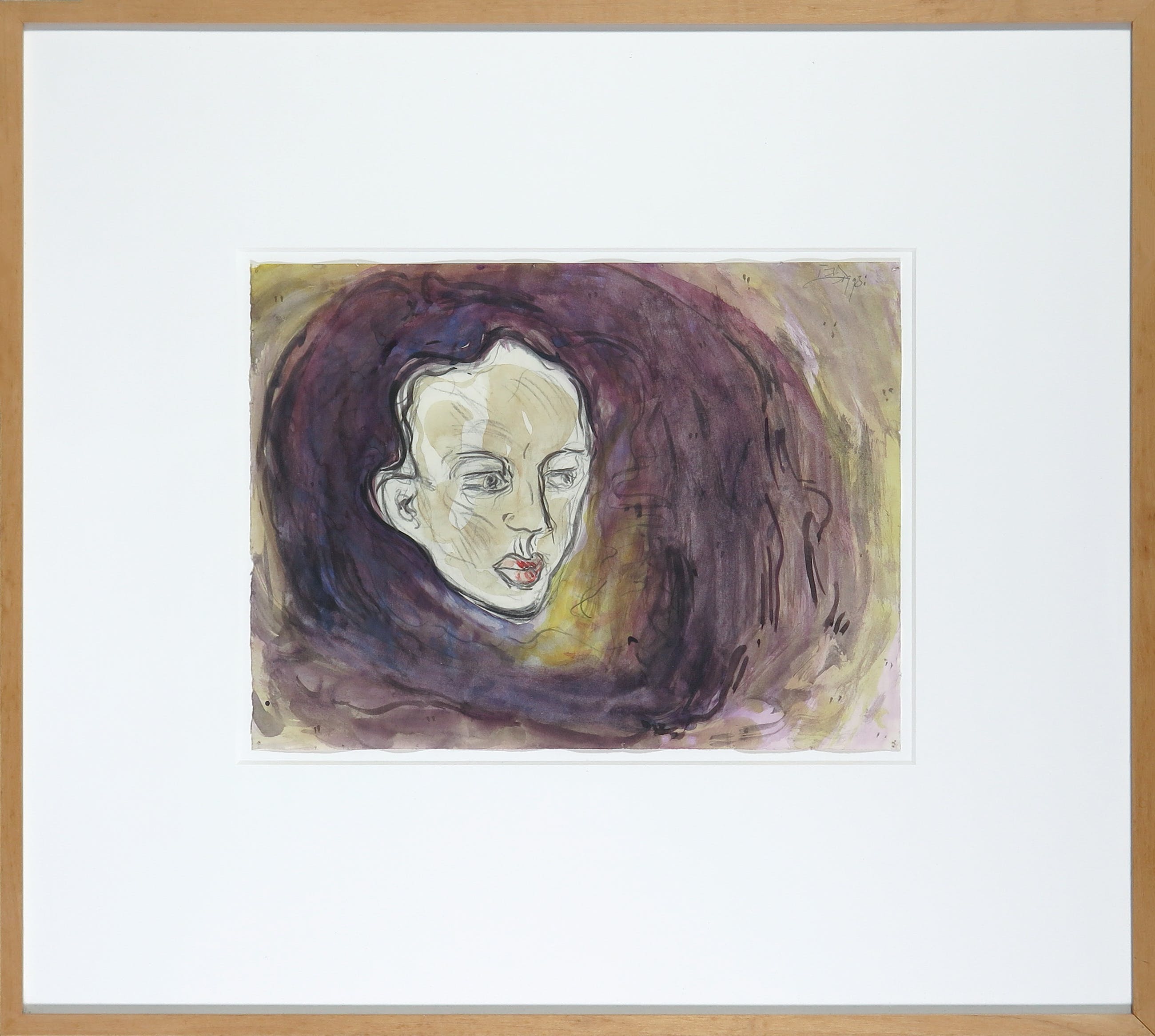 Portret in aquarel en potlood op papier, in paars- en bruintinten. Tot halverwege de jaren '80 ontbrak kleur in het werk van Van den Broeck, hij werkte toen voornamelijk met potlood, houtskool en Siberisch krijt. Uiteindelijk komt kleur in het werk, in teruggehouden tinten.