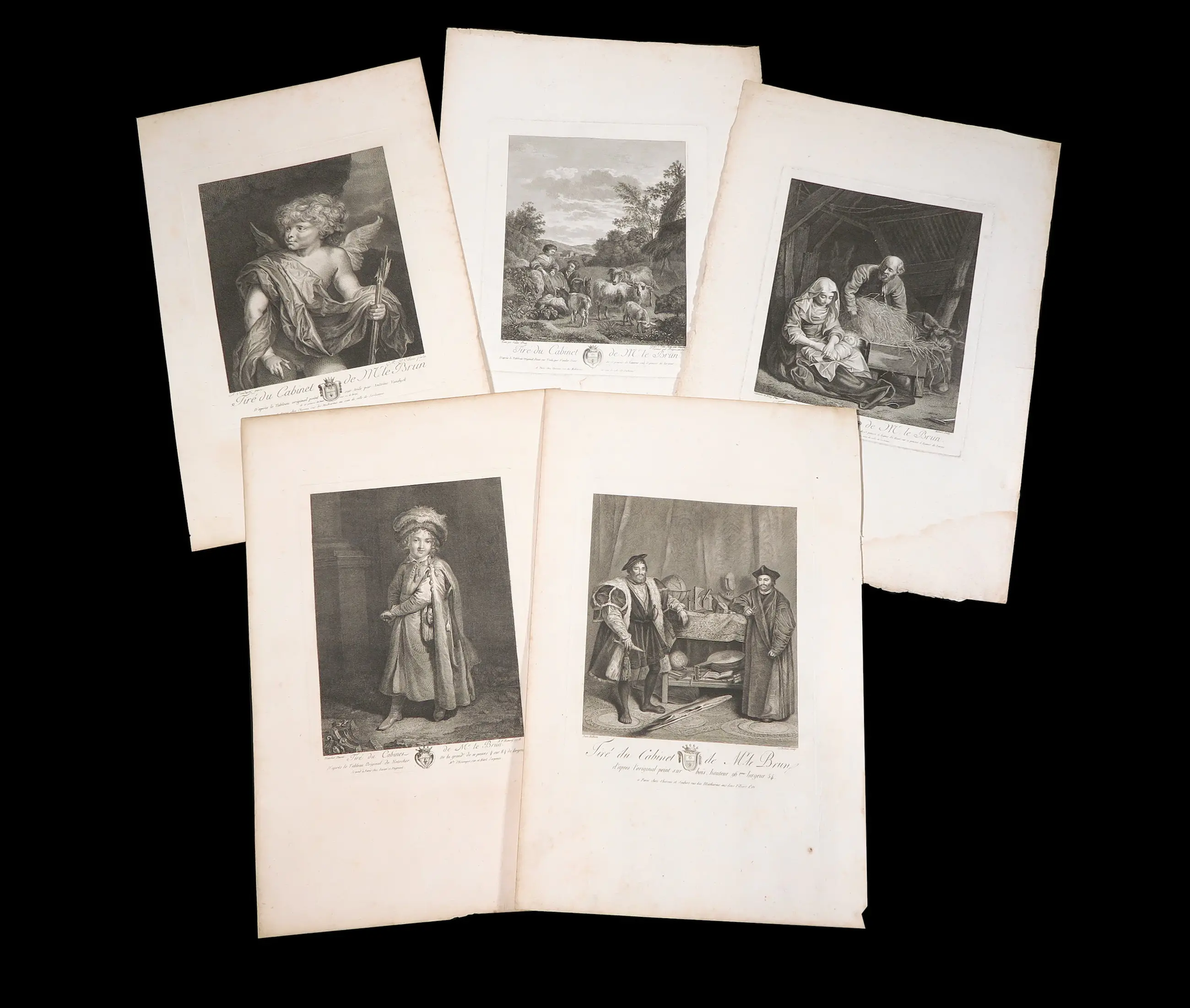 | Goede staat, gezien de leeftijd. Eén werk heeft wel enige vochtschade, maar dit zit onderaan het papier en loopt niet over in de voorstelling. Tevens foxing op alle prenten en lichte beschadigingen aan de randen en hoeken van de bladen. | |||||||||||