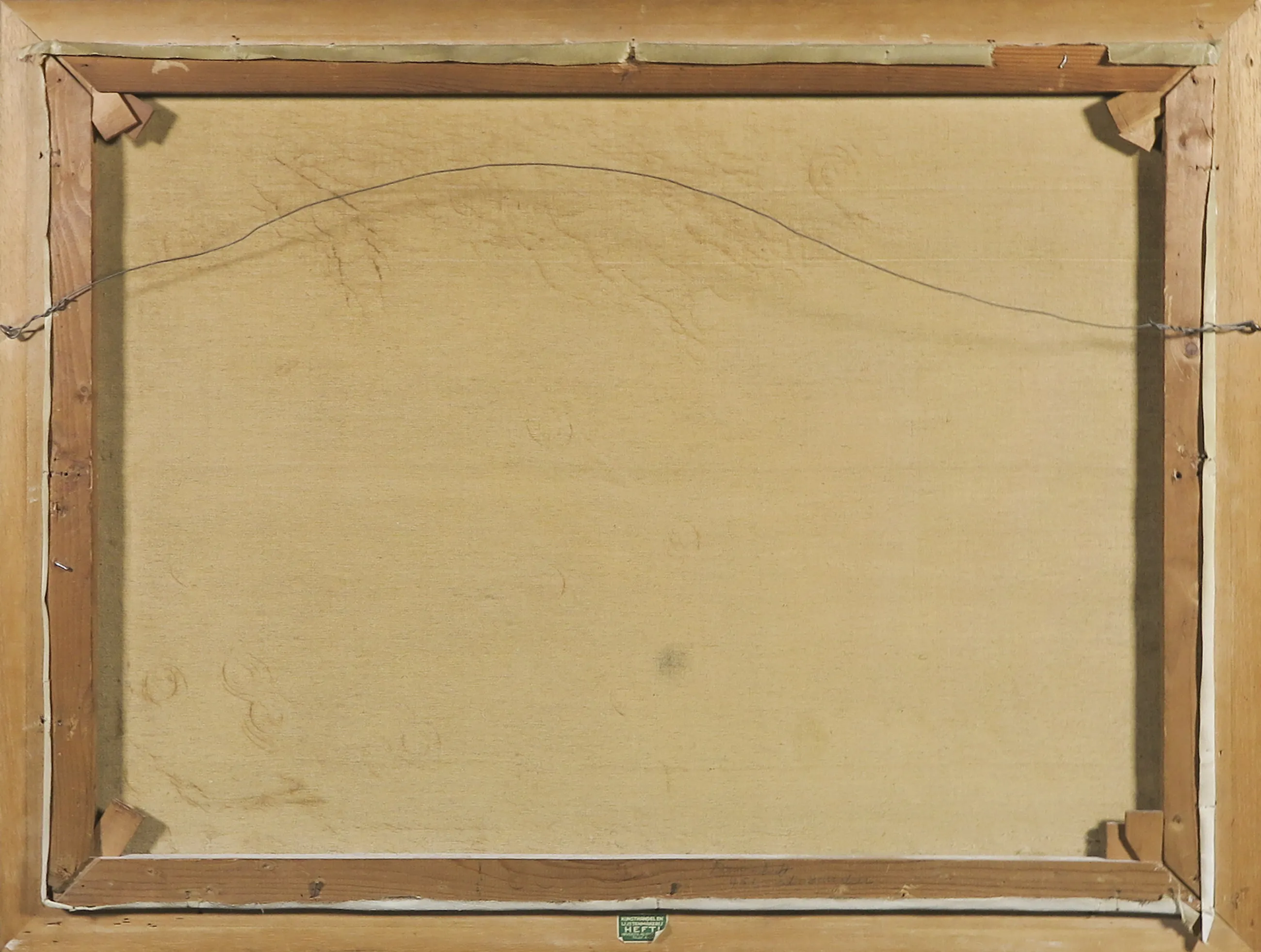 | Wat craquelevorming in de luchtpartij (zonder verfverlies) en ongelijkmatige spanning in de hoekjes. Verder in goede staat. | |