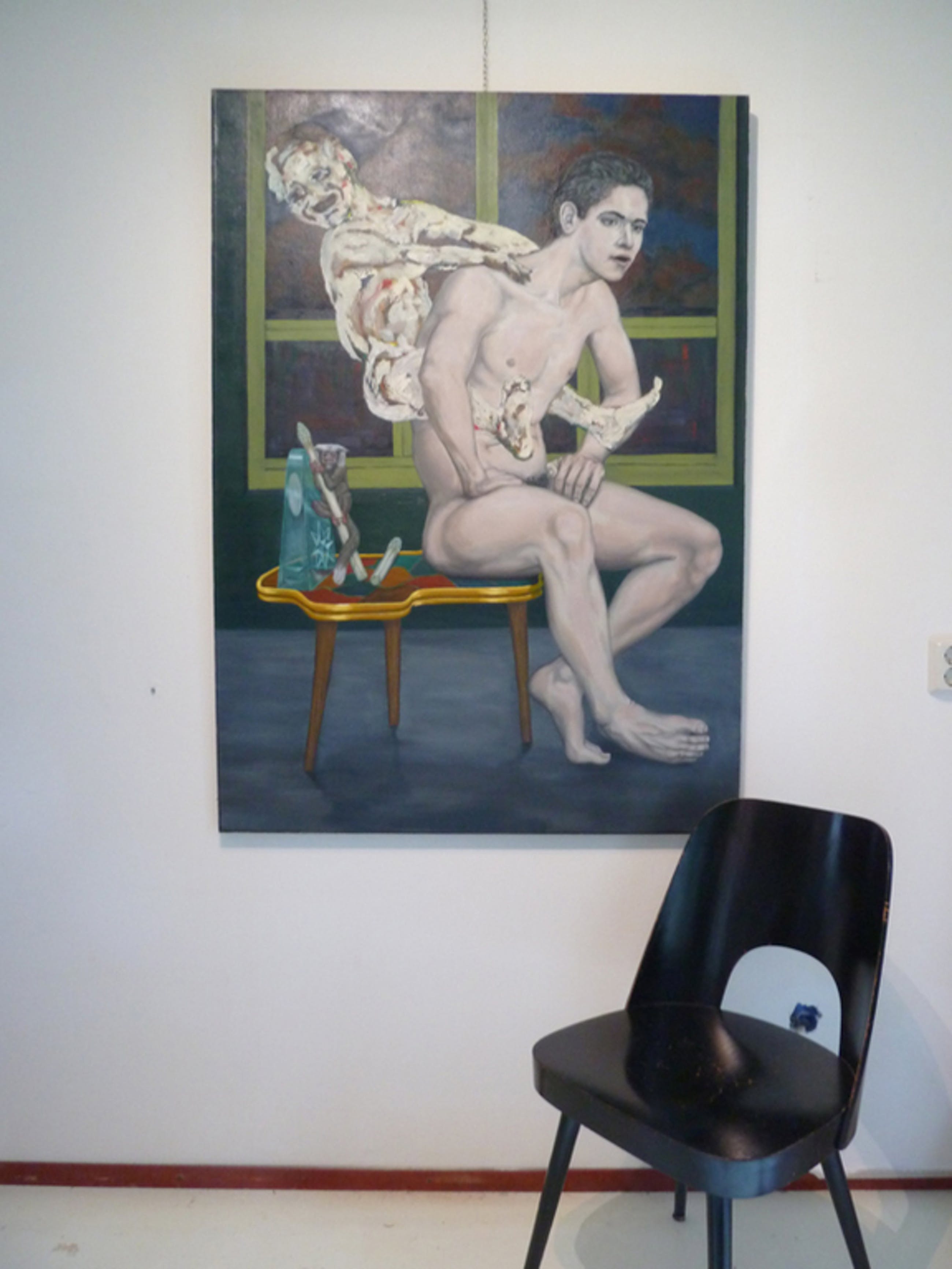 Deze eigenzinnige projectie van Frans Bosch heeft een fascinerende spanning. De als portret tegen een neutrale achtergrond neergezette jonge man, is realistisch geschilderd. Anatomisch correct, en door het ontbreken van kleding ook ontdaan van elke maatschappelijke referentie. Met op zijn rug, als in een ‘kinderzit’ een vreemd fantasiewezen, i.t.t. de verdere gladde penseelstreek, sterk pasteus opgezet. En dan de toevoeging van een scene met een aapje klimmend in een asperge, leunend tegen een onduidbaar transparant object, lijkt de puzzel alleen maar complexer te maken.