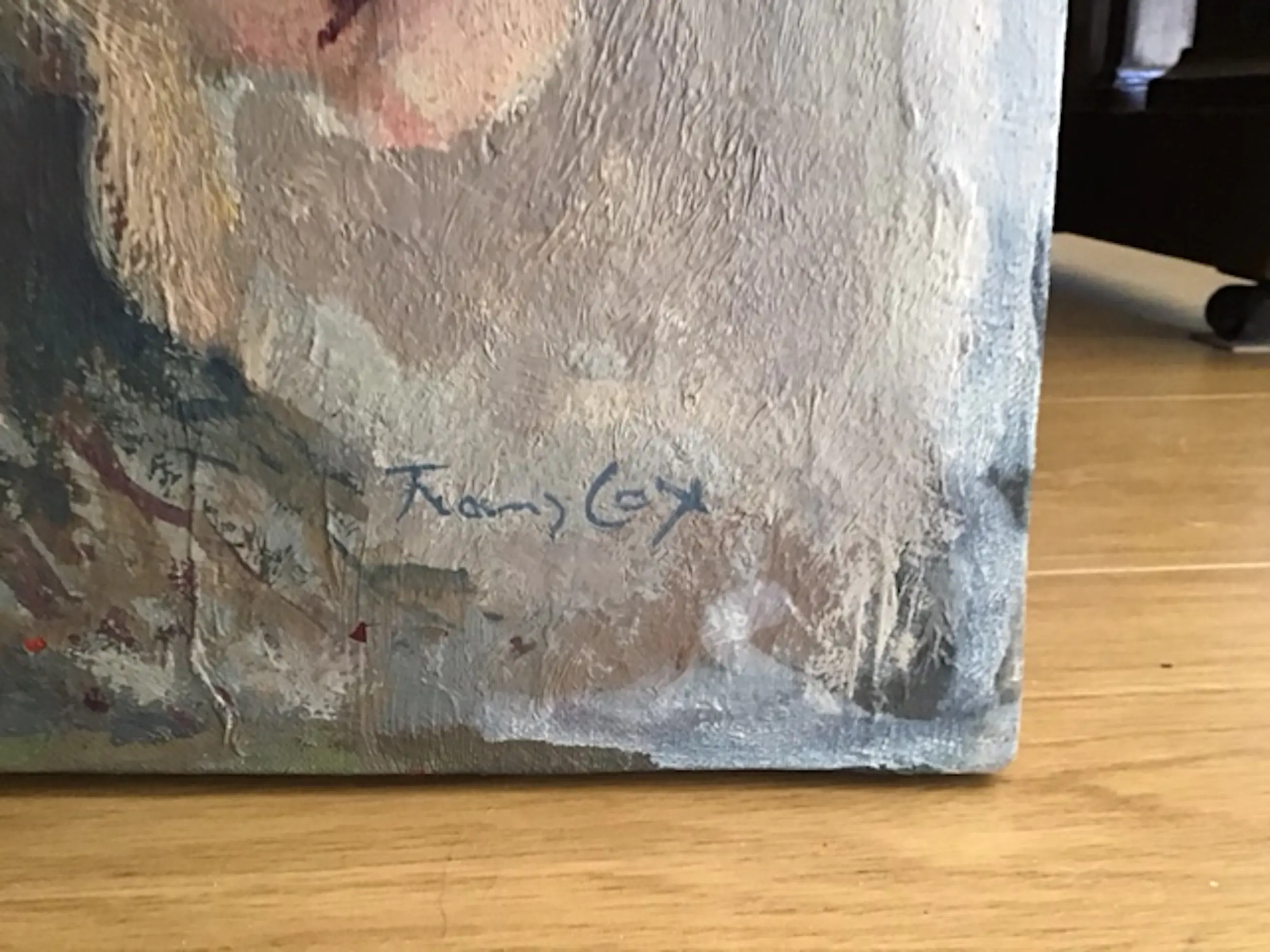 Het is een oud werk en daarmee het doek broos en de verf ook. Er zit een op maat gemaakte lijst bij die helaas los is gaan zitten maar wel in redelijke staat. Ik weet niet of het authentiek is, lijkt wel zo maar het werk is nooit getaxeerd. Het werk is aangekocht door mijn grootvader. Deze woonde in Swalmen en de kunstenaar woonde in Roermond.