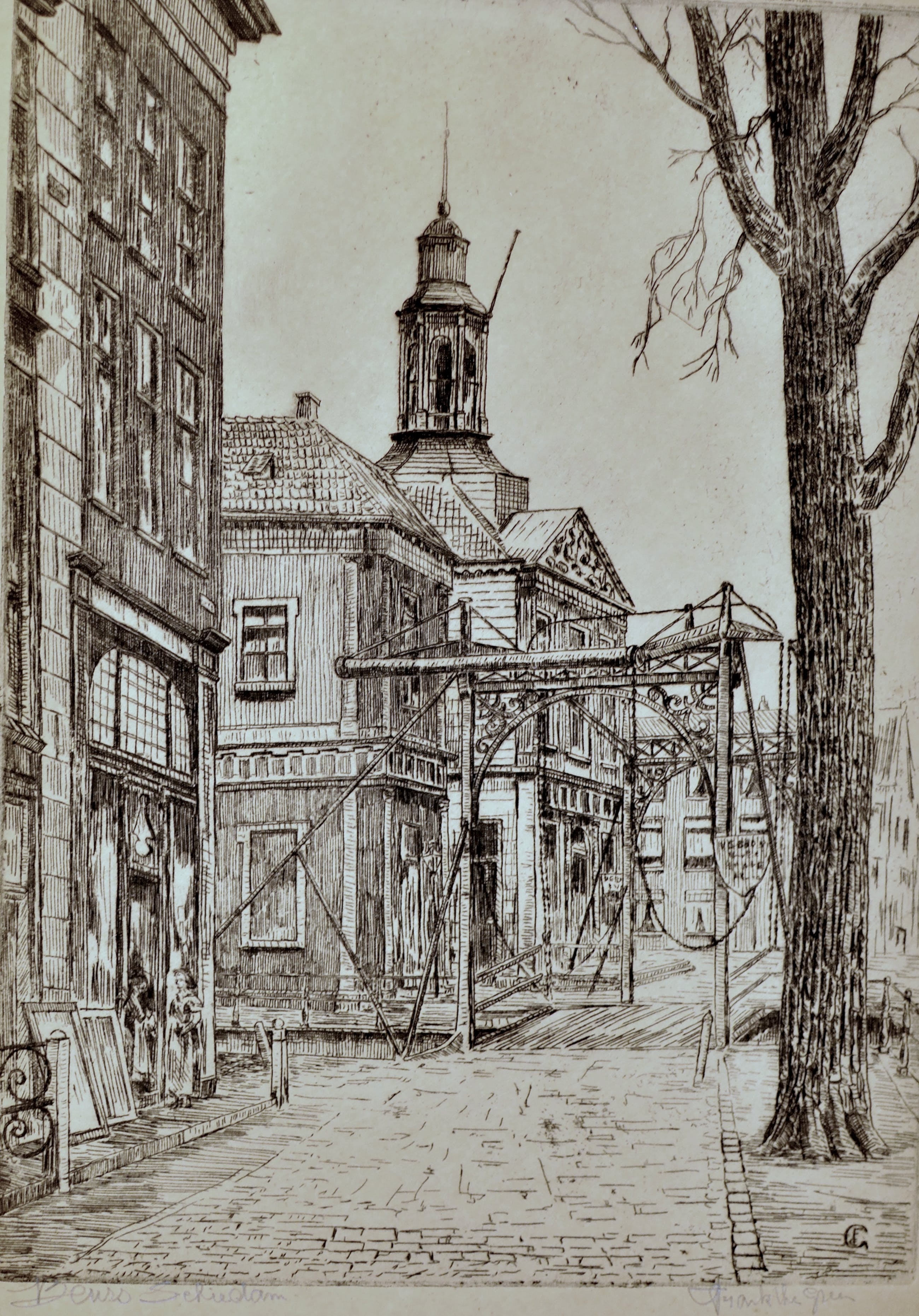 Die ets geeft de brug weer over het Delftse Vaart Verlaat in het vooroorlogse Rotterdam. Dit deel van het centrum van Rotterdam is tijdens het bombardement in 1940 vrijwel volledig verwoest.
