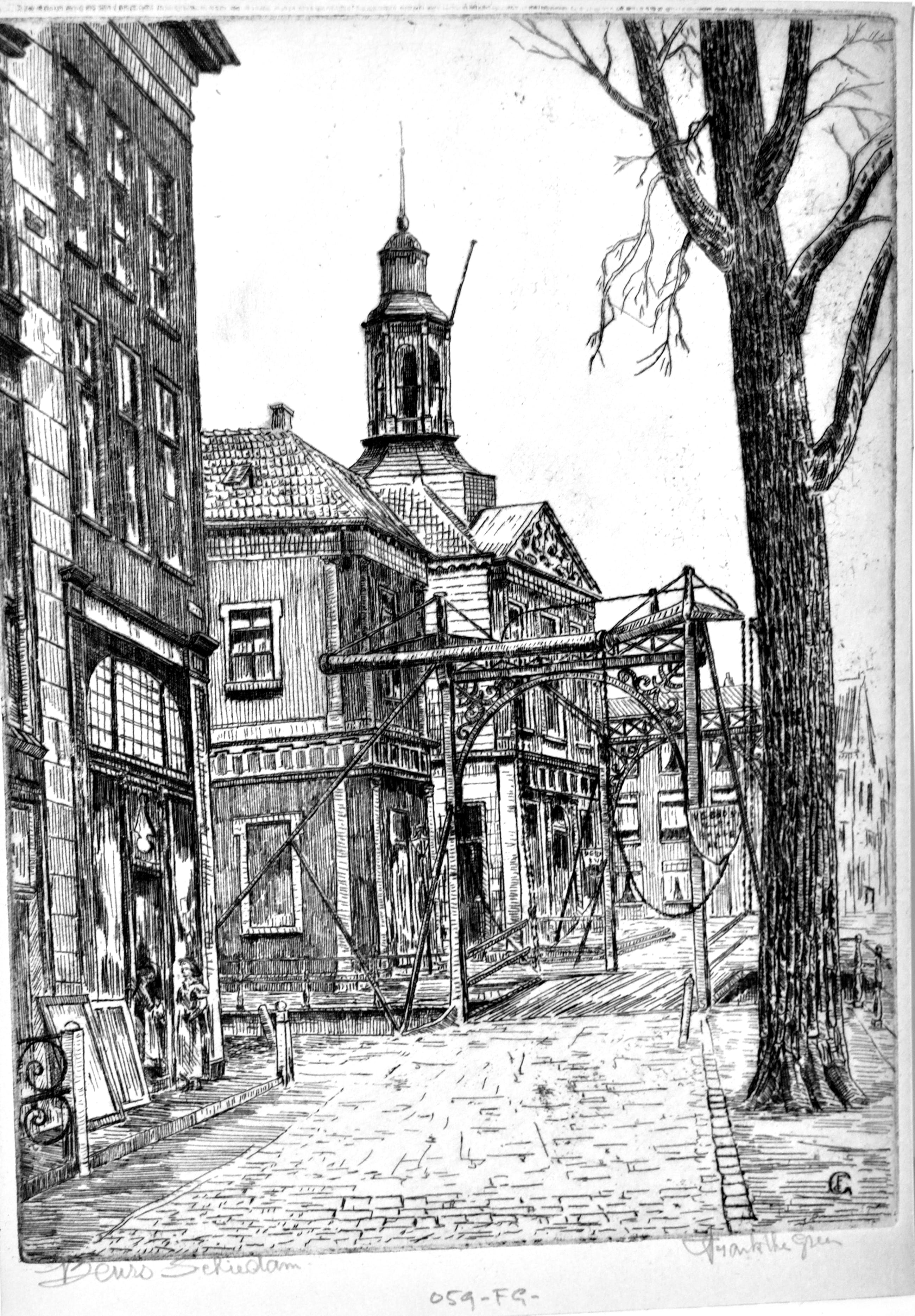 Het afgebeelde werk is een ets uit de collectie van "Rijnmond Toen" onder nr. 059-FG. De ets is geannoteerd "Beurs Schiedam", maar geeft exact dezelfde scene weer als ets nr. 079-FG.