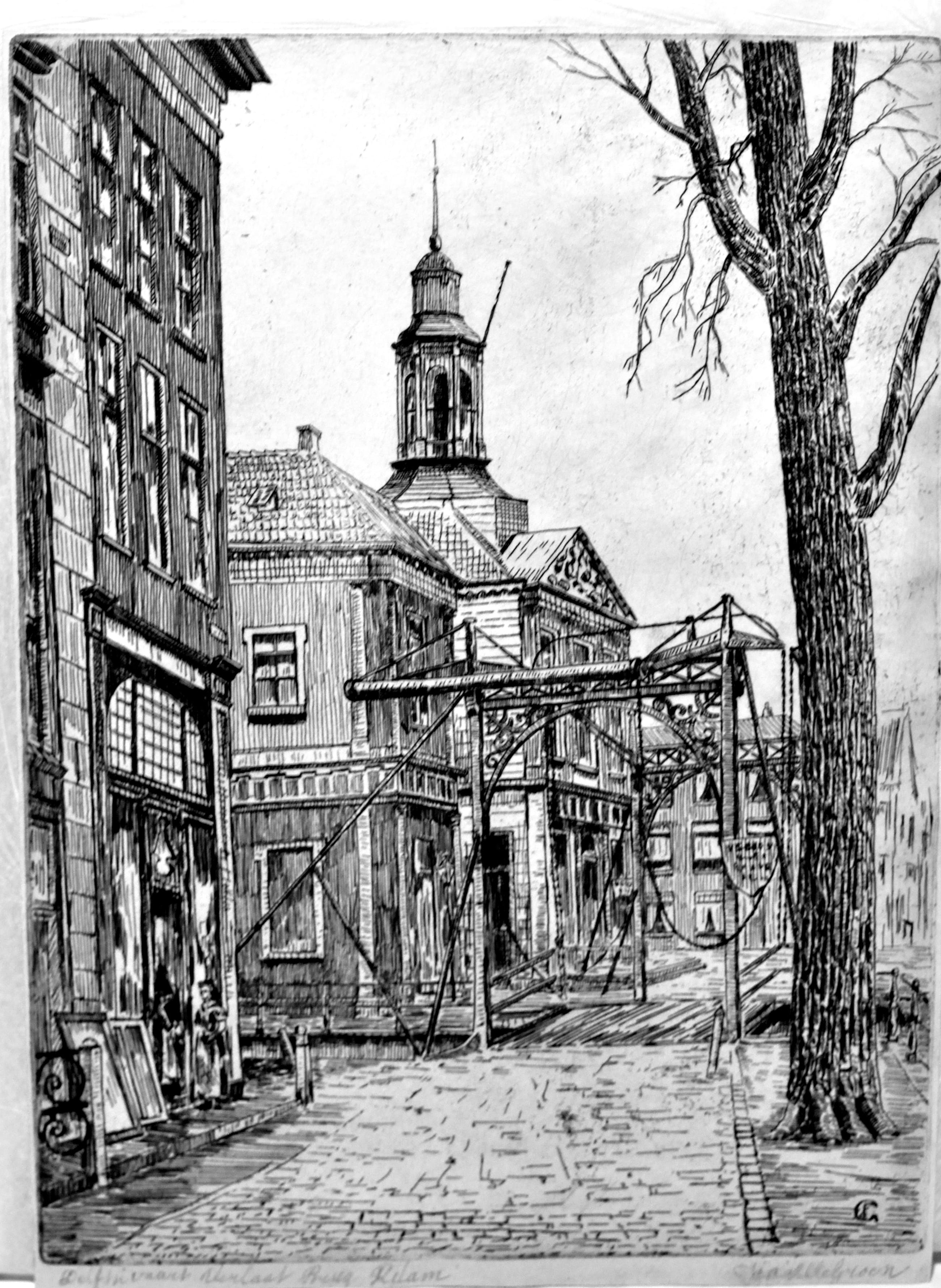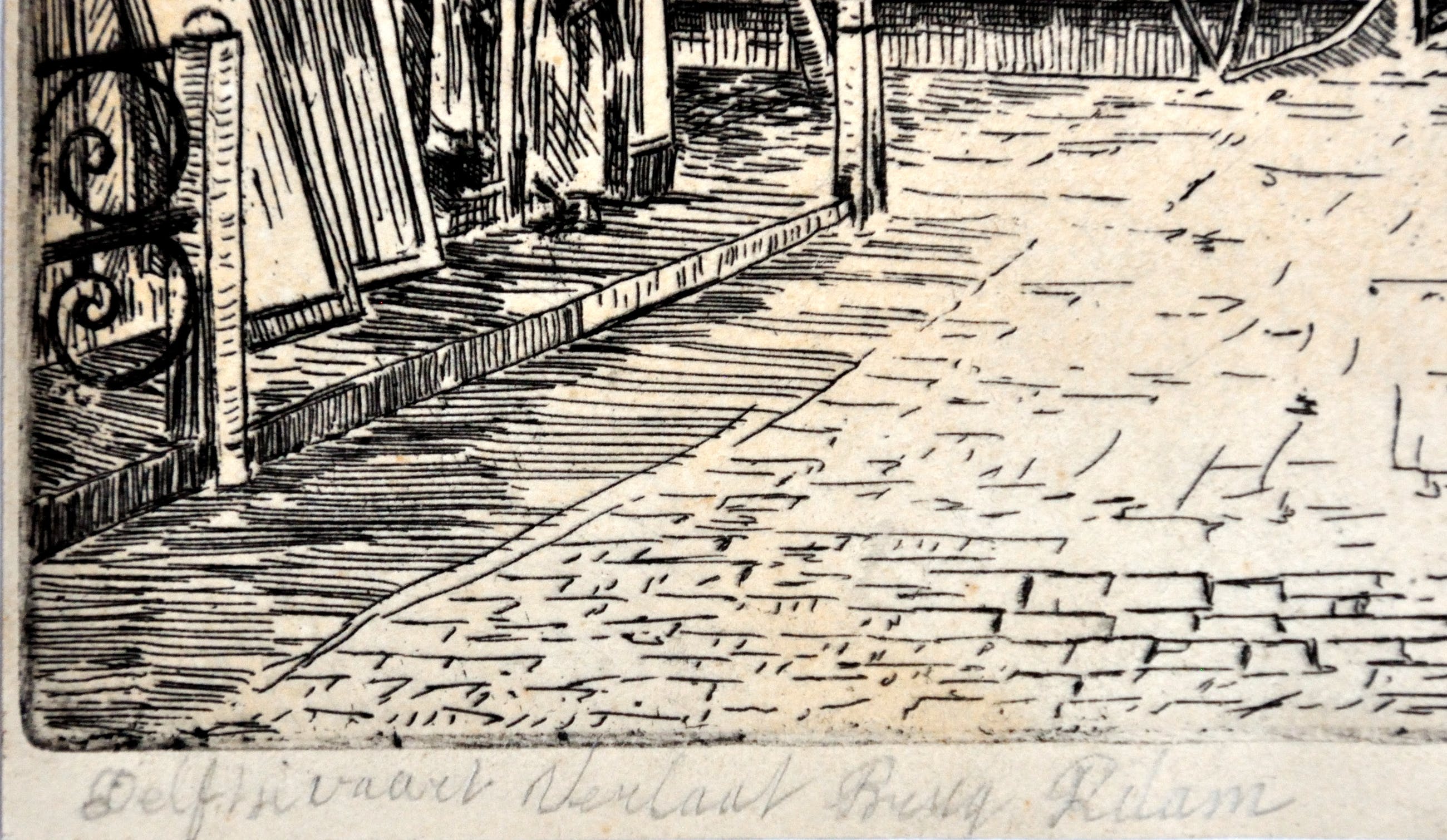 Het afgebeelde werk is een ets uit de collectie van "Rijnmond Toen" onder nr. 079-FG. De ets geeft de brug weer over het Delftse Vaart Verlaat in het vooroorlogse Rotterdam. Dit deel van het centrum van Rotterdam is tijdens het bombardement in 1940 vrijwel volledig verwoest.