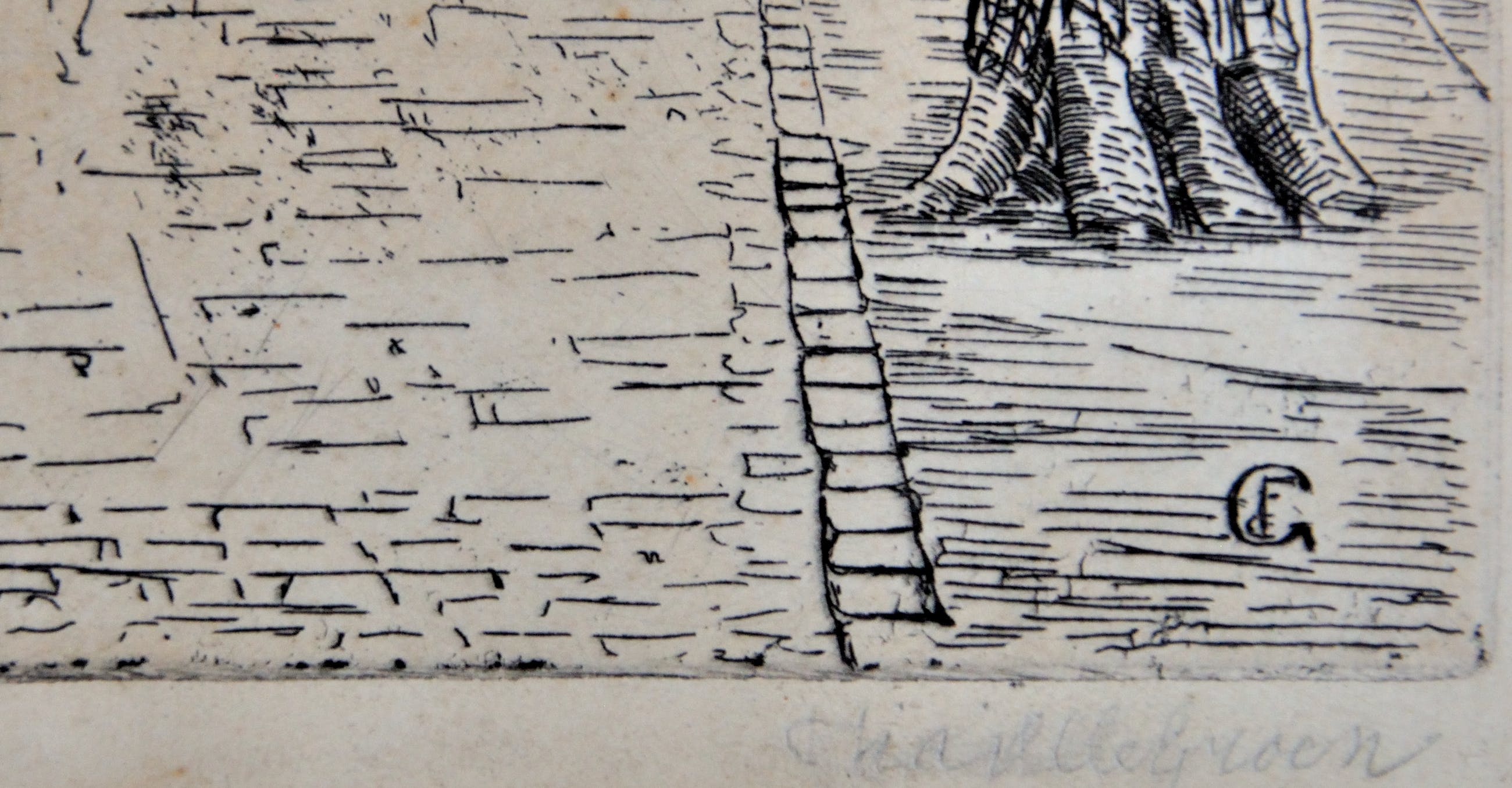 | De ets is in prima staat. Het papier is onbeschadigd, maar de ets heeft smalle marges. De ets is gemonteerd in een nieuw (uiteraard) zuurvrij Artique passe-partout. | |||