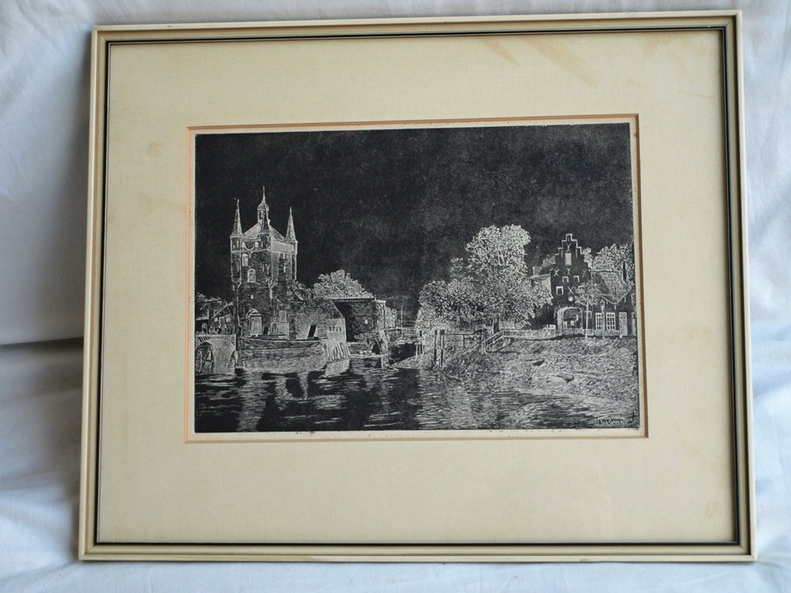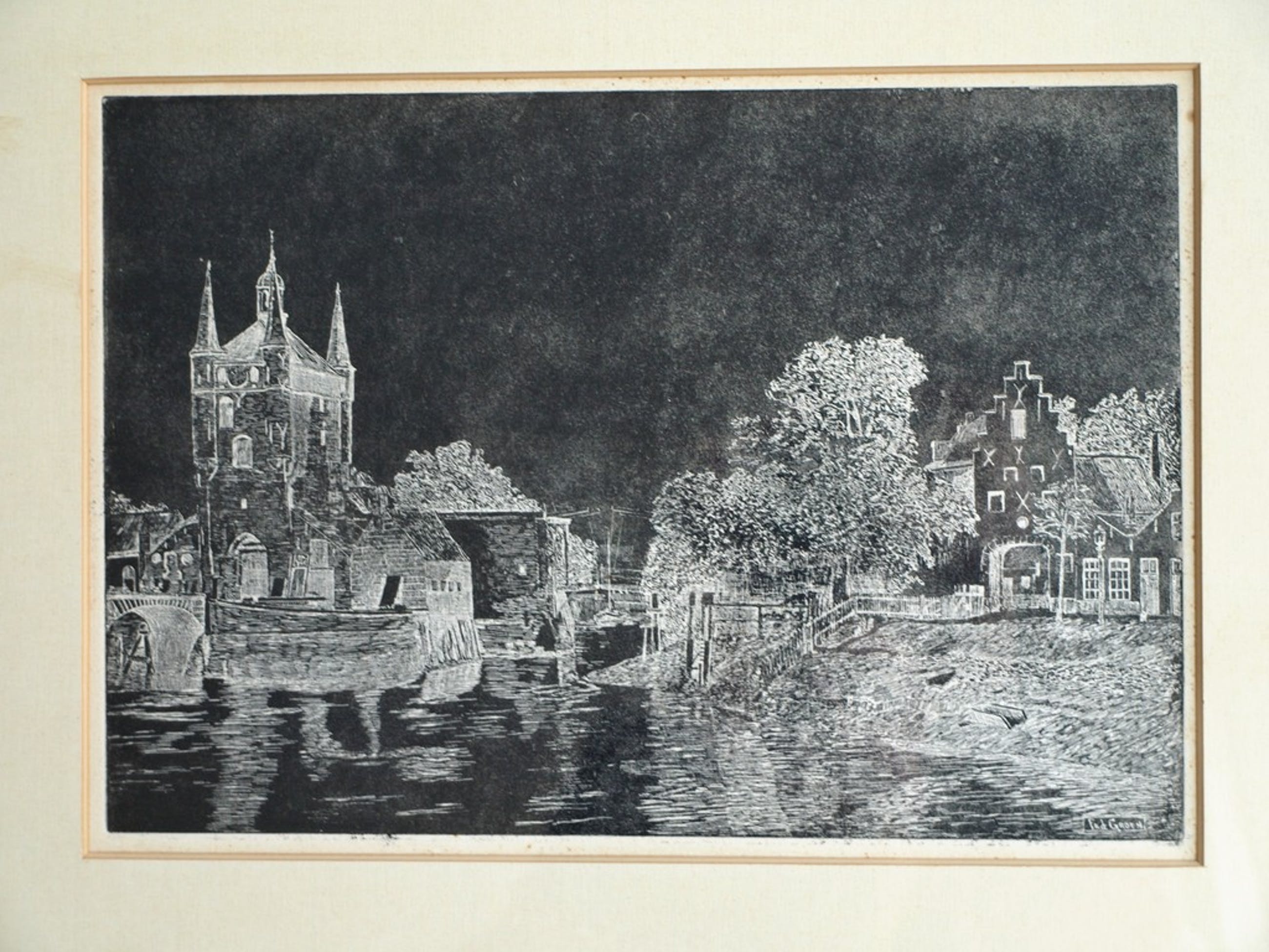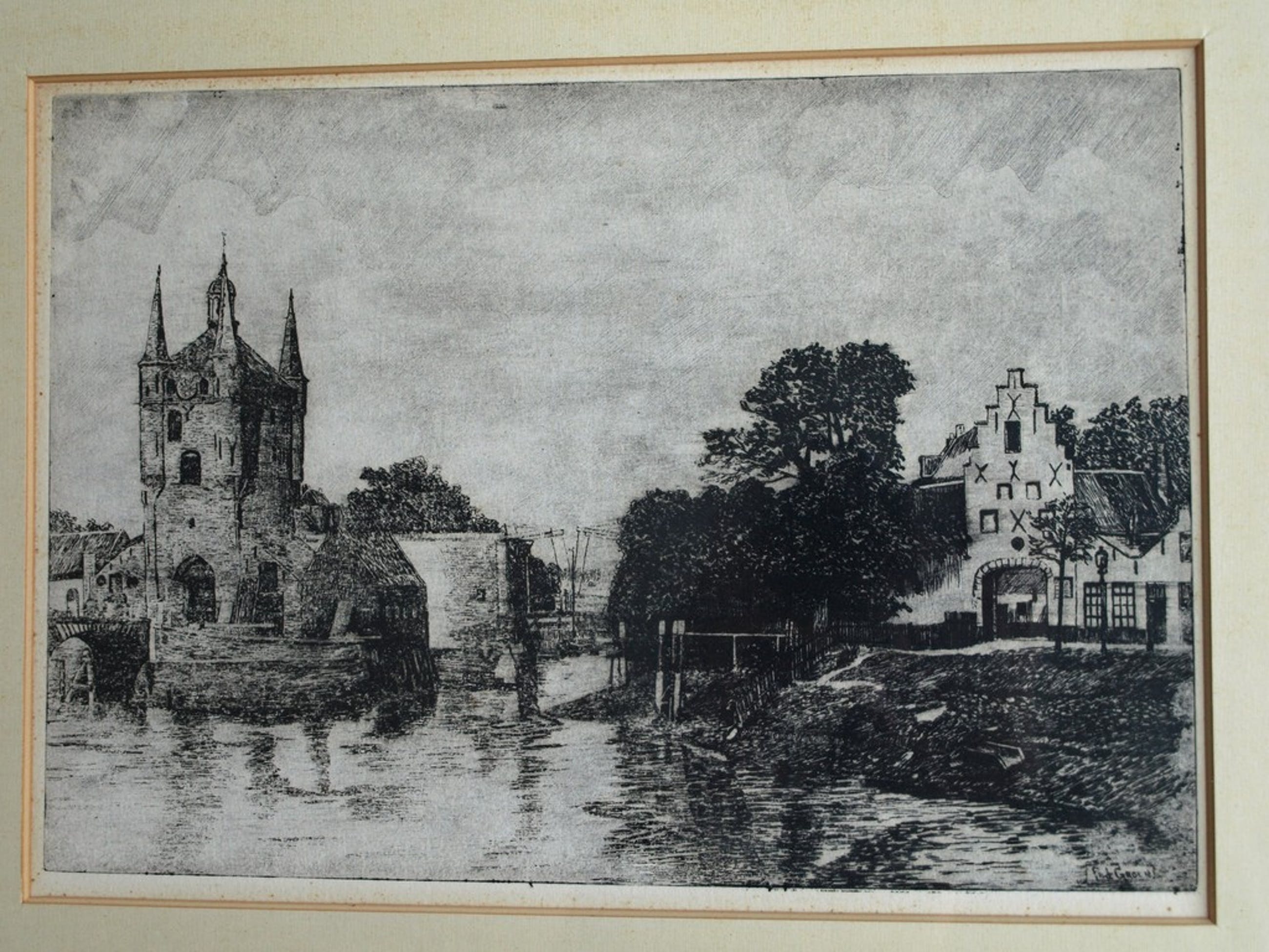 -Conditie: De 2 etsen zijn in goede staat. Het passe-partout is vergeeld en heeft vlekjes. De lijst is ‘verweerd’. Zie ook de foto’s.