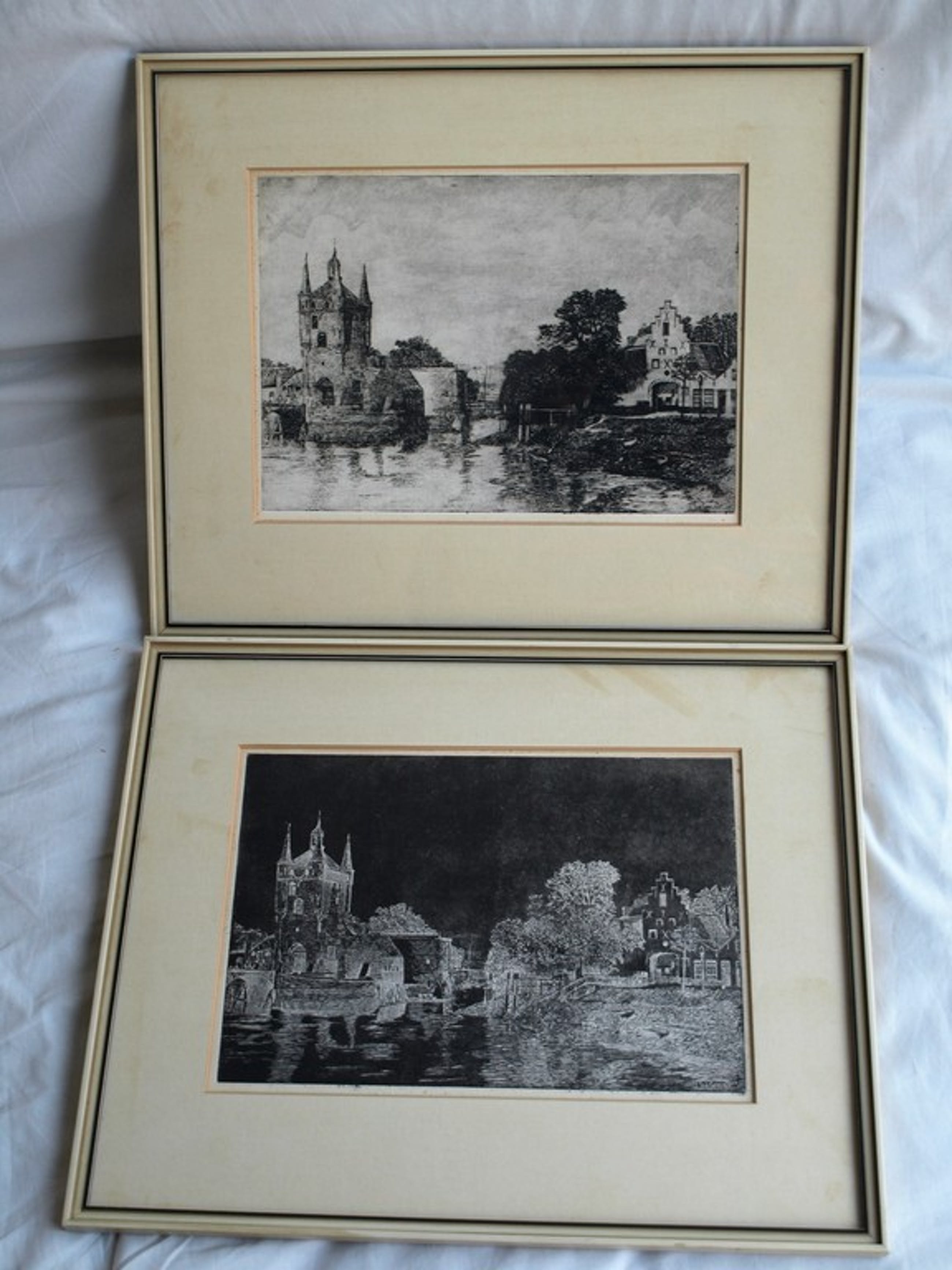 -Beide etsen zijn drukgesigneerd en ingelijst in de originele houten lijst met passe-partout en glasplaat.