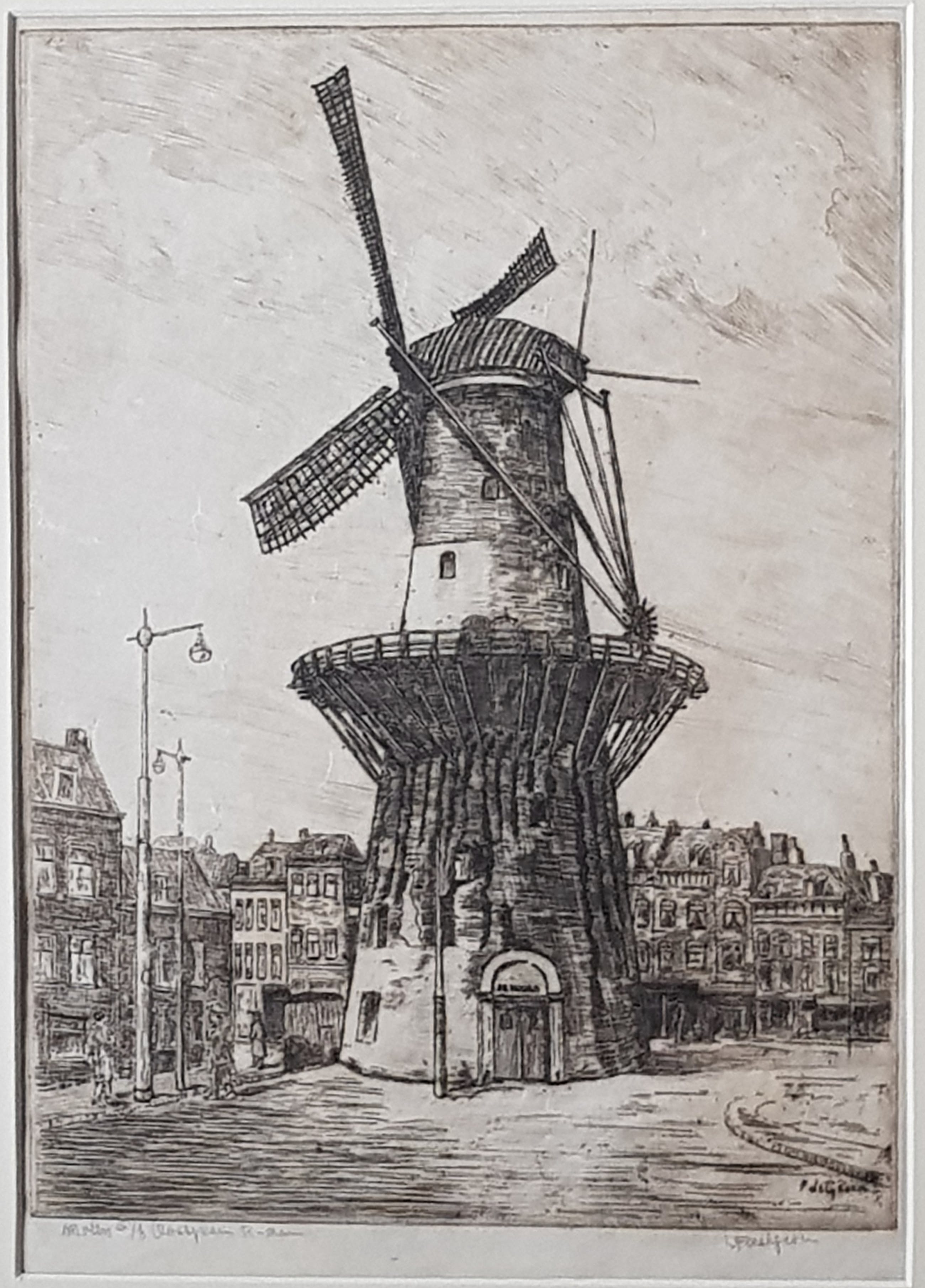 De ets geeft de Molen aan het Oostplein weer in het vooroorlogse Rotterdam.