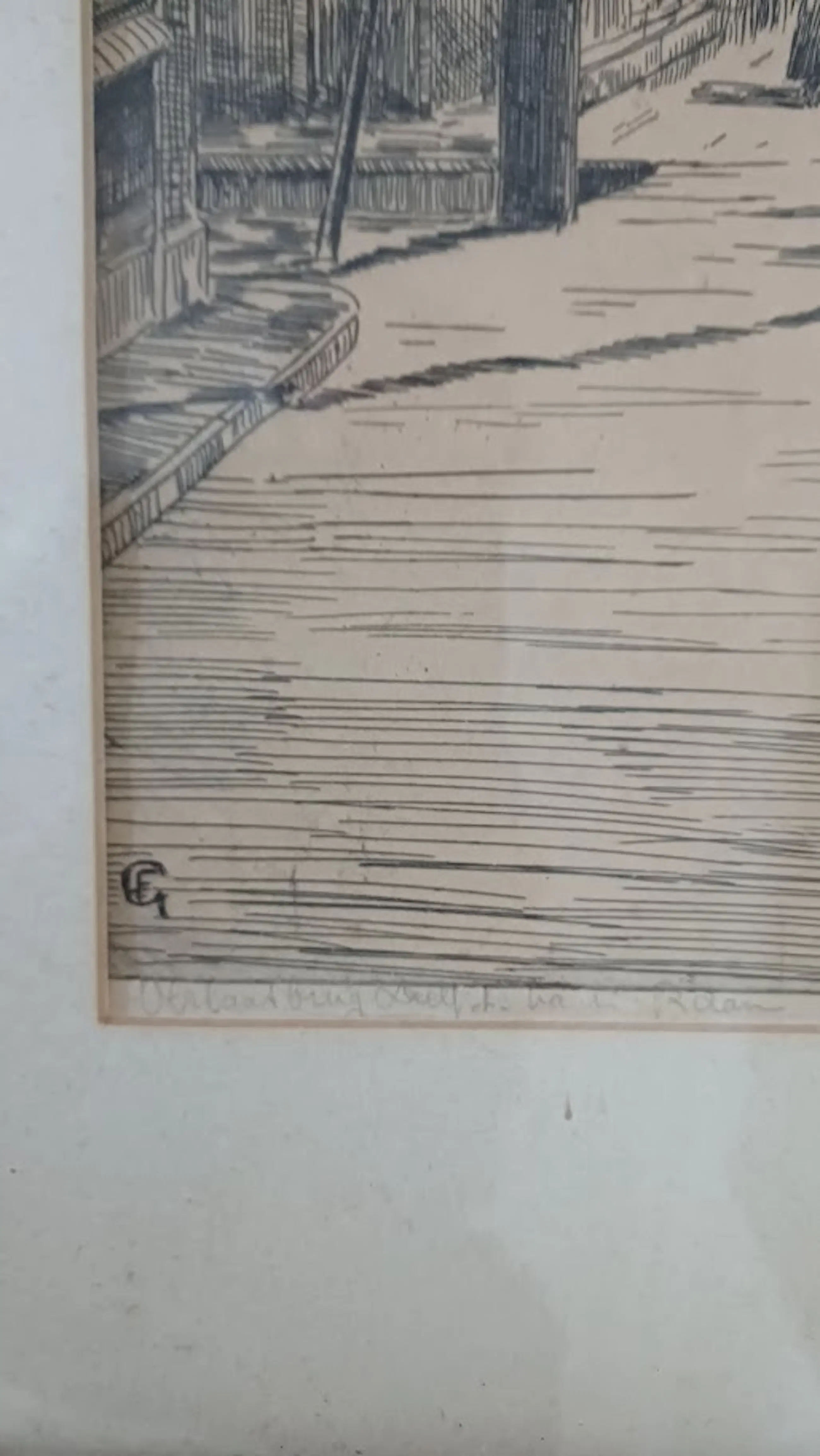 Glas is gebarsten; lijst heeft een kleine slijtagesporen. Ets zelf is ok.