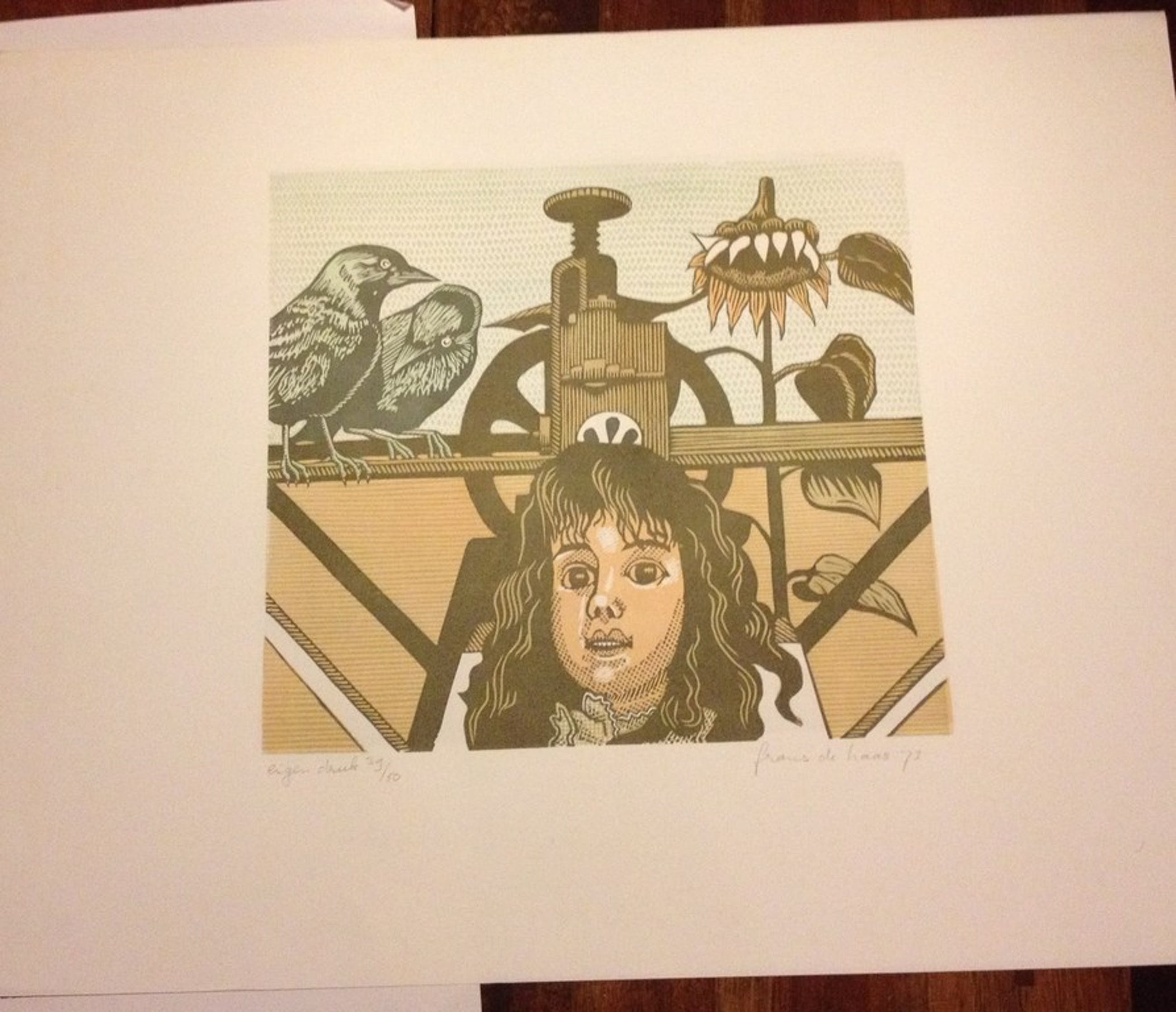 Grote linodruk (eigen druk) van Frans de Haas (1934-2007). Zie: https://rkd.nl/explore/artists/34957