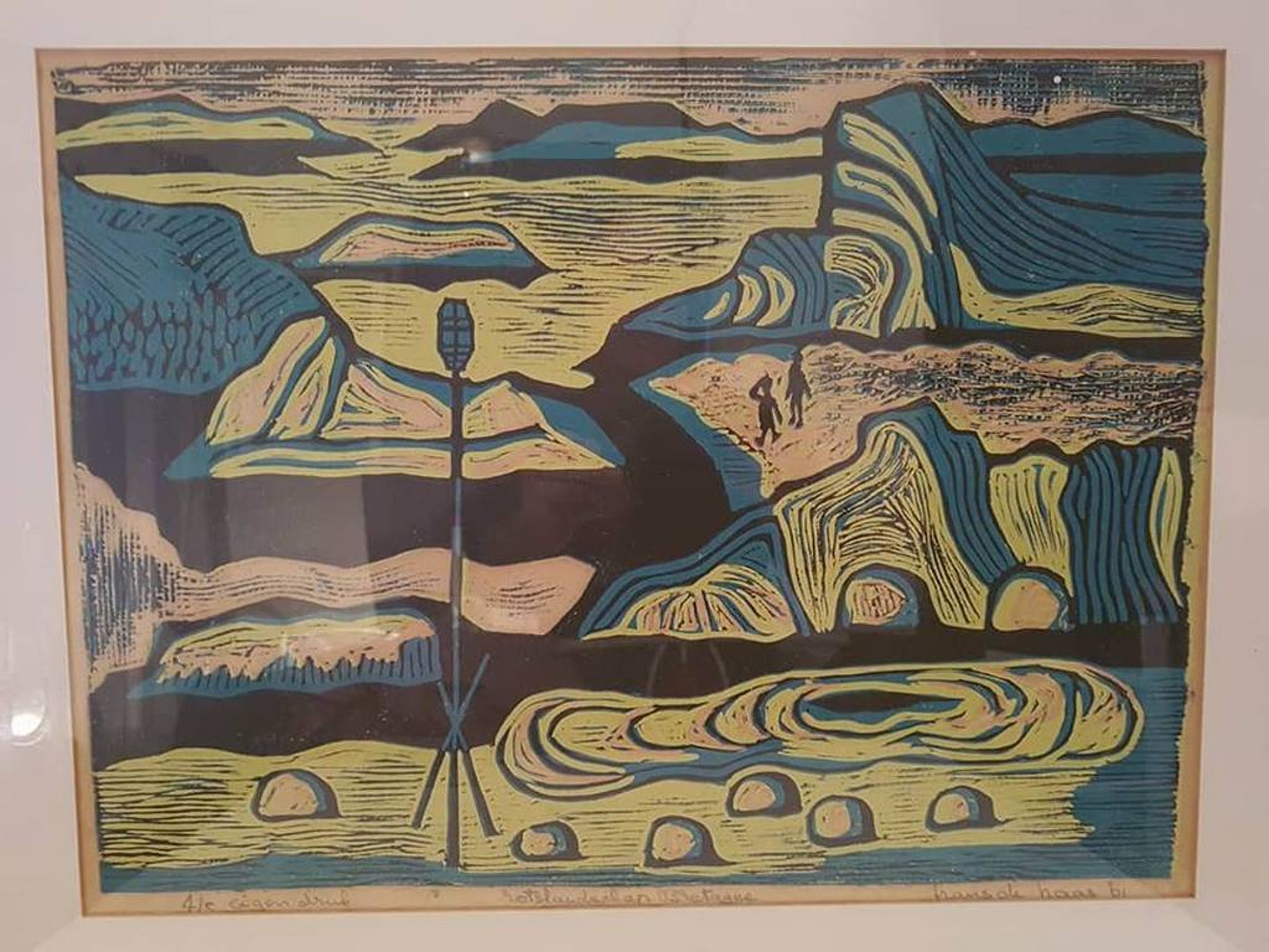 Bijzondere Houtsnede van Frans de Haas ( 1934-2007) : " Rotslandschap Bretagne"( 1961) uitgebeeld in een Magisch realistische / surealistische stijl.