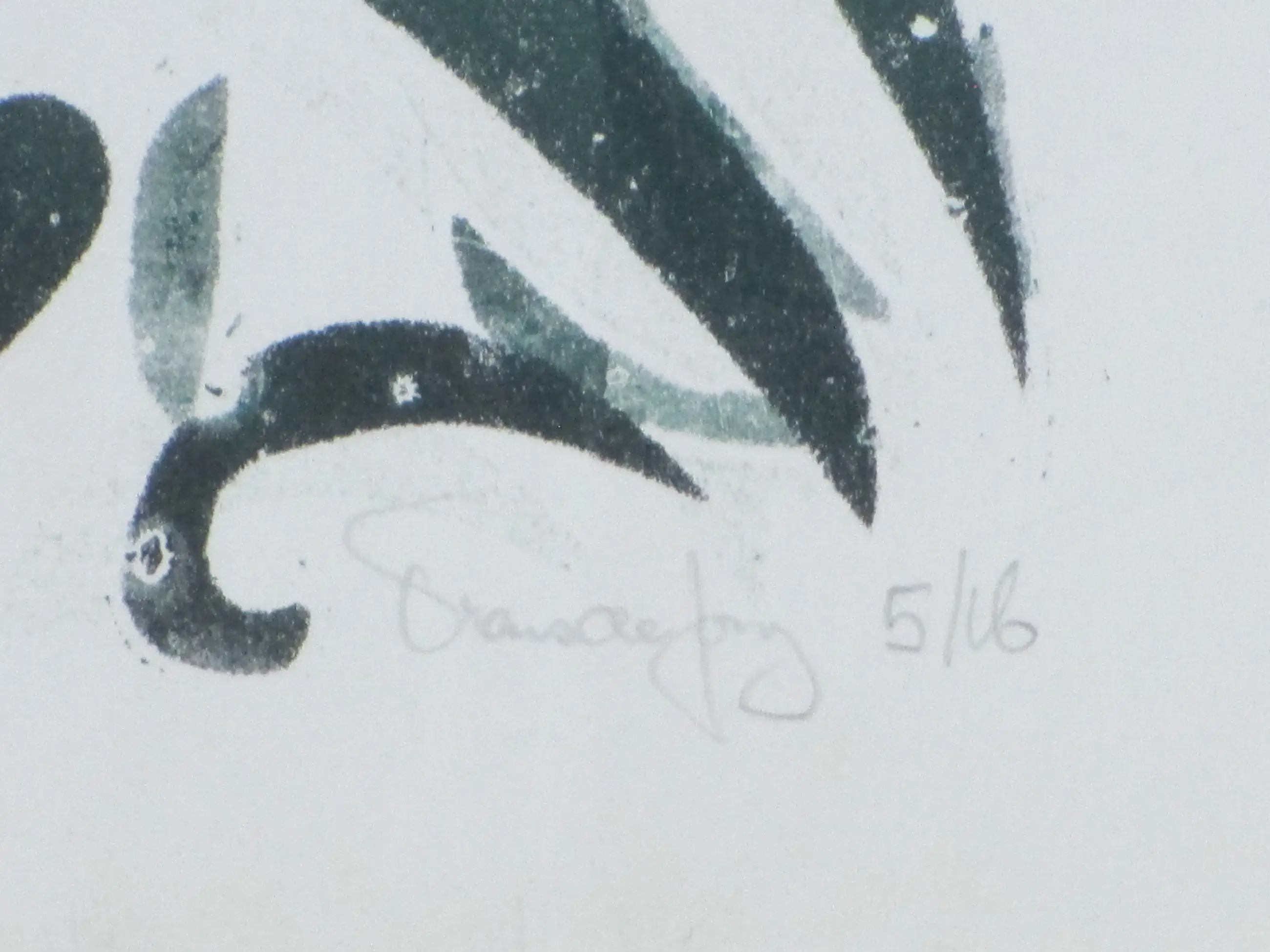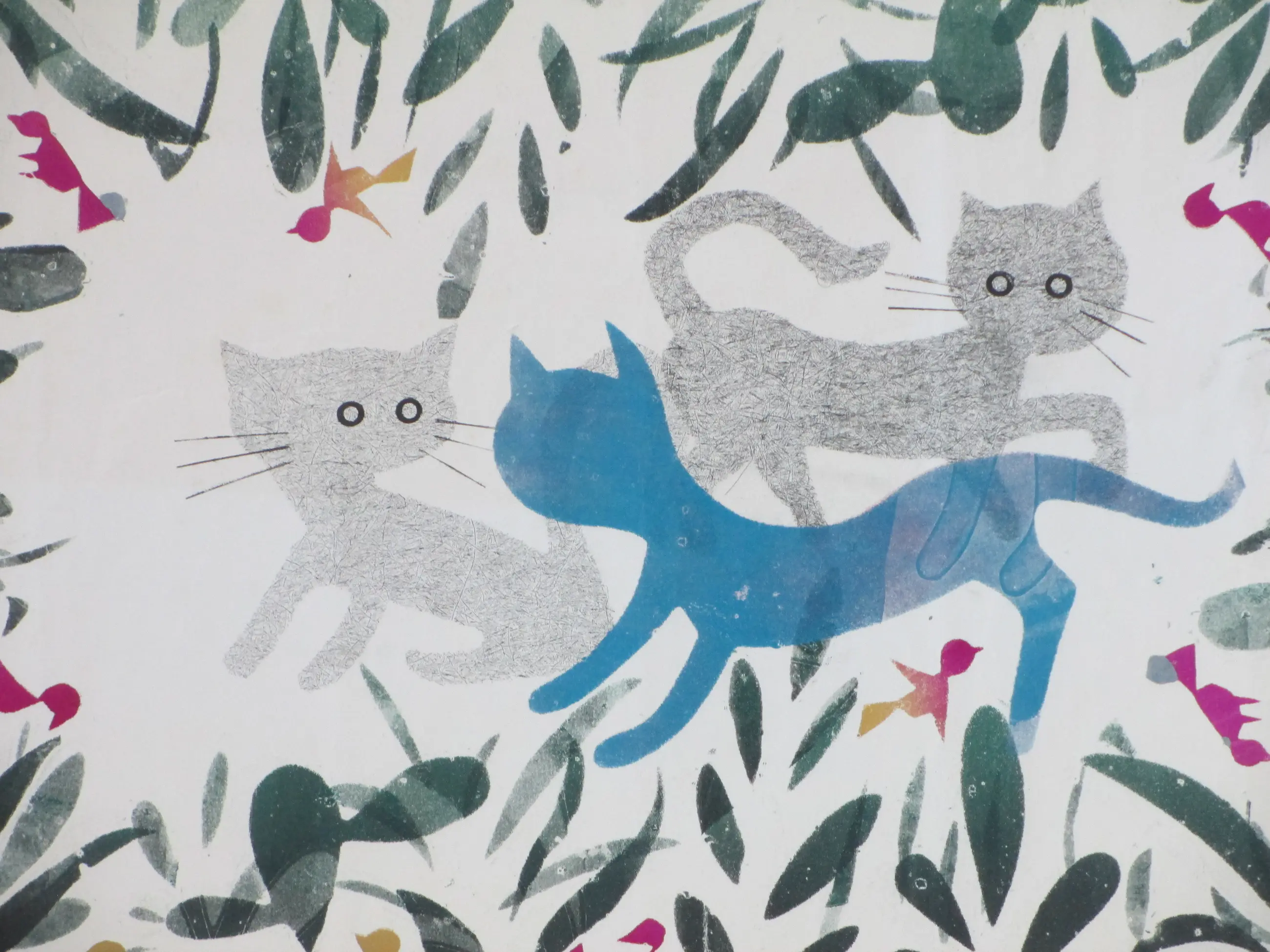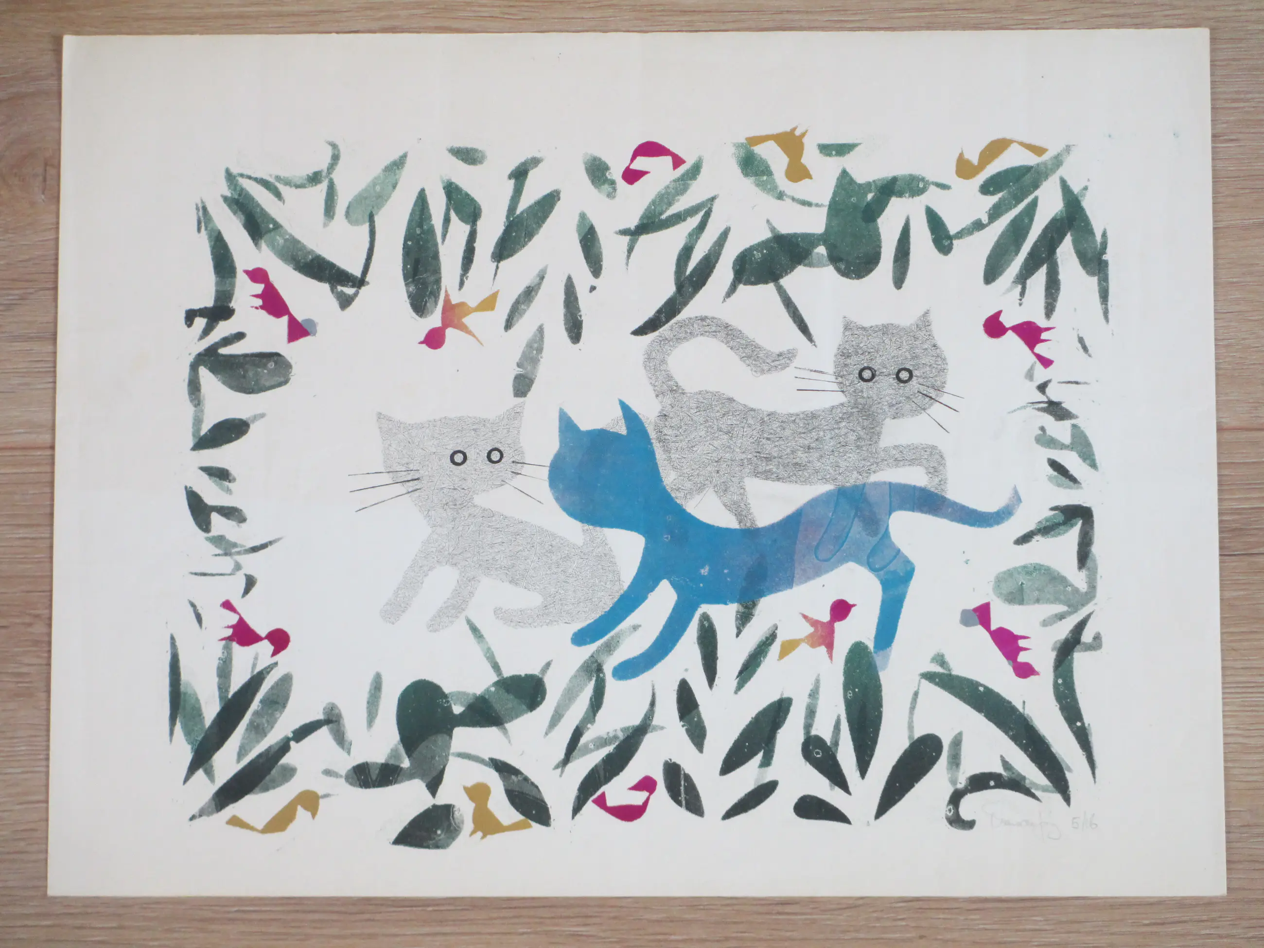 Sjabloondruk door Frans de Jong Voorstelling van drie katten Losbladig, beeldmaat 27x35, bladmaat 32x43 Gesigneerd en genummerd in potlood r.o.: 'Frans de Jong 5/16' Verzamelaarsstempel op achterzijde: 'Collectie Ton en Dobs van Dijk' Authenticiteit volledig gegarandeerd