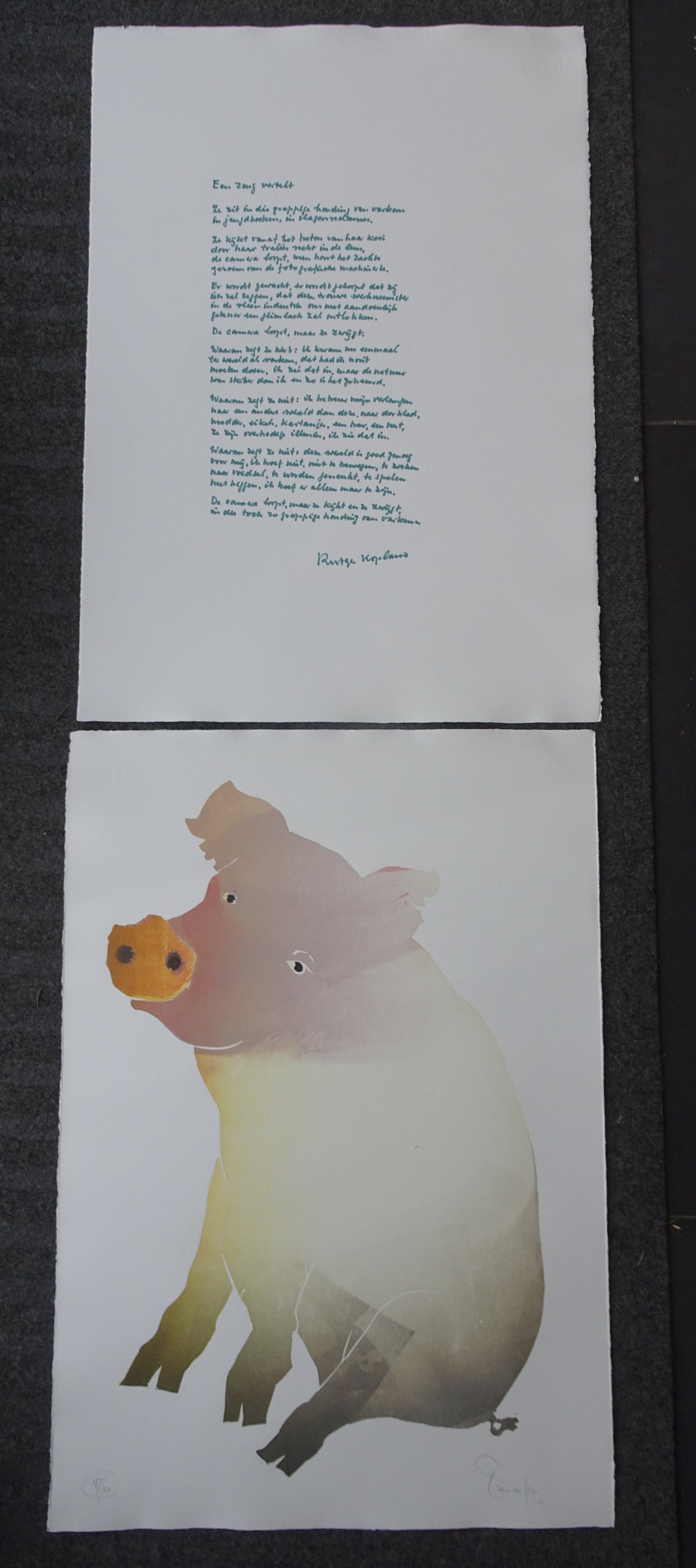 Een zeug vertelt.Rutger Kopland en Frans de JongKleurenlitho met gedicht Niet ingelijstGesigneerd Oplage 47/50Op geschept papier met watermerkAfmeting 40 x 60 cm.In goede staatWordt verzonden in ruime kokerAfhalen is mogelijk.