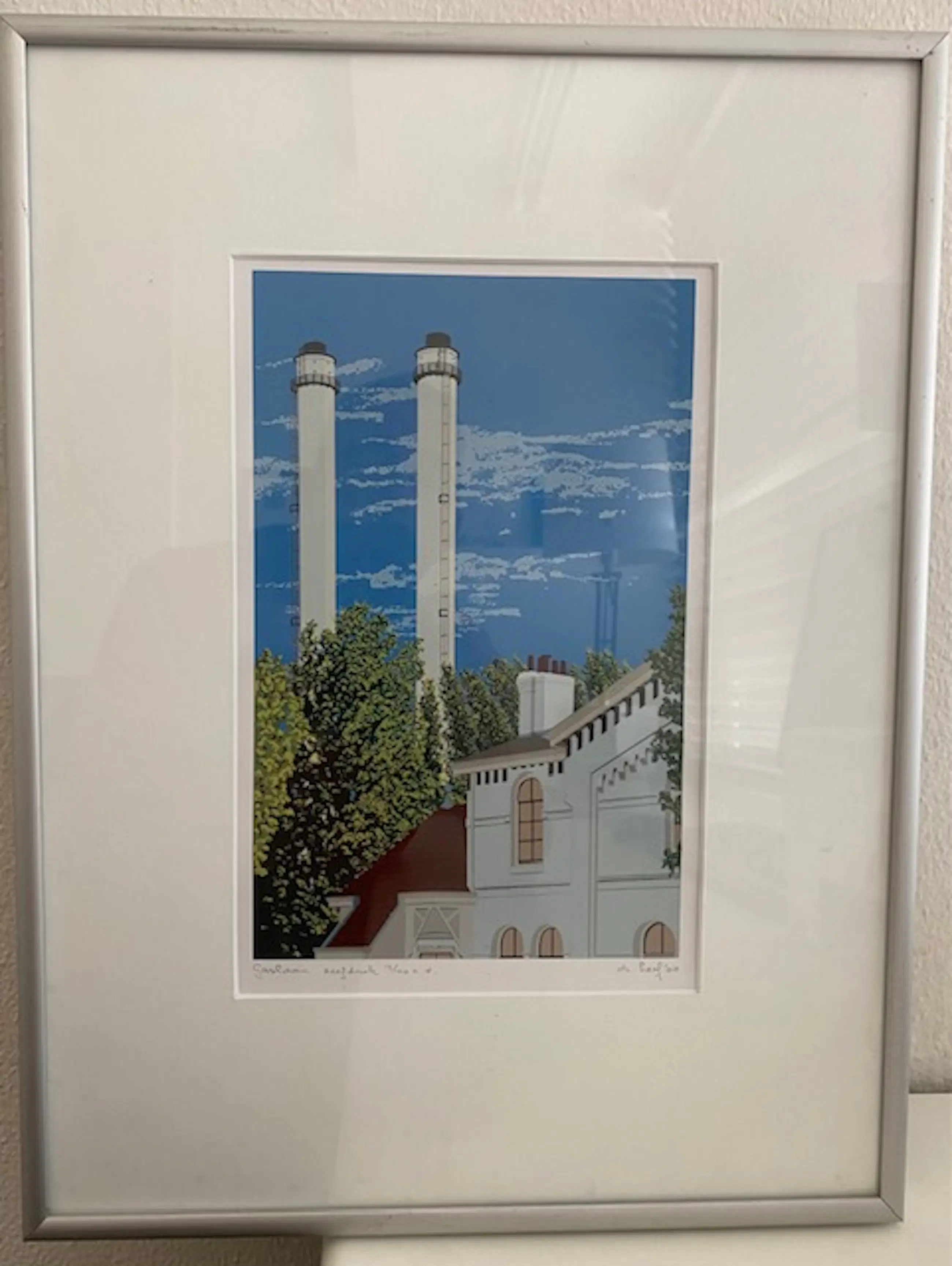 Een eigendruk van een oud stadsbeeld met de schoorsteen van de voormalige vuilverbranding in Den Haag.