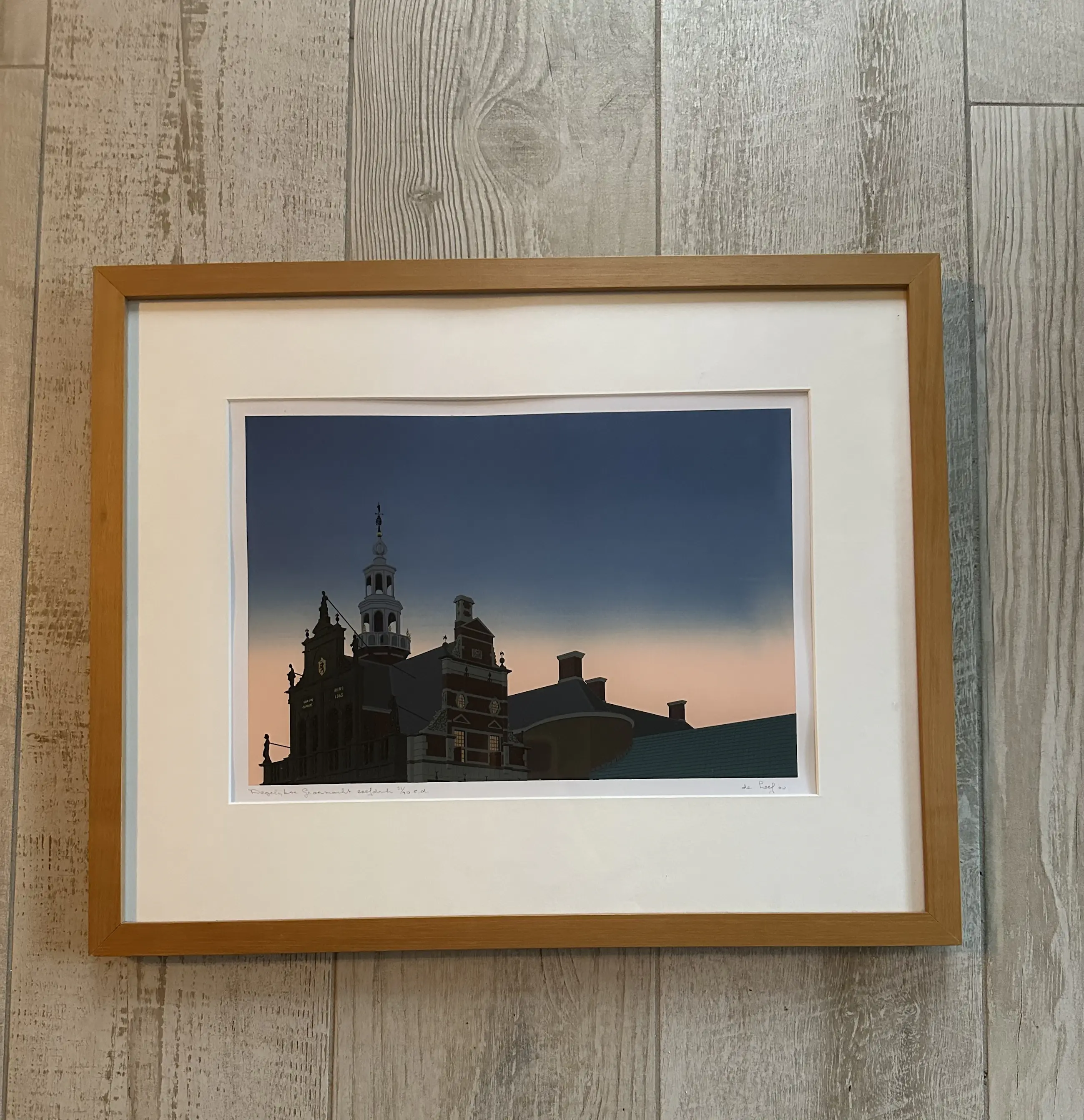 Prachtige zeefdruk van Frans de Leef, getiteld "Dagelijkse Groenmarkt" (Den Haag). Gemaakt in 2000, dit is nummer 28 van een oplage van 40. Eigen druk (e.d.). Professioneel ingelijst in een moderne houten lijst met passepartout. In zeer goede staat.