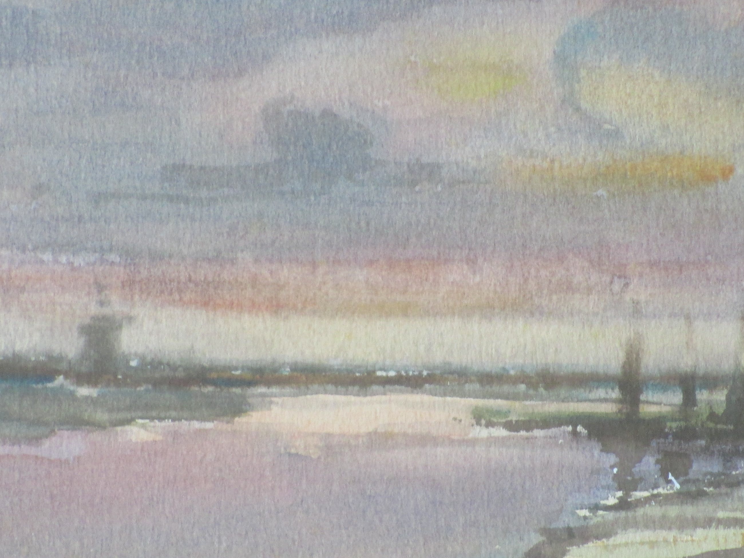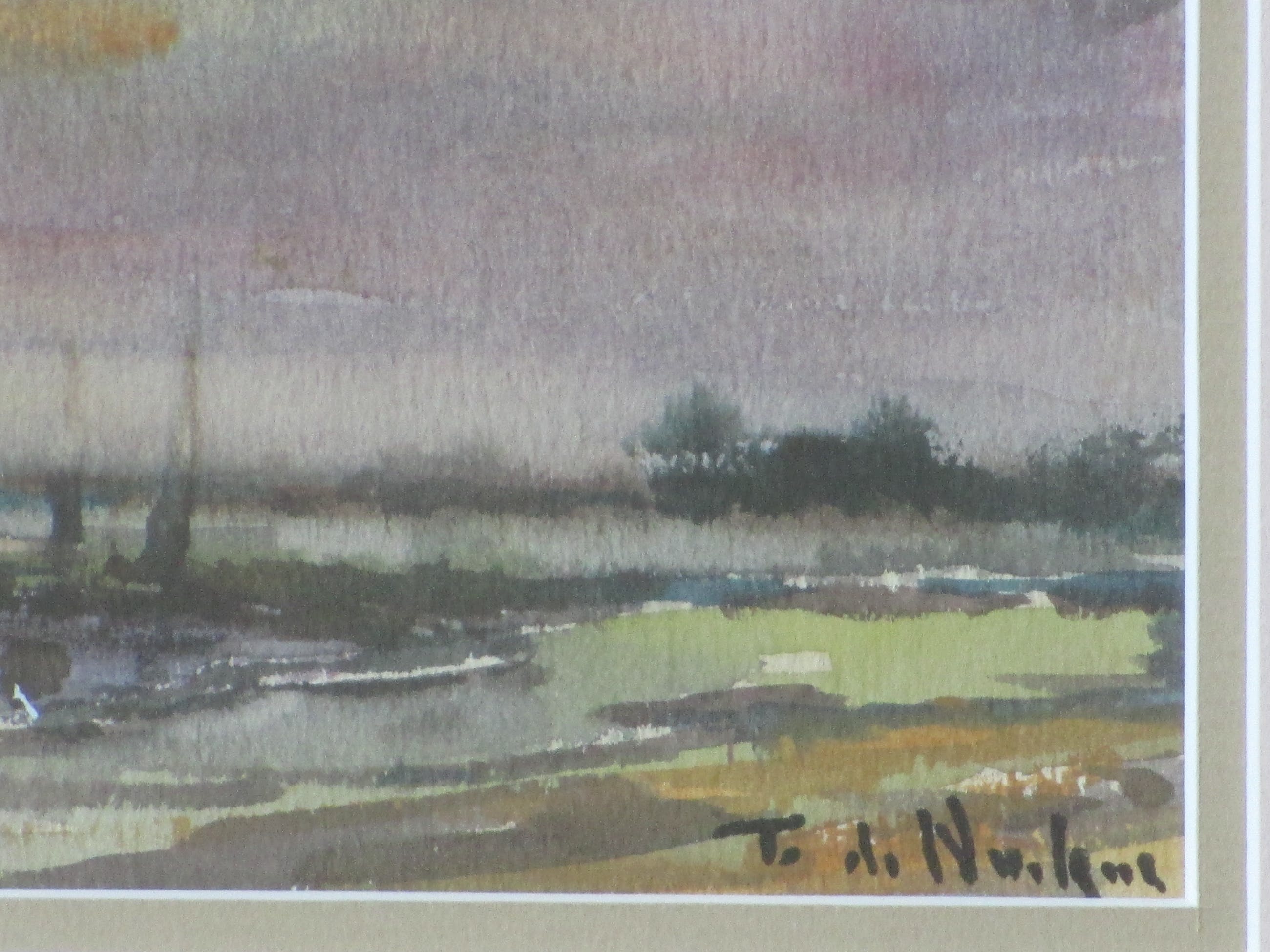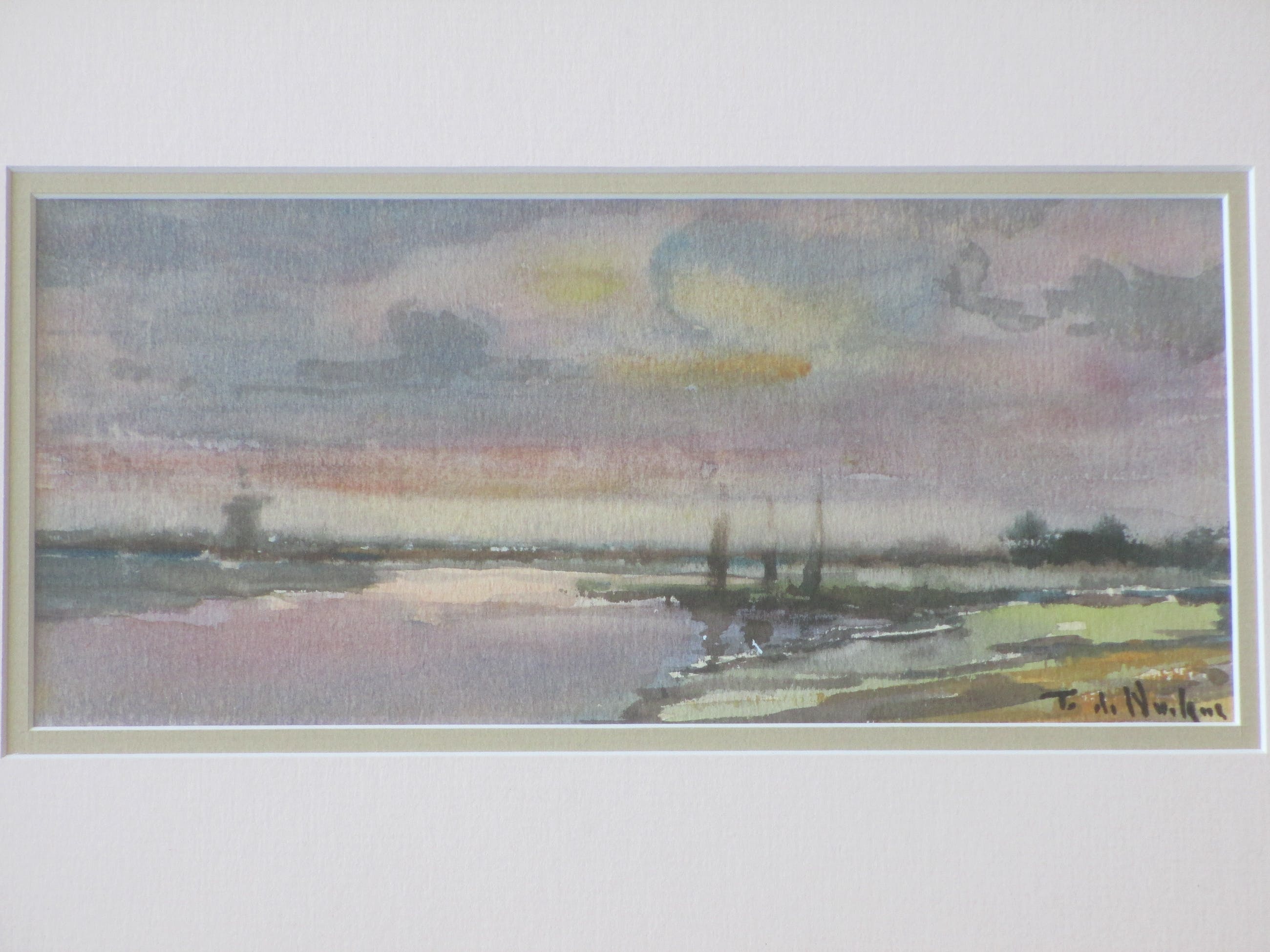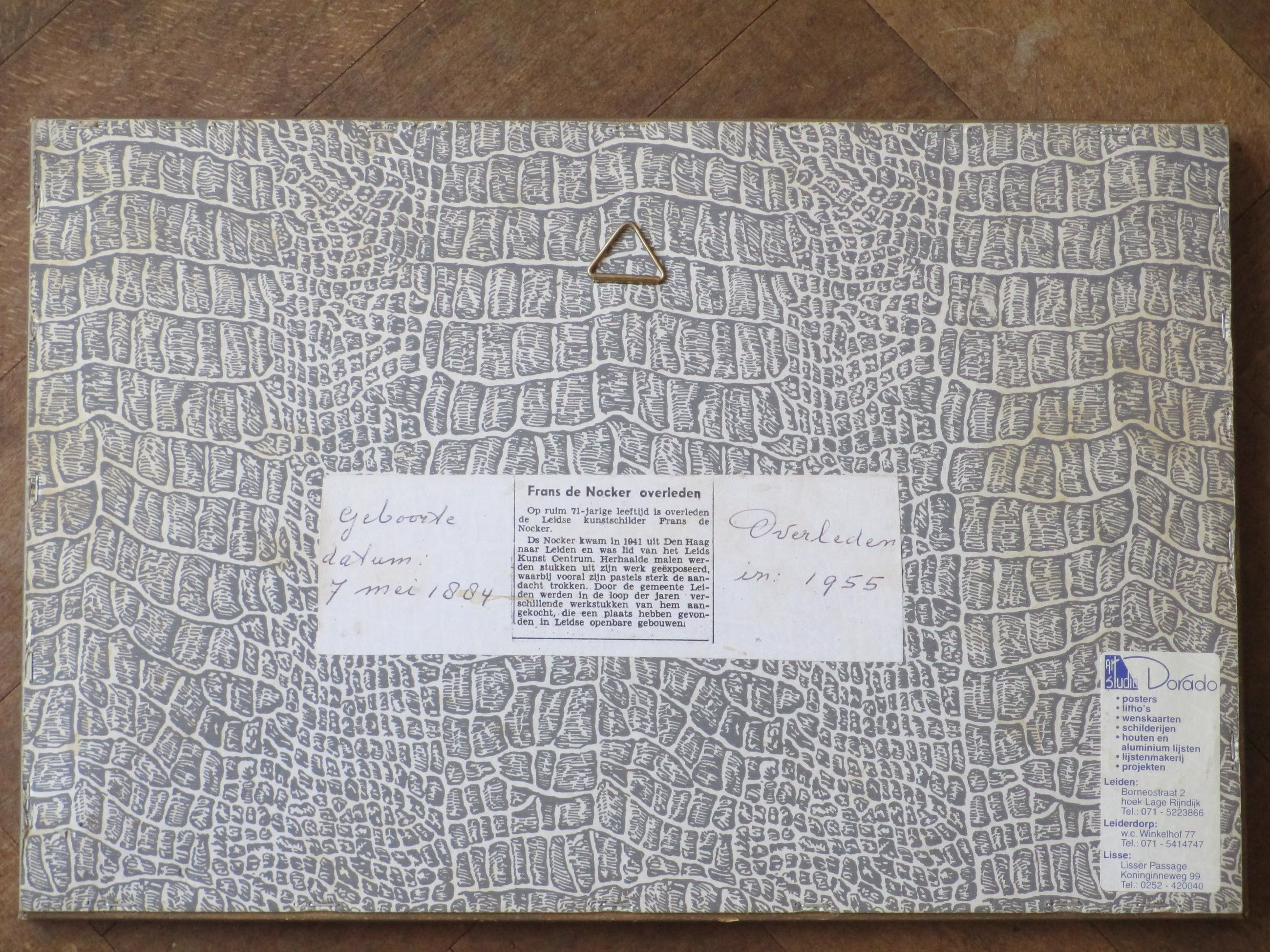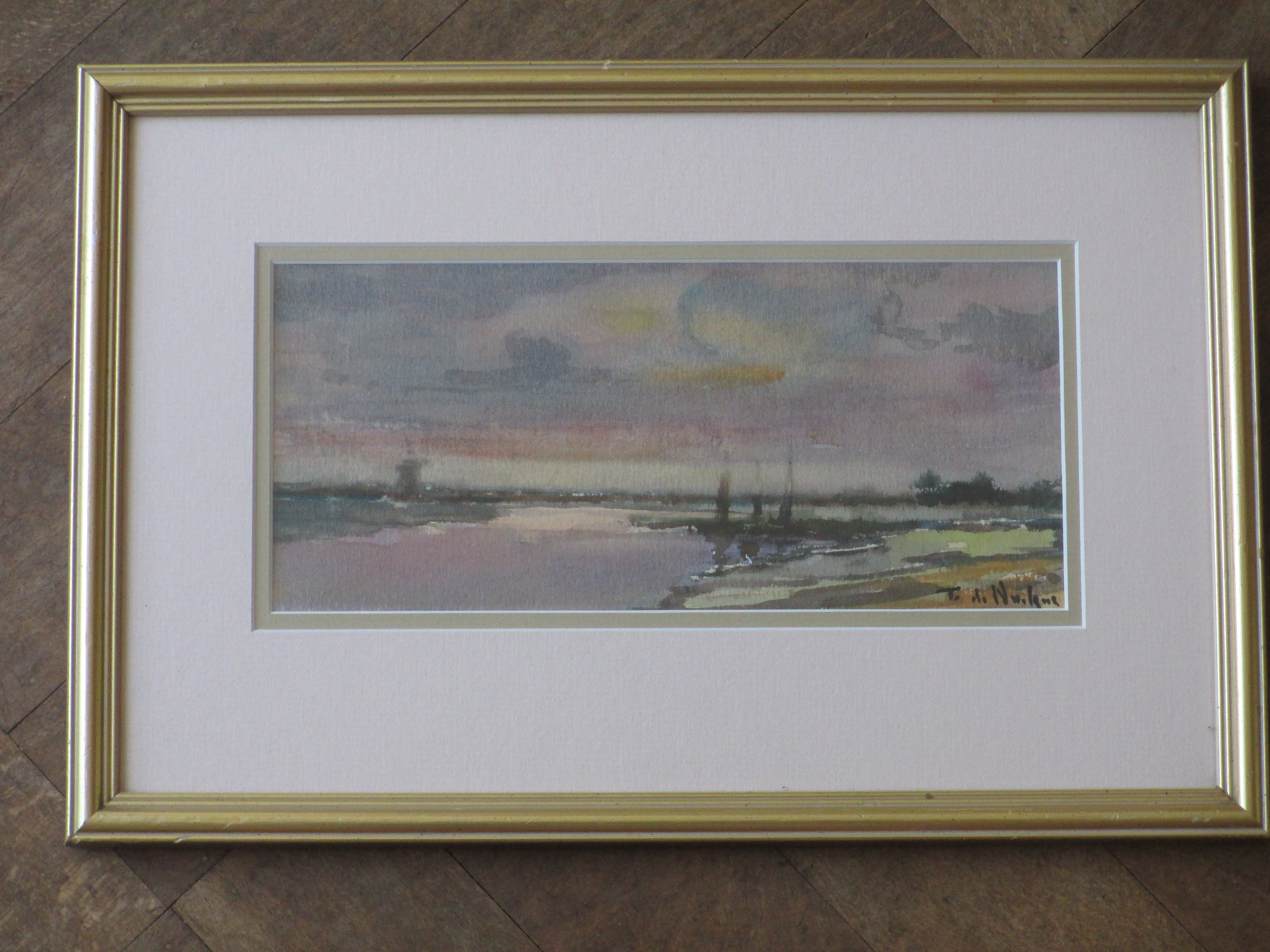 Gemengde techniek door Frans de Nocker. Voorstelling van een haventje in een polderlandschap bij avondlicht. Gelijst, beeldmaat 11x24, lijstmaat 24x35 Gesigneerd r.o.: 'F. de Nocker' Authenticiteit volledig gegarandeerd