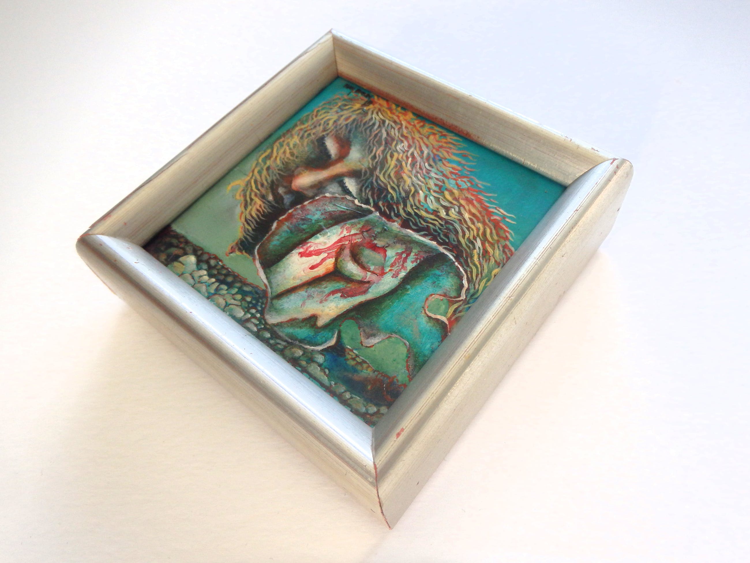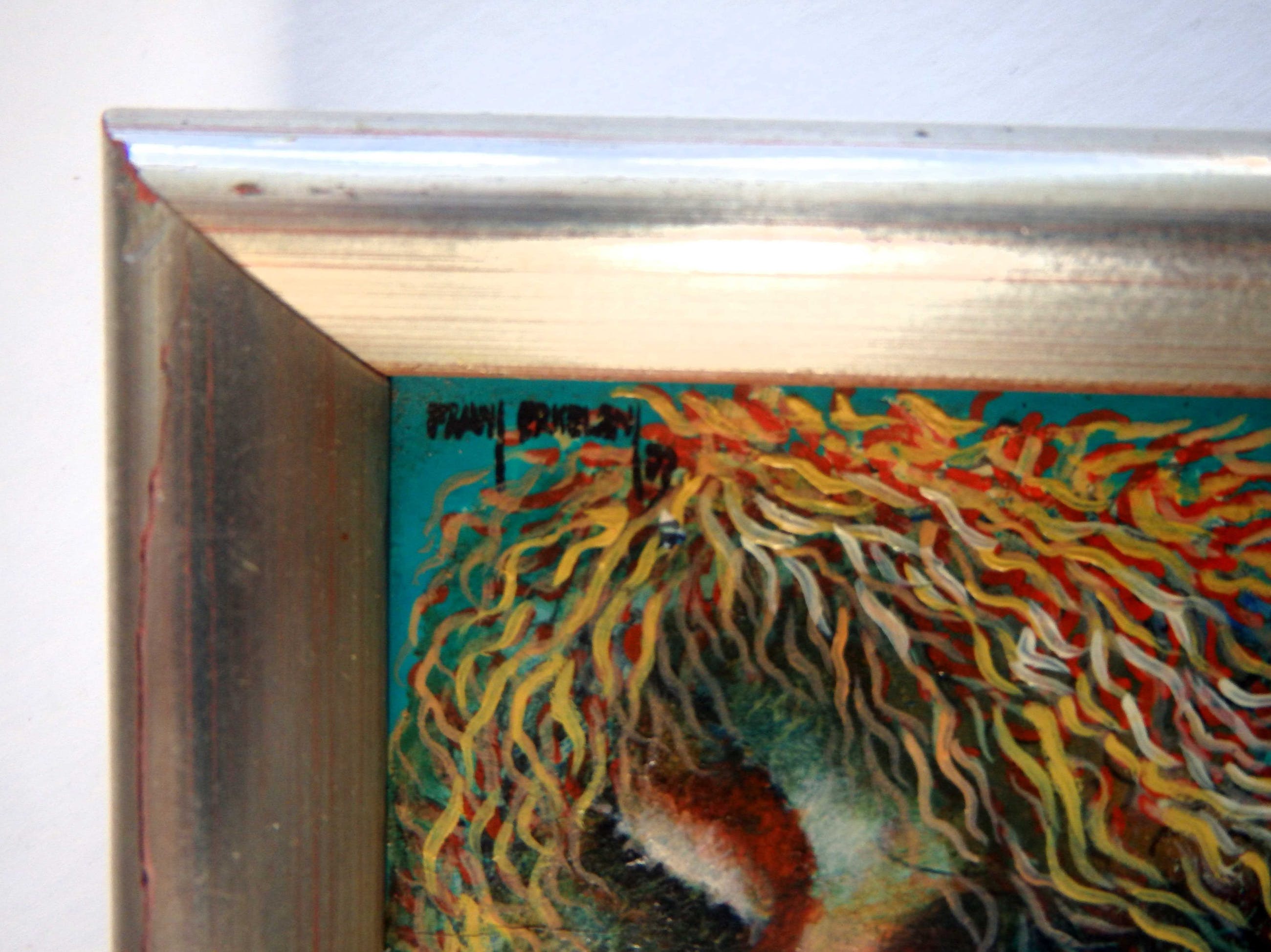 Olieverf 9x9 cm vermoedelijk op papier gemaroufleerd op paneeltje, linksboven gesigneerd Frans Erkelens en ik denk gedateerd '87, netjes ingelijst, dikte lijst 4 cm.