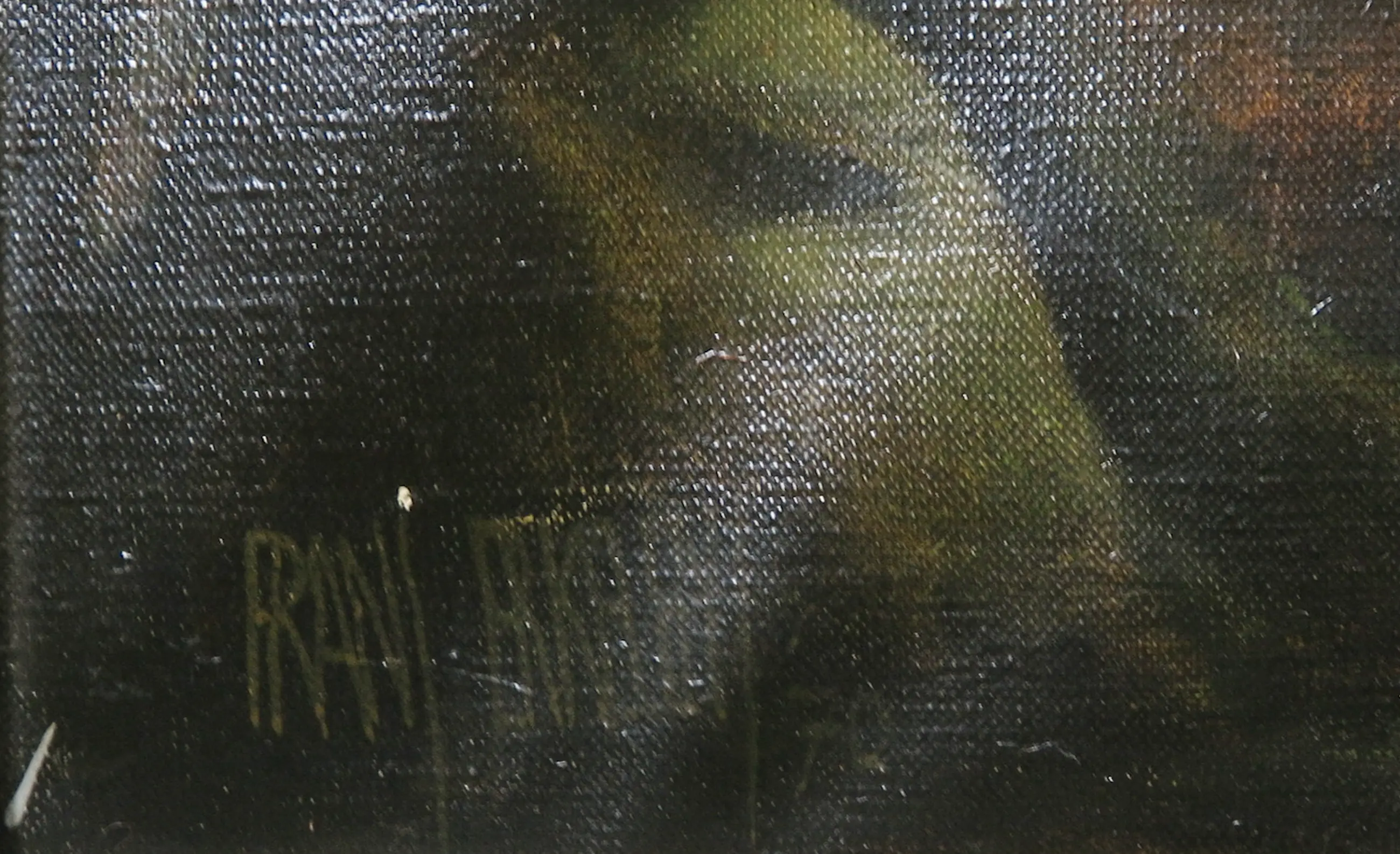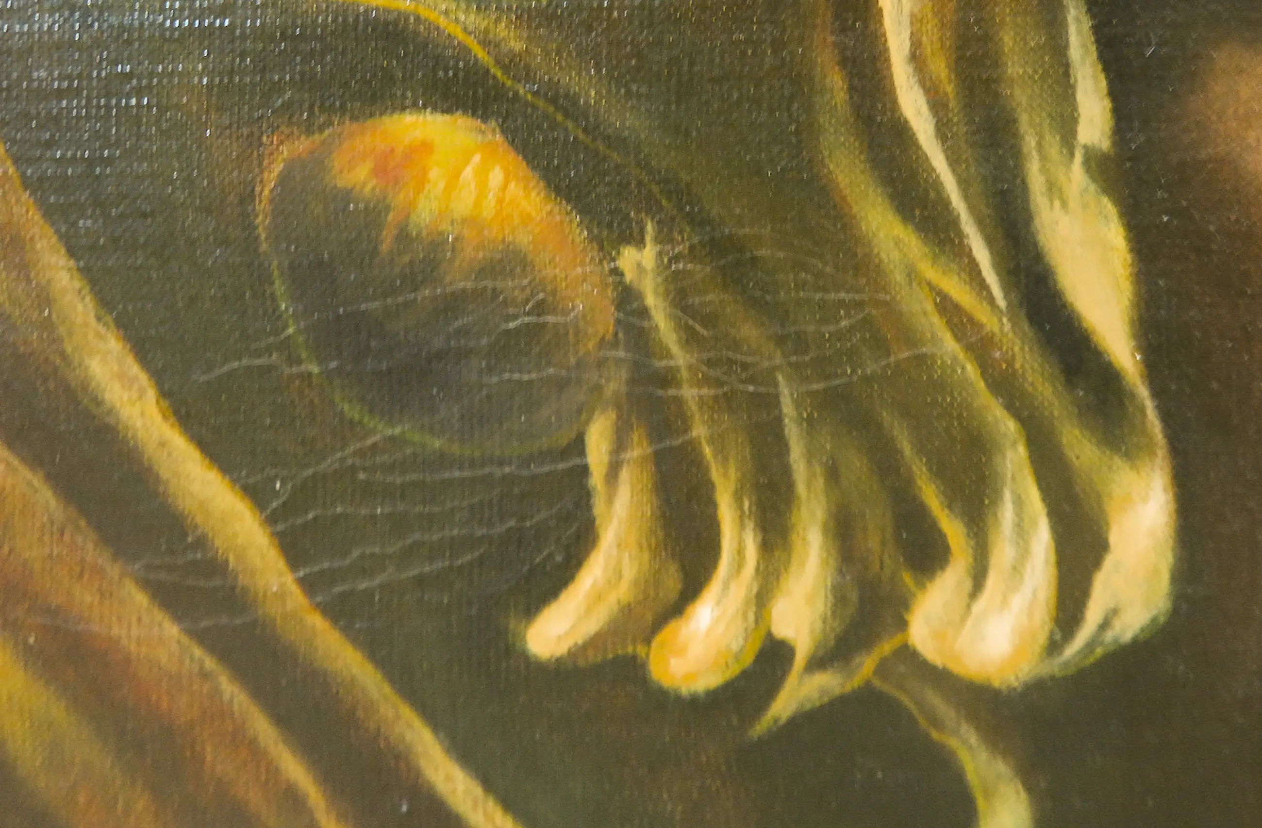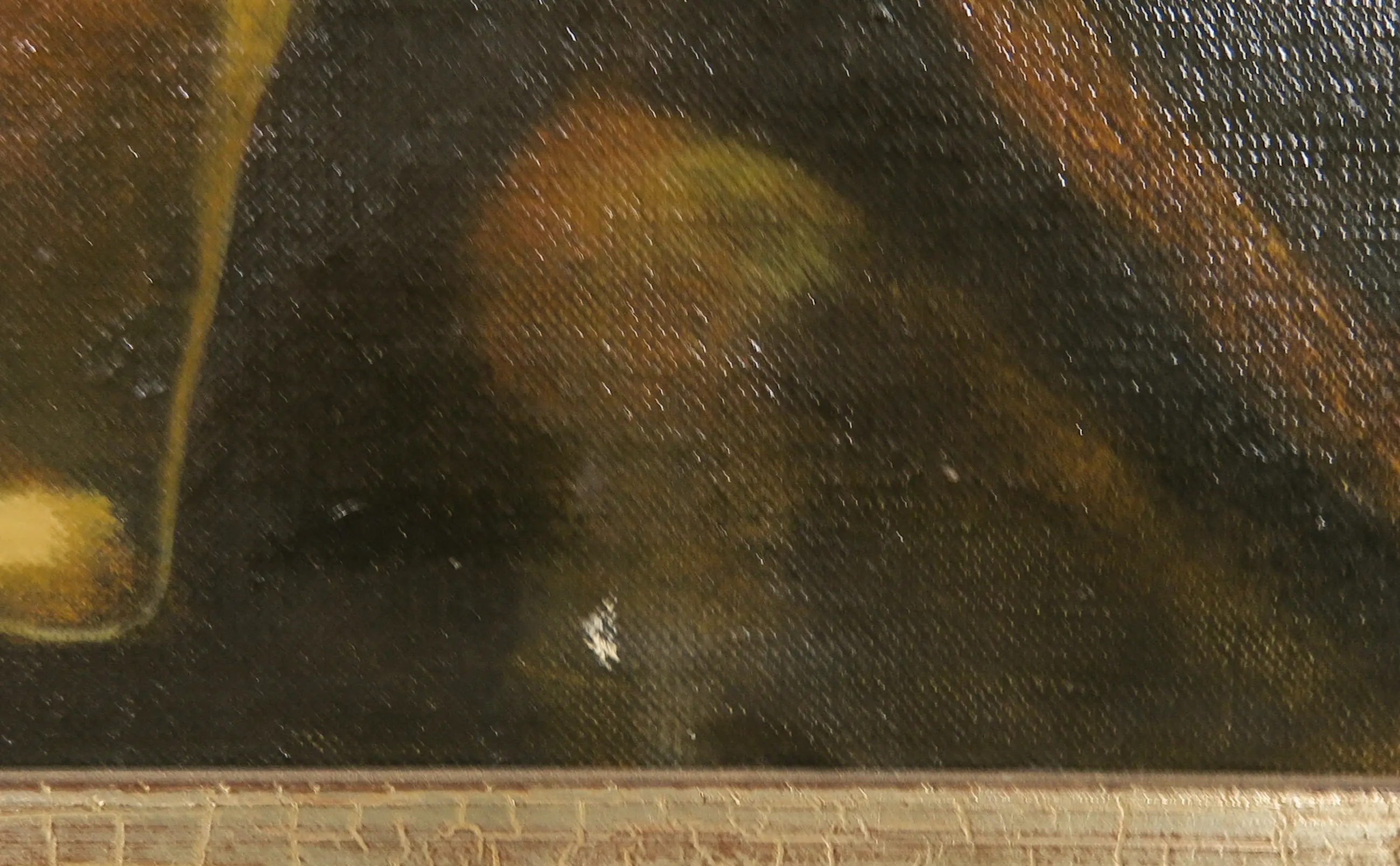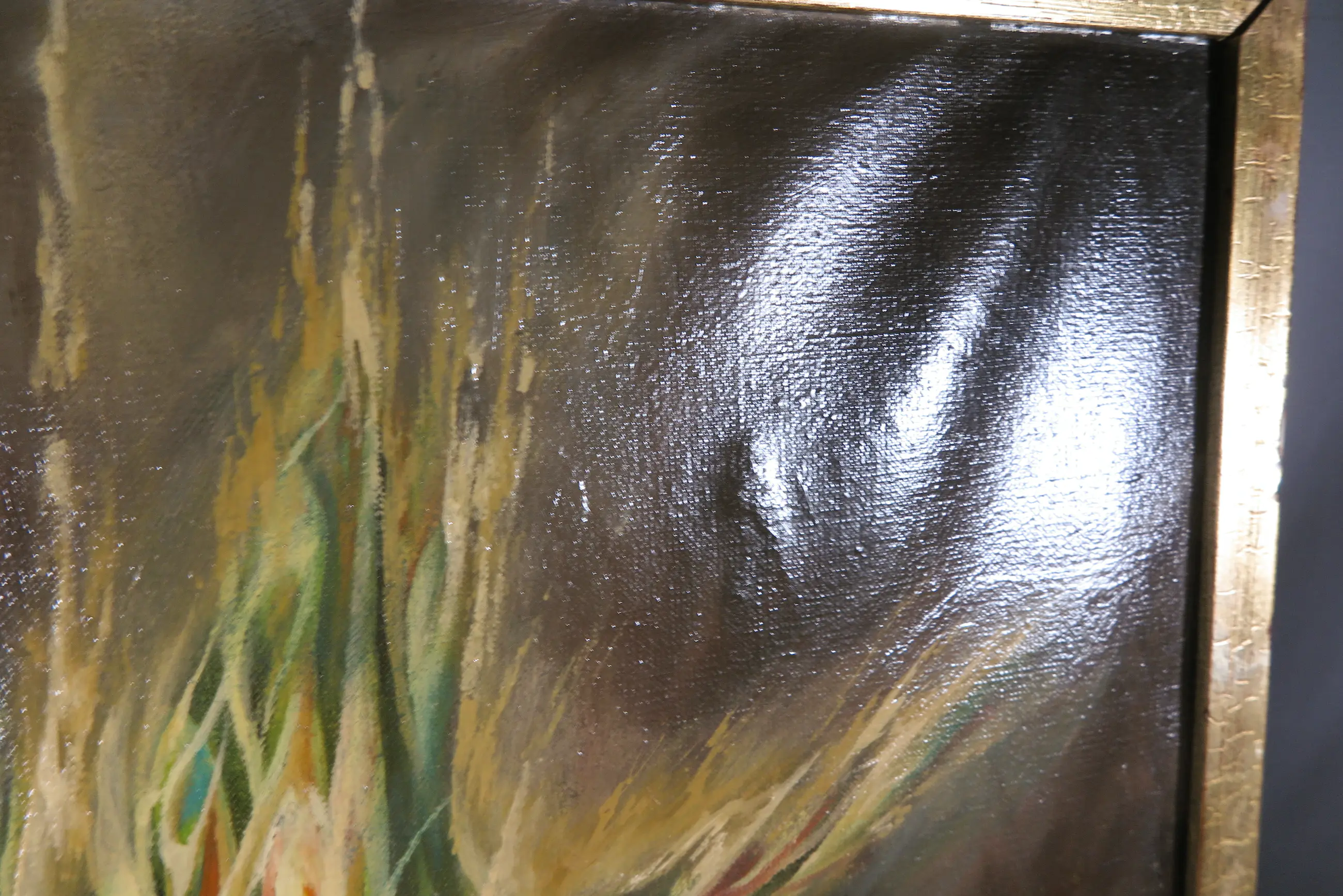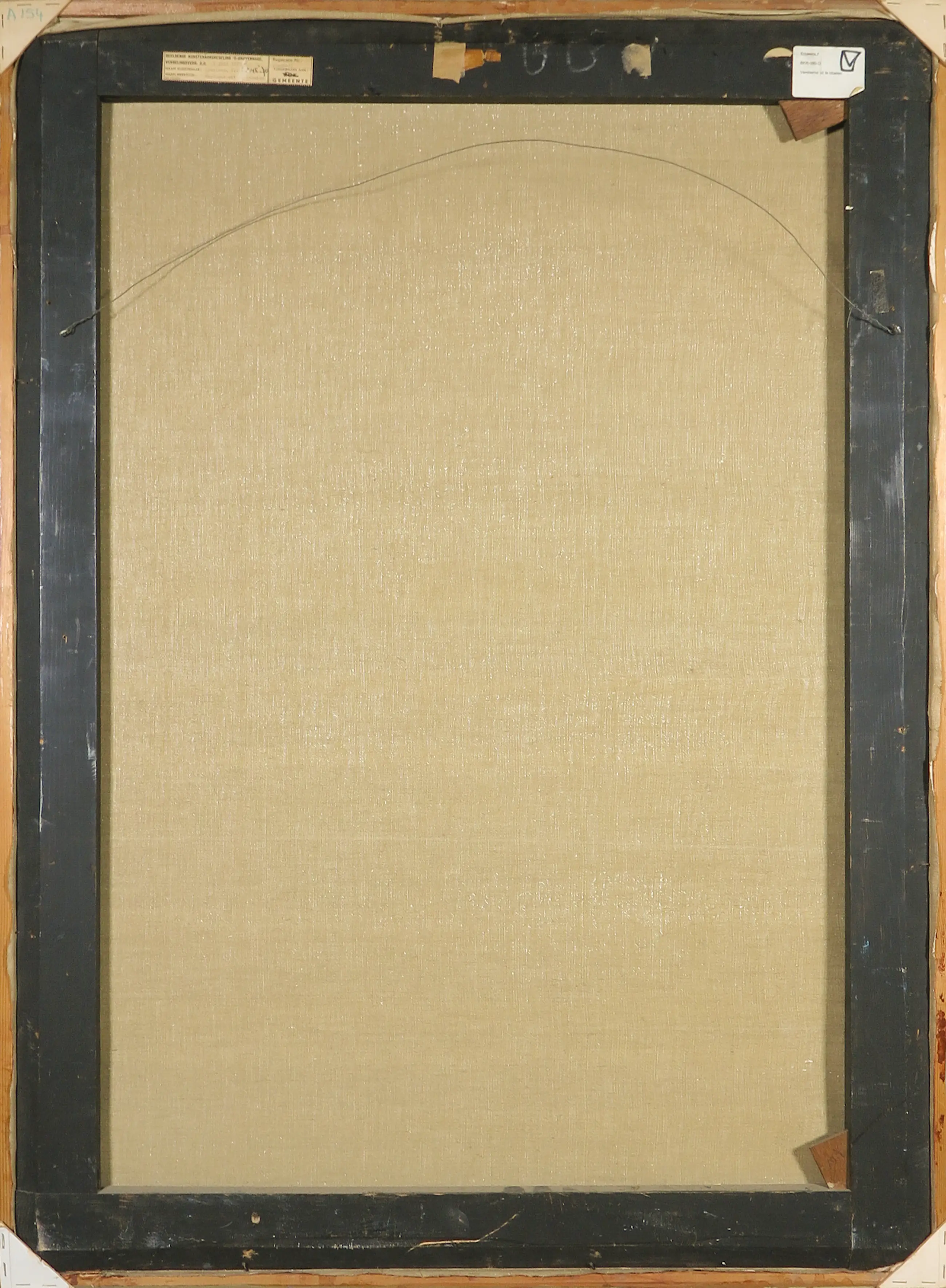 | Het werk heeft een klein plekje verfschade, craquelure, en golvende hoeken. | |