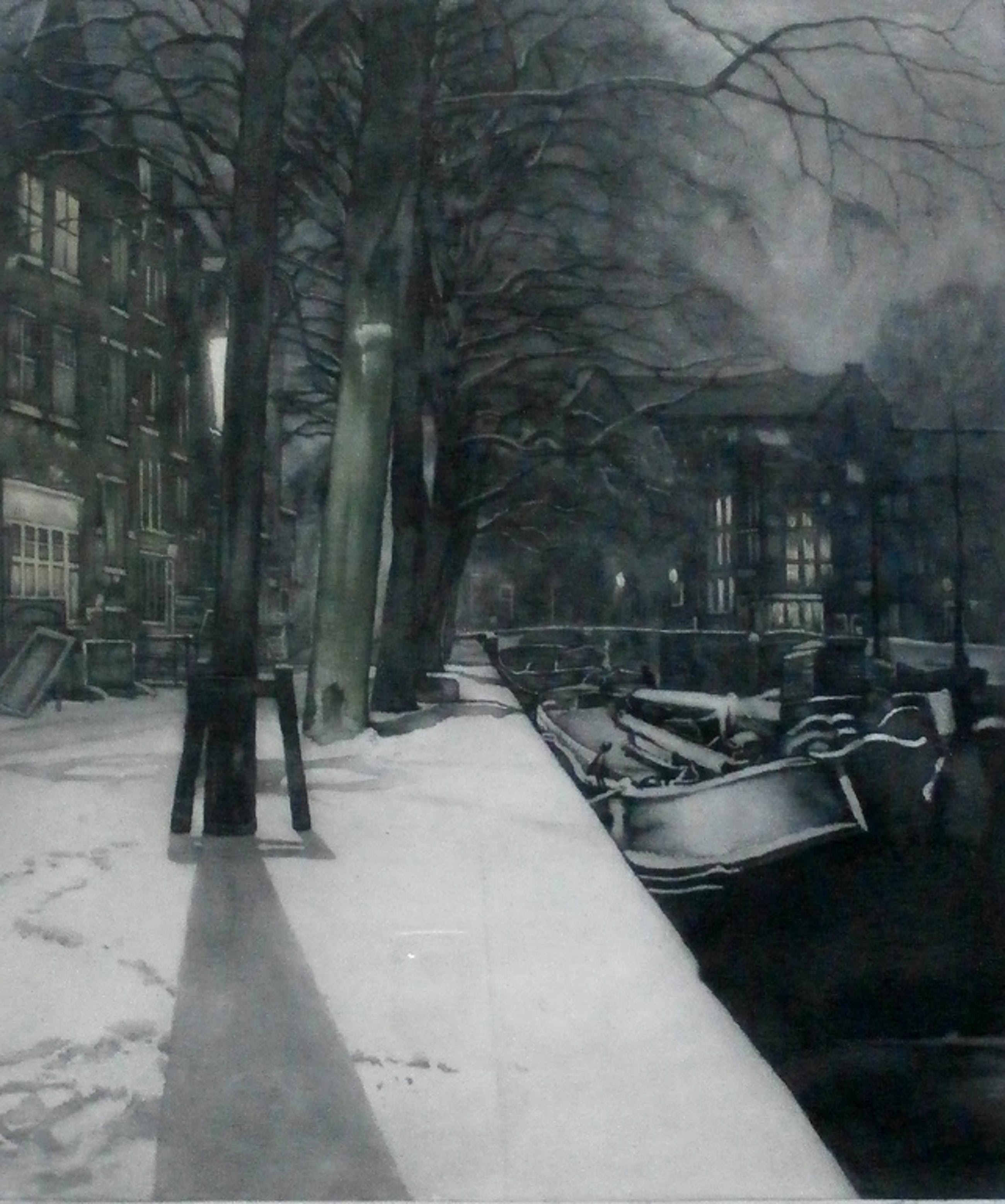 Zeer fraaie kleurenets van Frans Everbag. Titel: Prinsengracht (Amsterdam) in de winter. Afmetingen incl lijst: H64,5 x b57,55 cm; Afmetingen voorstelling: H46,5 x b39,5 cm; Nummer: EA; Jaar: 1931; Het werk is rechtsonder, met potlood, gesigneerd door de kunstenaar. De authenciteit van dit werk wordt voor 100% gegarandeerd. Een certificaat kan, op aanvraag, worden meegestuurd.
