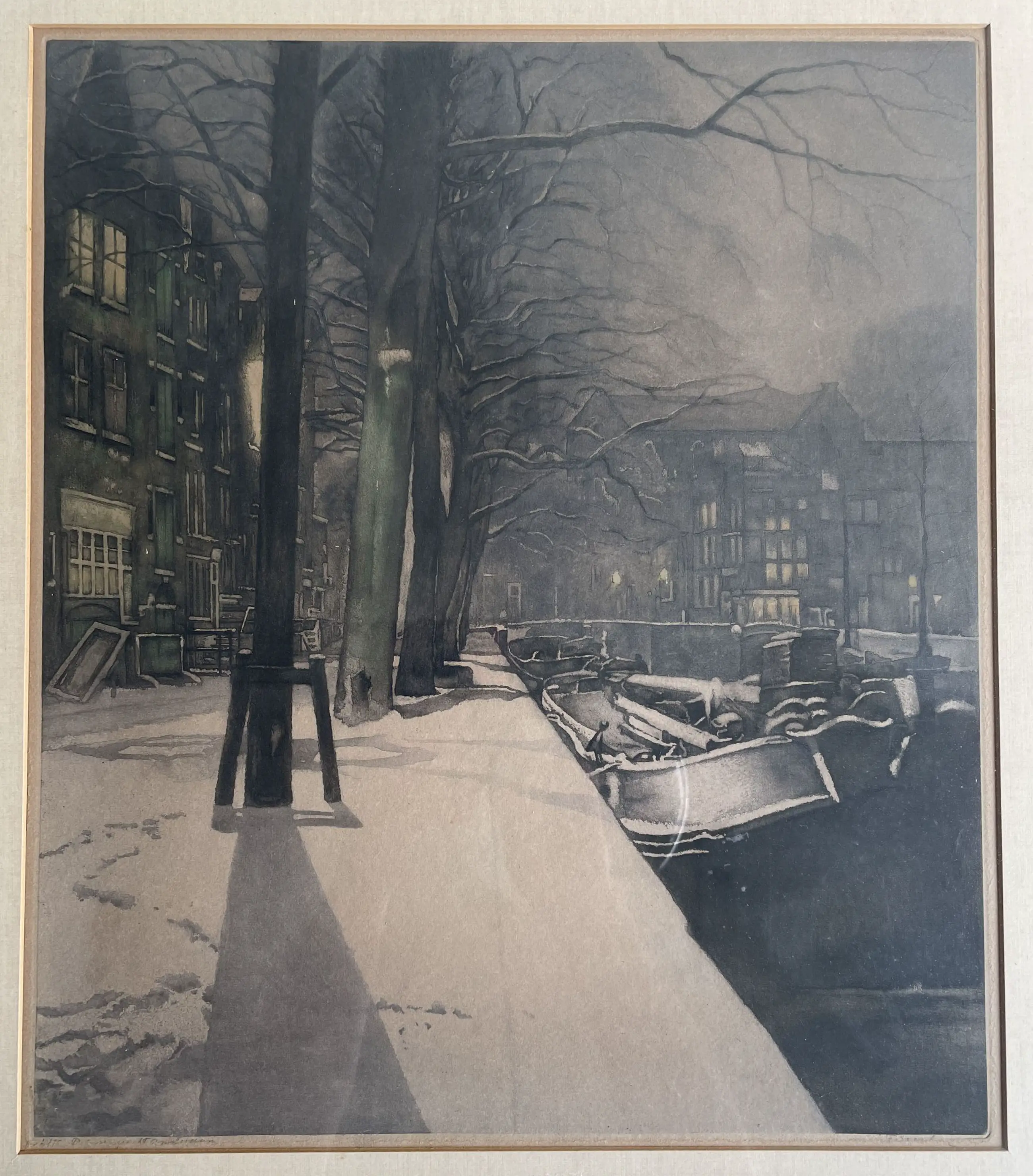 Zeer fraaie en sfeervolle kleurenets van Frans Everbag. Titel: Prinsengracht (Amsterdam) in de winter.
