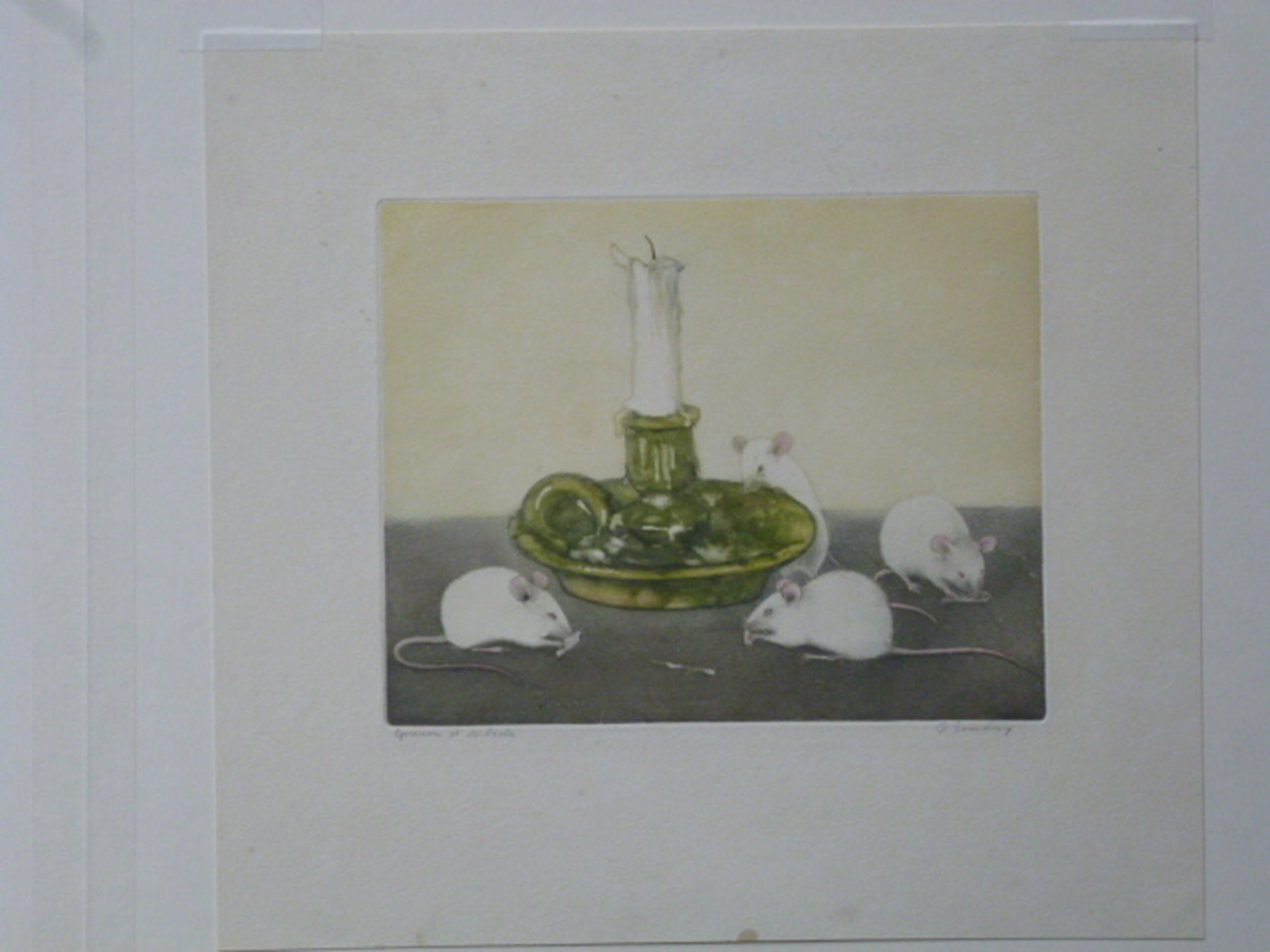 Kleurenets en aquatint. Potlood gesigneerd rechtsonder. Epreuve d;artiste linksonder.Beeldmaat 18 x 22,5 cm.