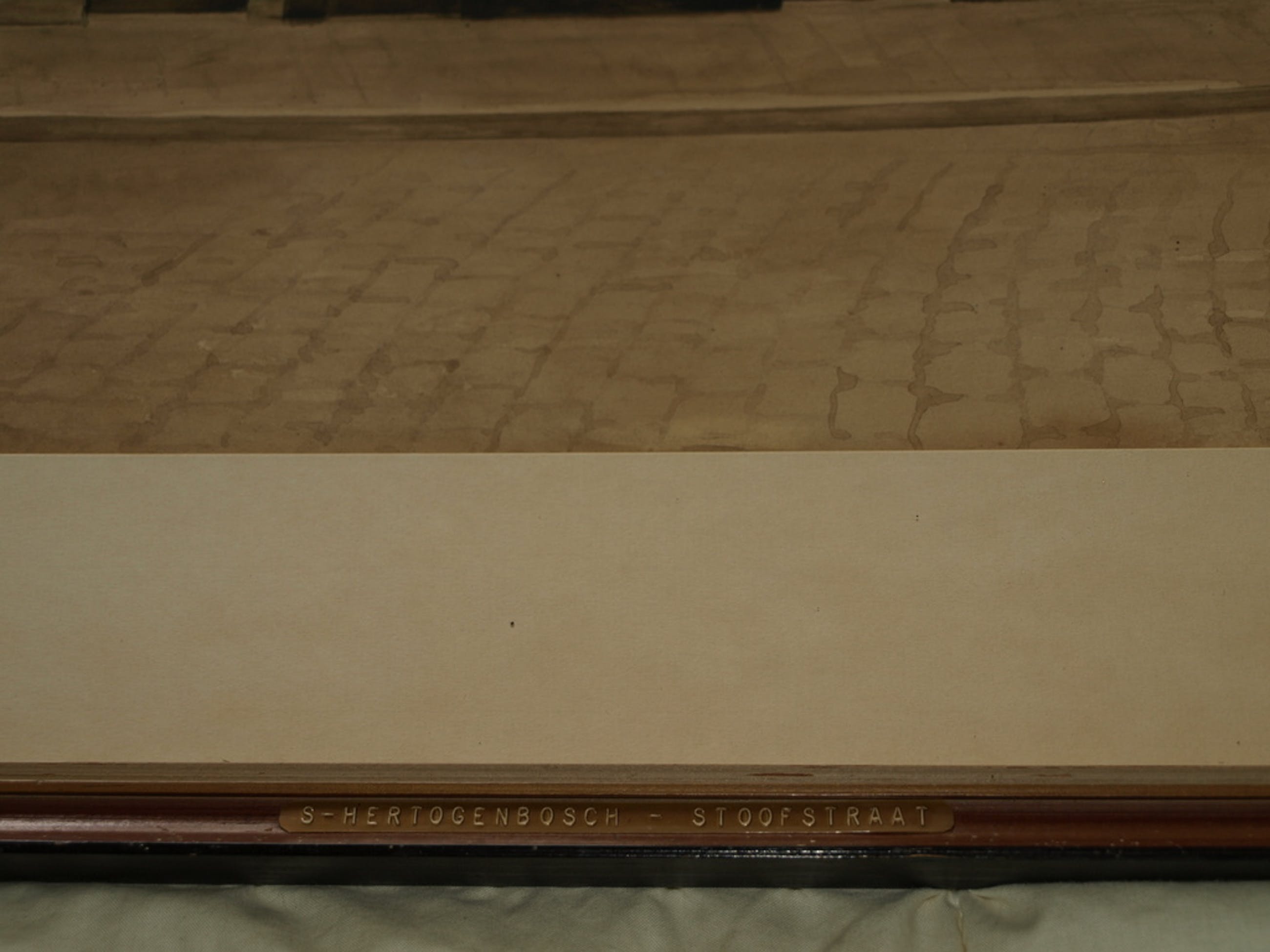 Gesigneerd en goed ingelijst in een houten lijst met passe-partout en glasplaat. Aan de onderrand van de lijst is een koperen naambordje bevestigd met de titel van het werk : “s-Hertogenbosch Schoofstraat”