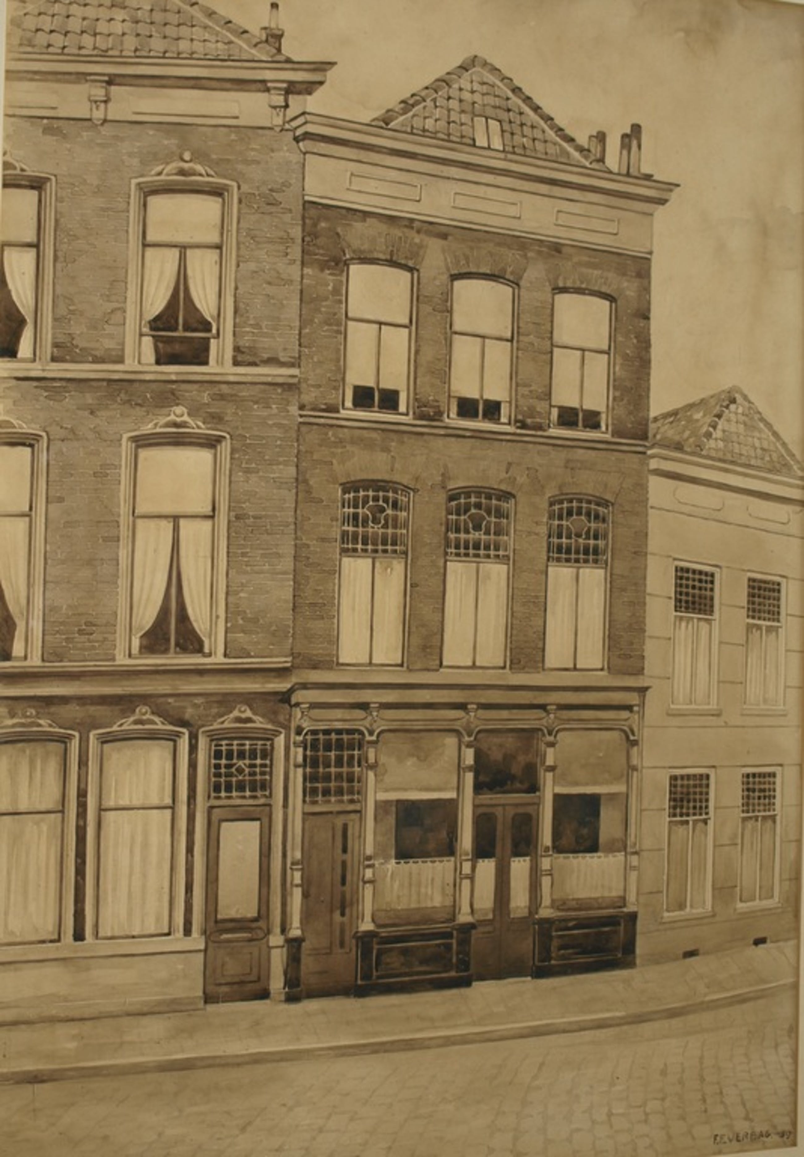 Een zeer grote en bijzondere aquarel van de Nederlandse kunstenaar Frans Everbag uit 1939 met een voorstelling van de Stoofstraat in ‘s-Hertogenbosch.