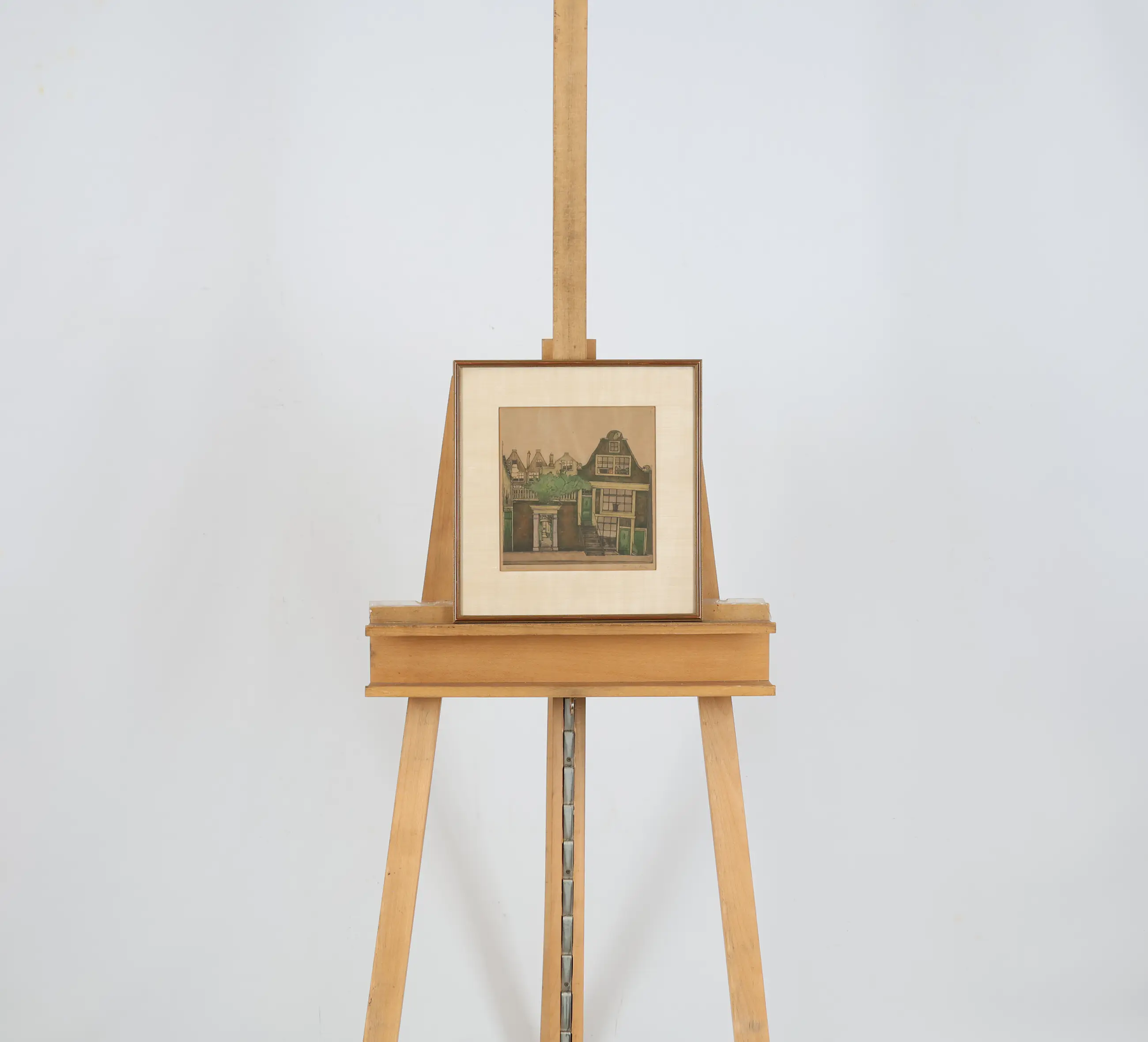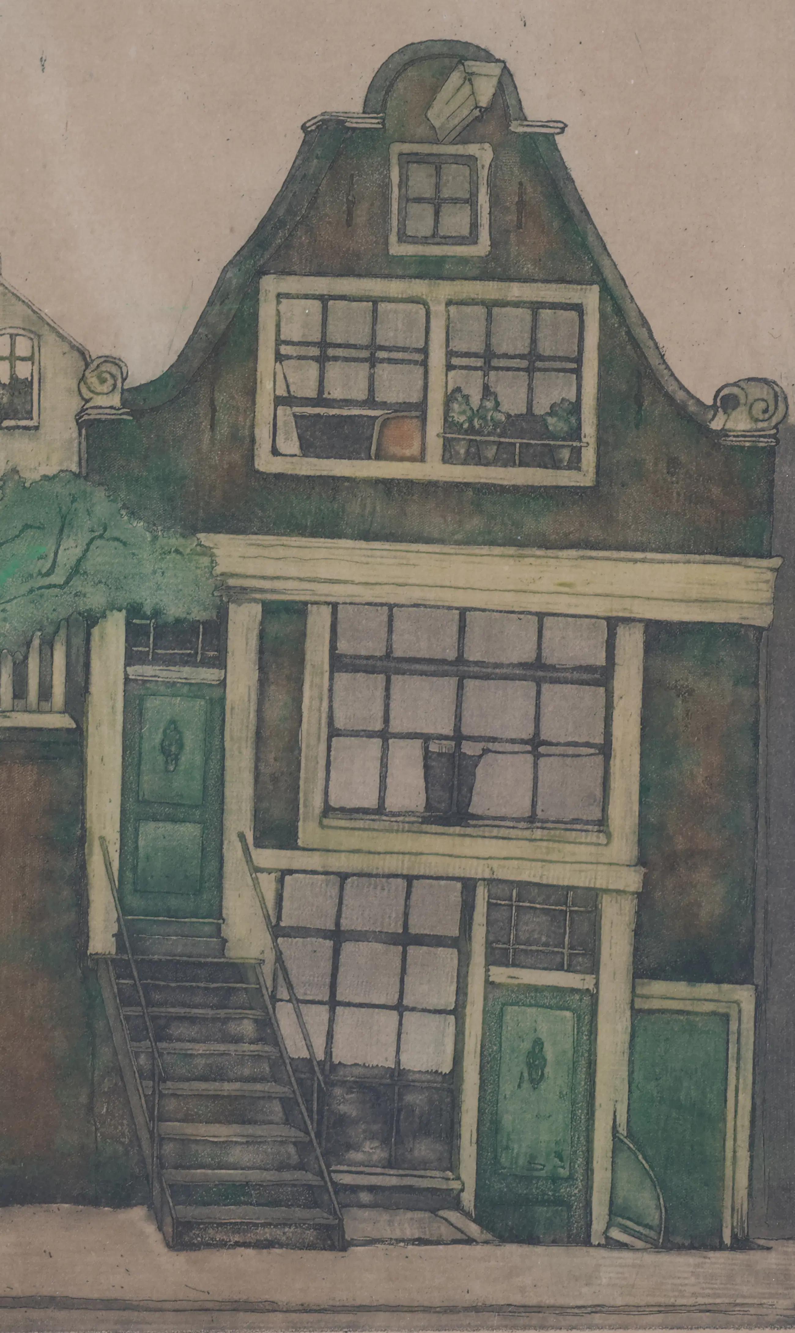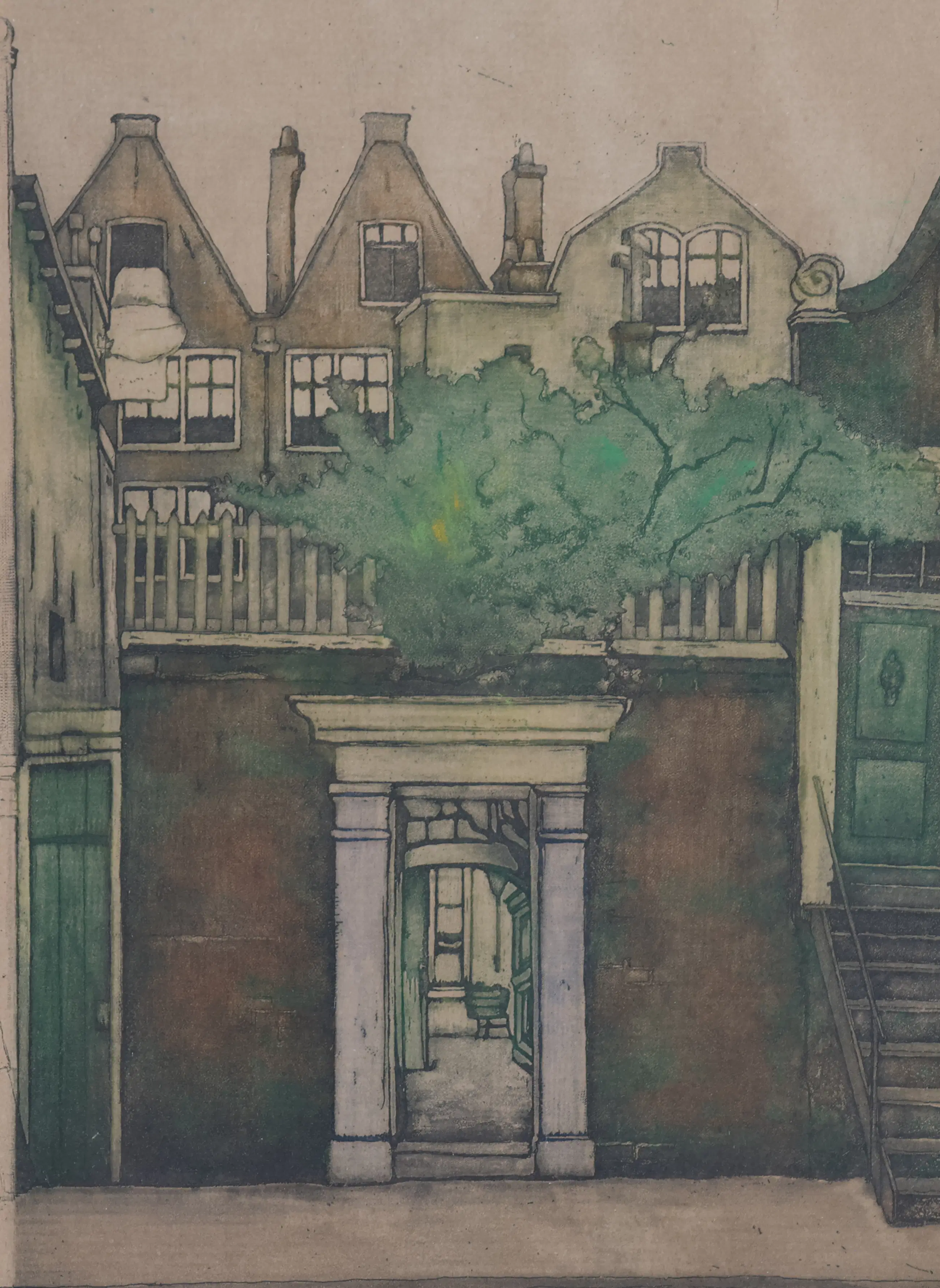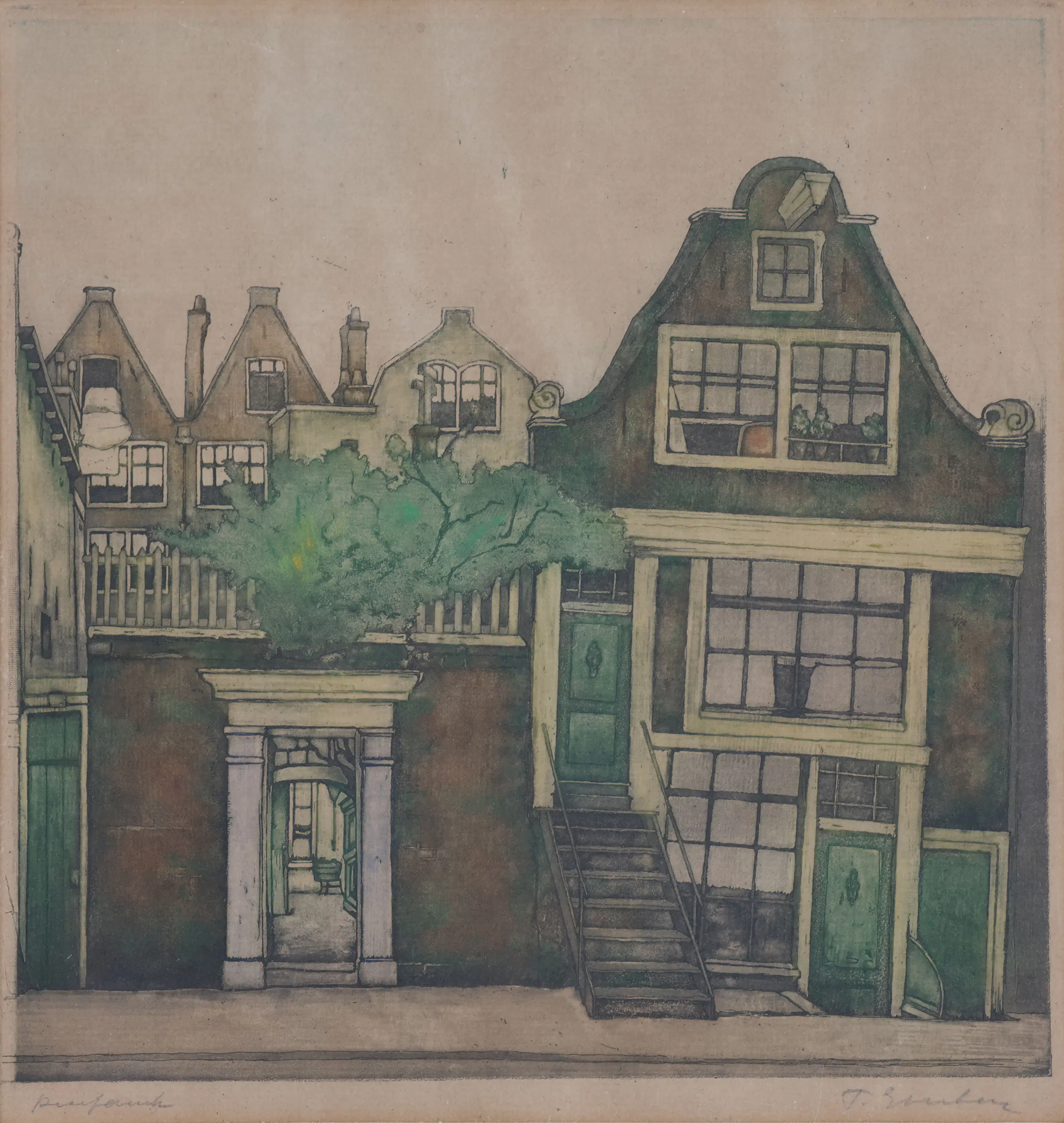 In deze ets vangt Everbag de karakteristieke charme van de Amsterdamse binnenstad: smalle huizen met trapgevels, scheefgezakte kozijnen en verweerde bakstenen die de tand des tijds tonen. Door het zachte kleurgebruik en de subtiele groen- en bruintinten ontstaat een ingetogen, haast poëtische sfeer. De compositie, met zijn nadruk op de doorgang onder de poort en de trap naar de voordeur, nodigt de toeschouwer uit om de stad binnen te stappen — alsof de stilte van een vroeg ochtendmoment is vastgelegd.