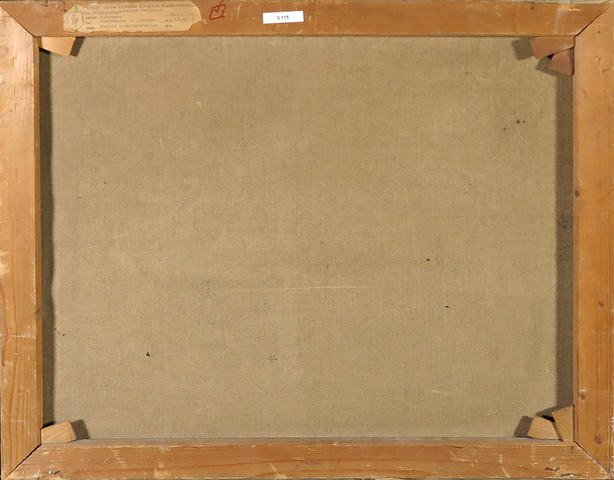 | Het doek zit niet al te strak om het spieraam. Langs de randen lichte slijtage van de verflaag. Aantal krassen in de verlaag. Paar kleine gaatjes langs de rand in het doek. | |