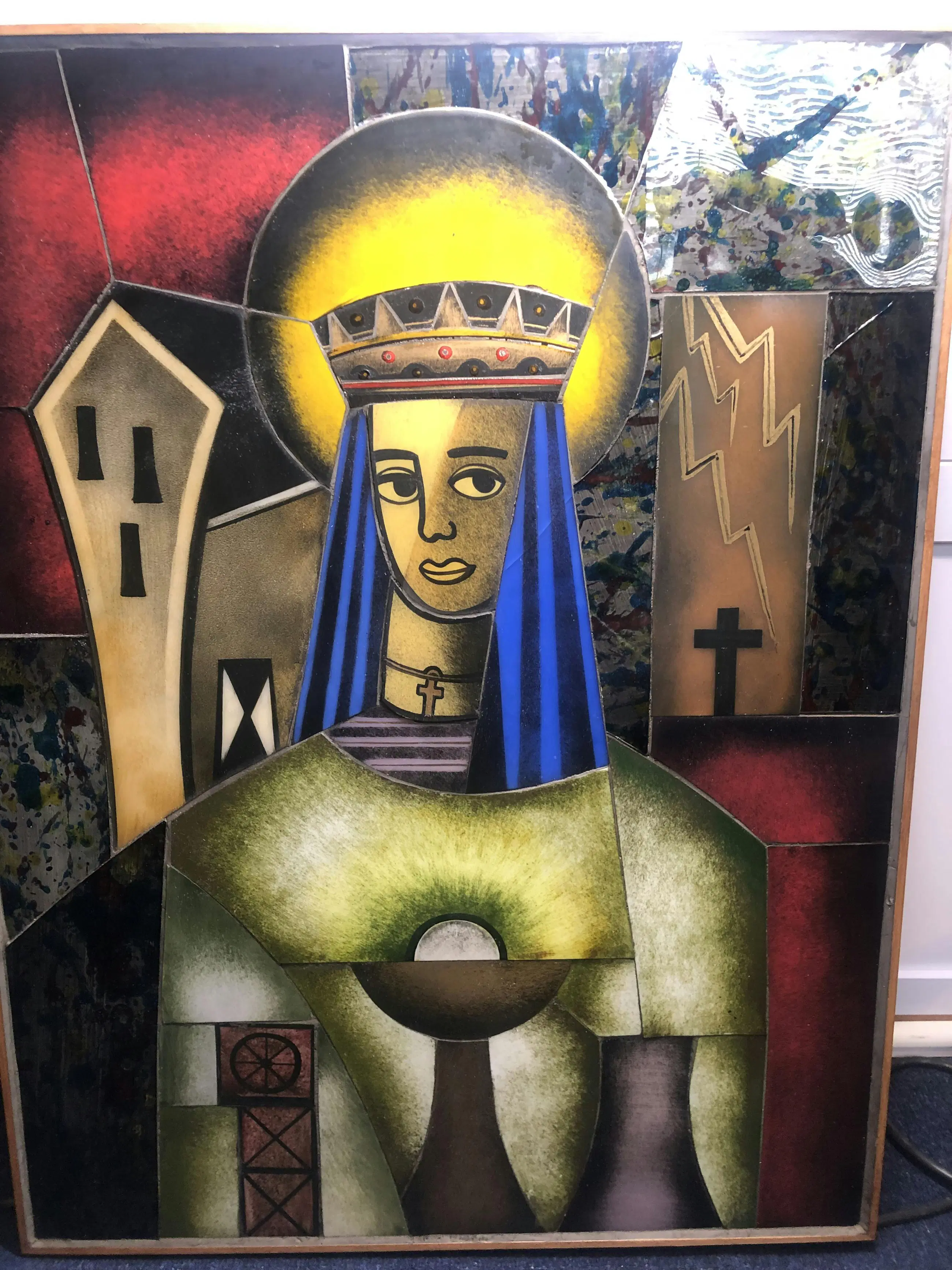 Prachtig schilderij van de kunstenaar Frans Heijnen uit Swalmen. Deze Madonna is gemaakt van opaline, gebrandschilderd glas op een houten paneel.