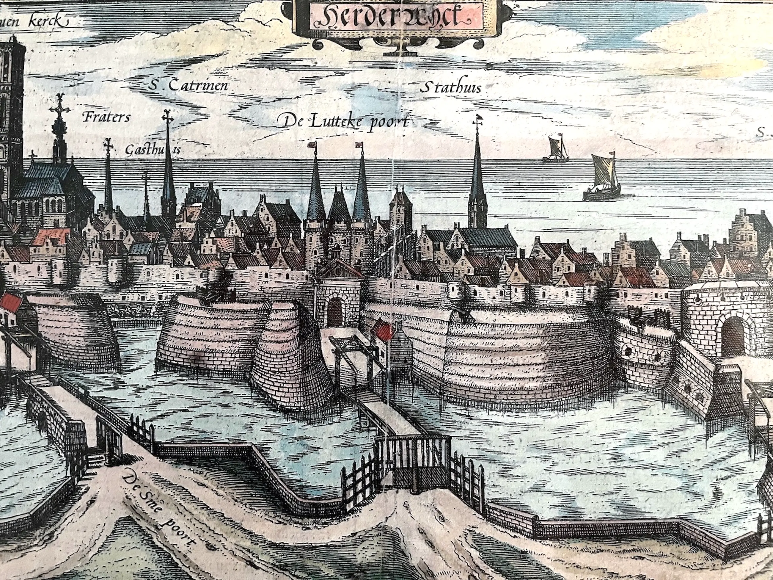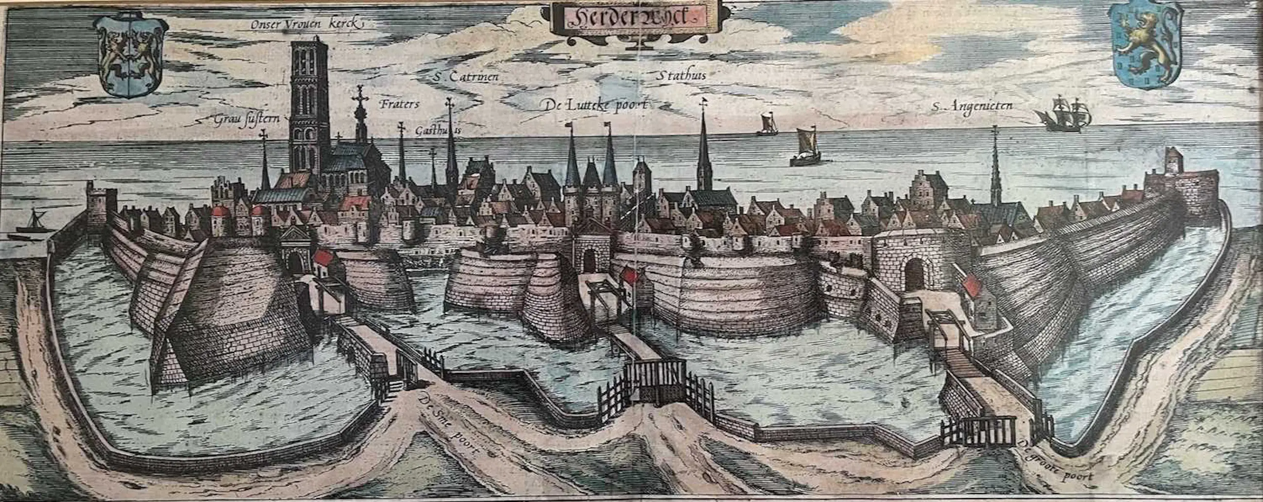 Herderwich' – gravure van Harderwijk vervaardigd in 1580 door de Brabantse cartograaf Frans Hogenberg (Mechelen 1535 - Keulen 1590) en gepubliceerd in de stedenatlas 'Civitates orbis terrarum', een uitgave van Frans Hogenberg en de Duitse cartograaf Georg Braun (Keulen 1541-1622). Deze gravure is ook afgebeeld in het door de Harderwijker auteur Jos Kunne geschreven boek 'Het gouden hart van de stad – Het Oude Stadhuis van Harderwijk', verschenen in 2019.