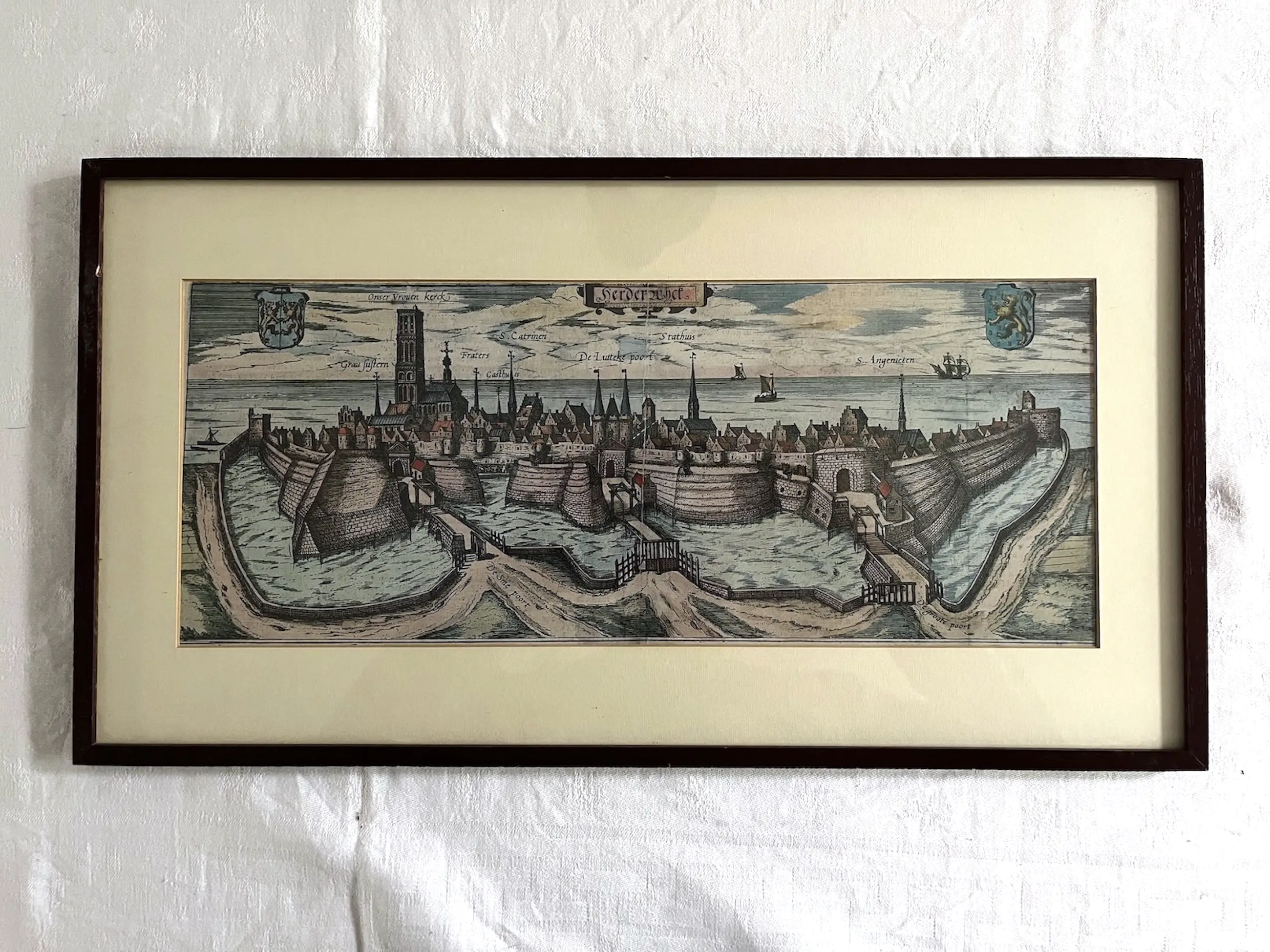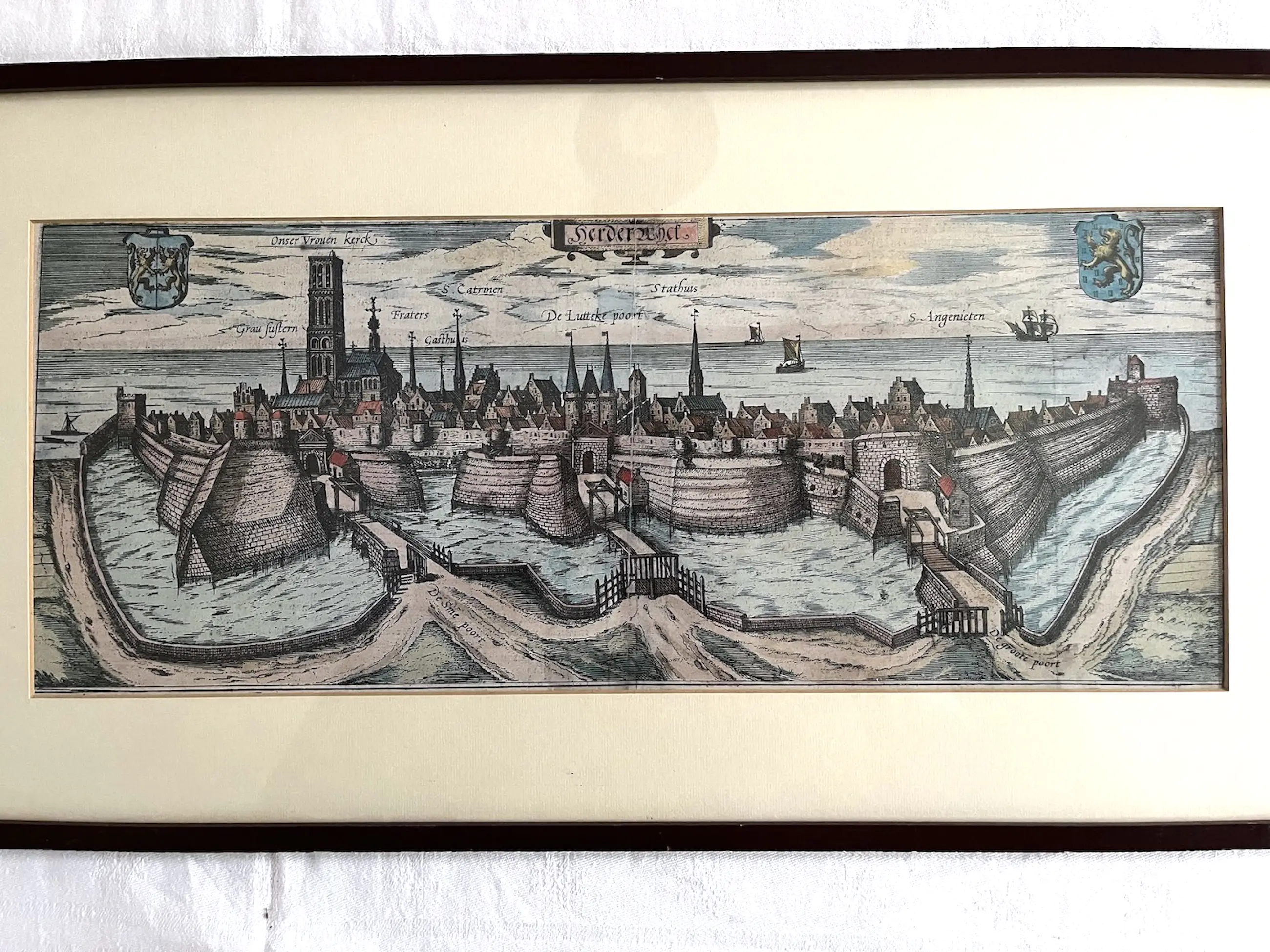 D2 69 Frans Hogenberg Herderwich' – gravure van Harderwijk Handgekleurde gravure 1580 18 x 45 cm 30 x 55 cm