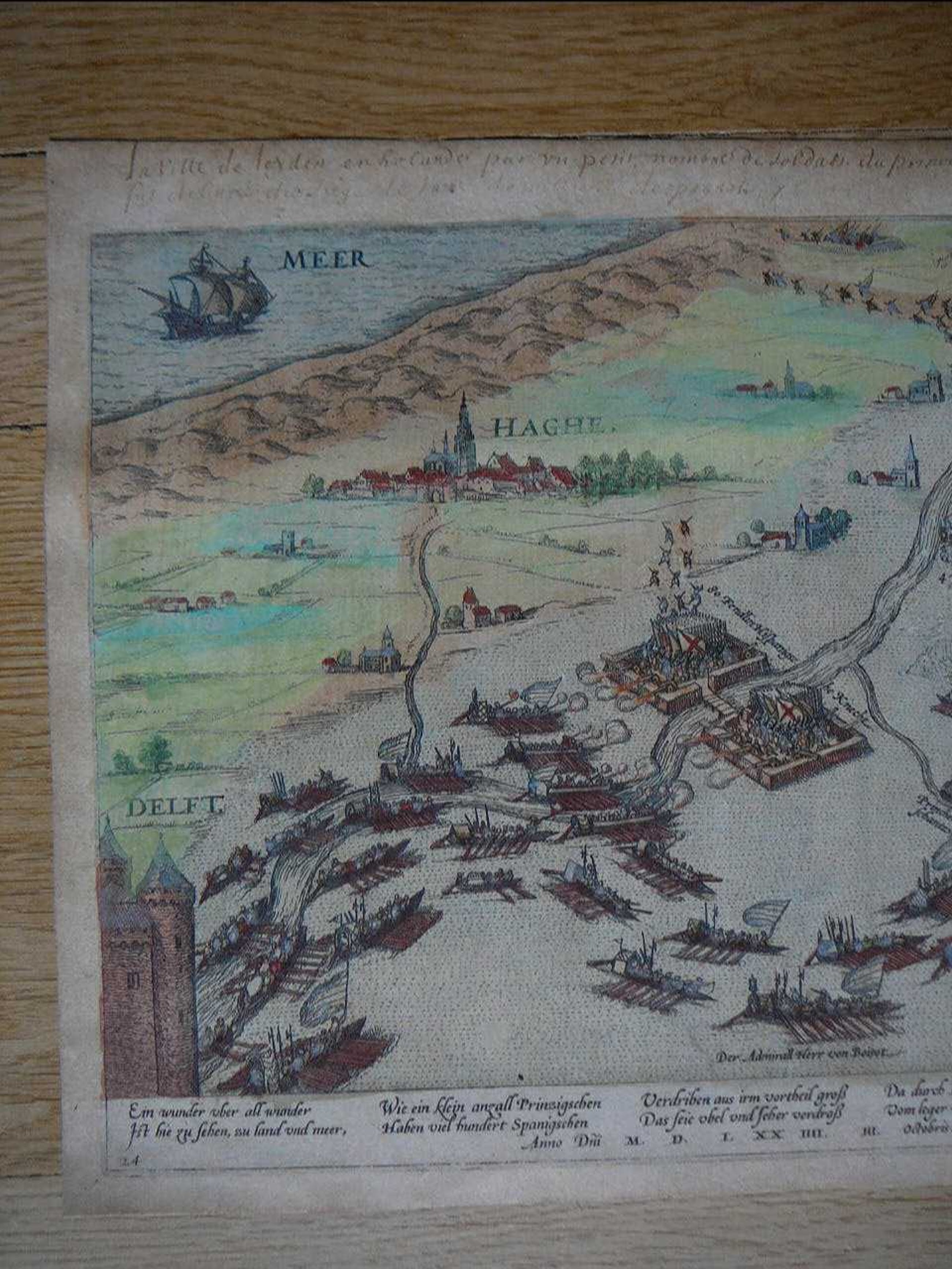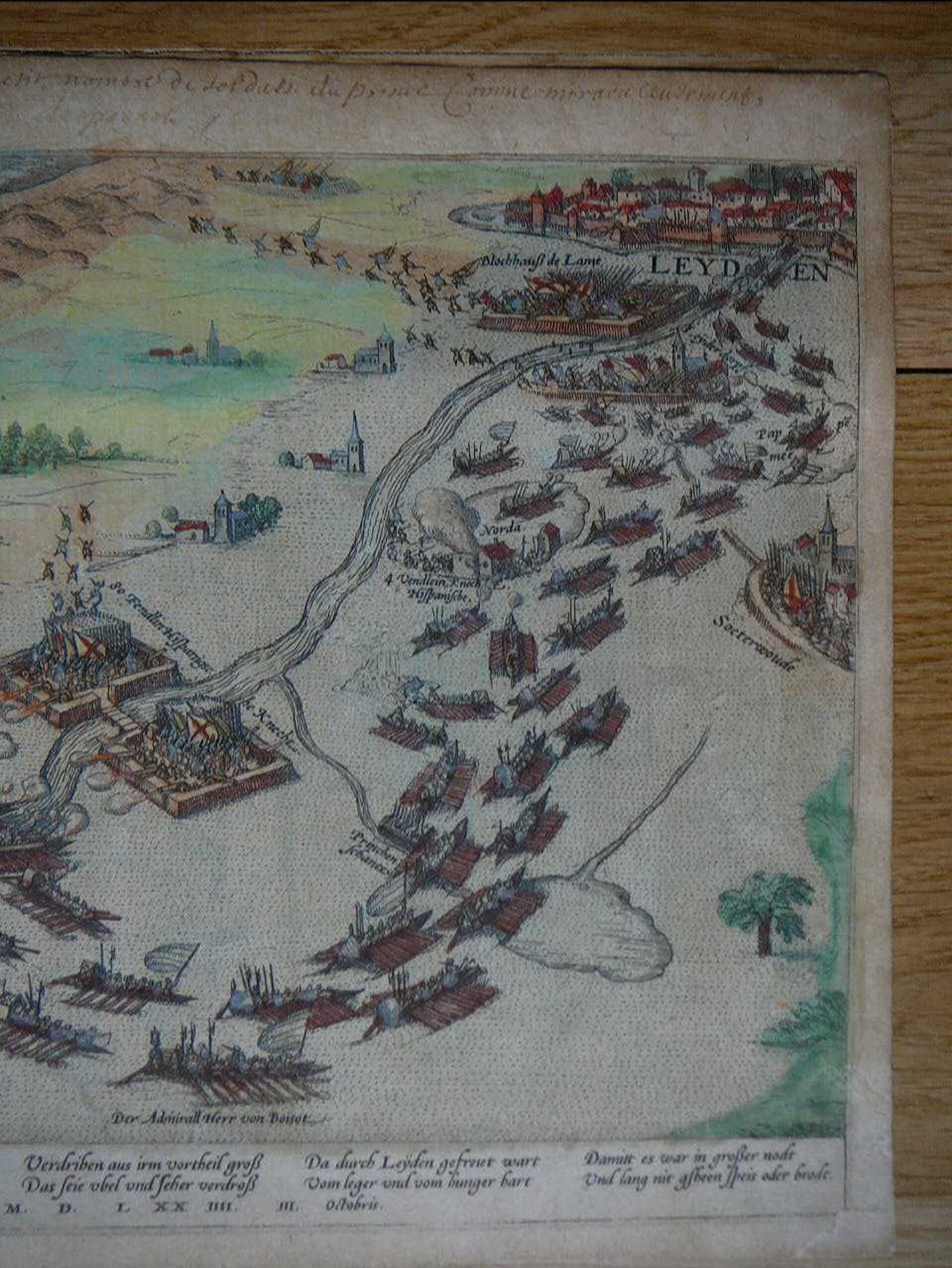 Oude ingekleurde gravure van HET ONTZET VAN LEIDEN in 1574 door Frans Hogenberg Aan de bovenkant is er met potlood tekst geschreven De gravure is op professionele wijze gedoubleerd met japans papier in de plaat Der Admirall Herr von Boisot De plaatsen Leiden, Delft, Den Haag, Zoeterwoude Afm papier 25 x 31,5 cm