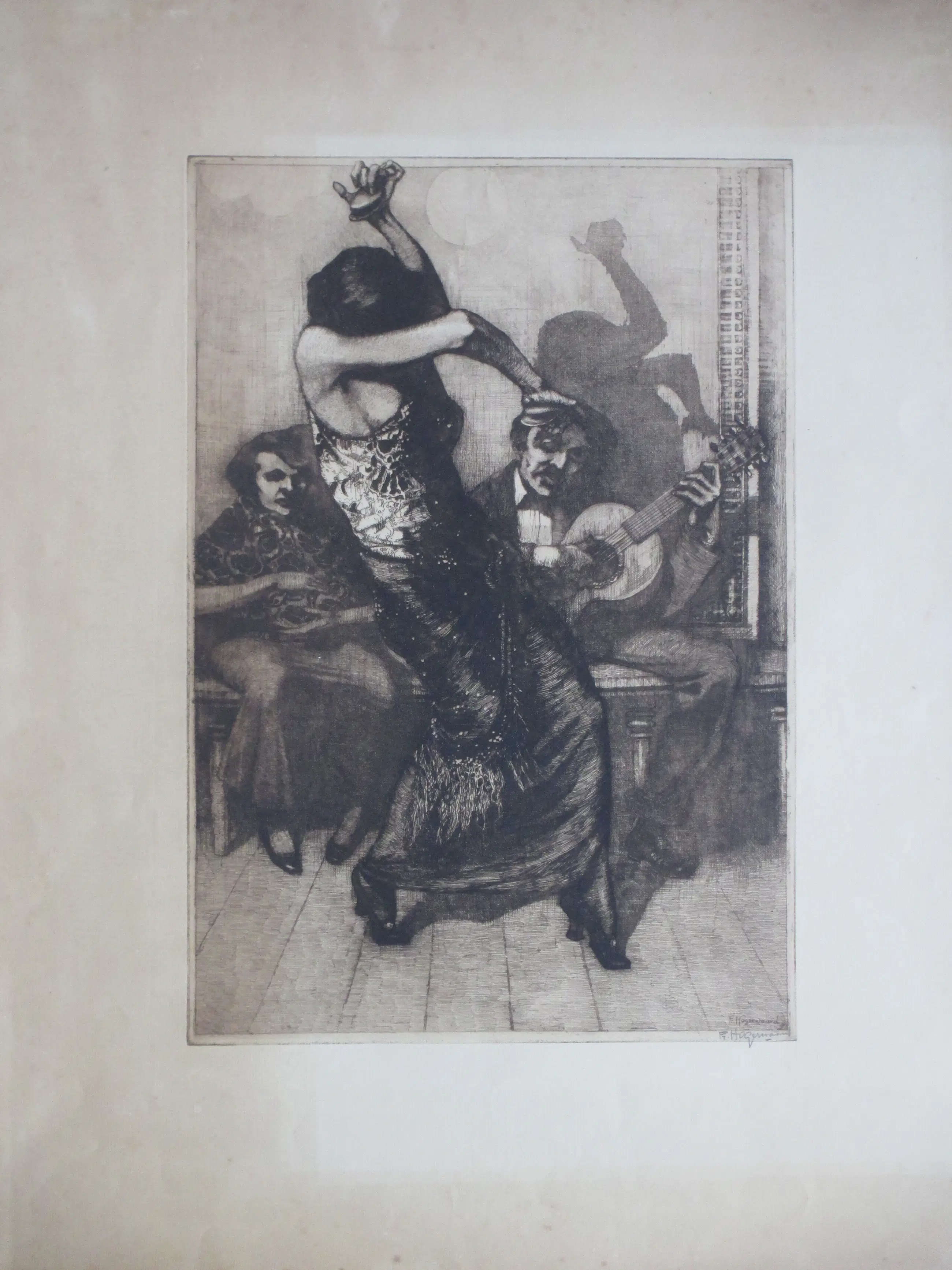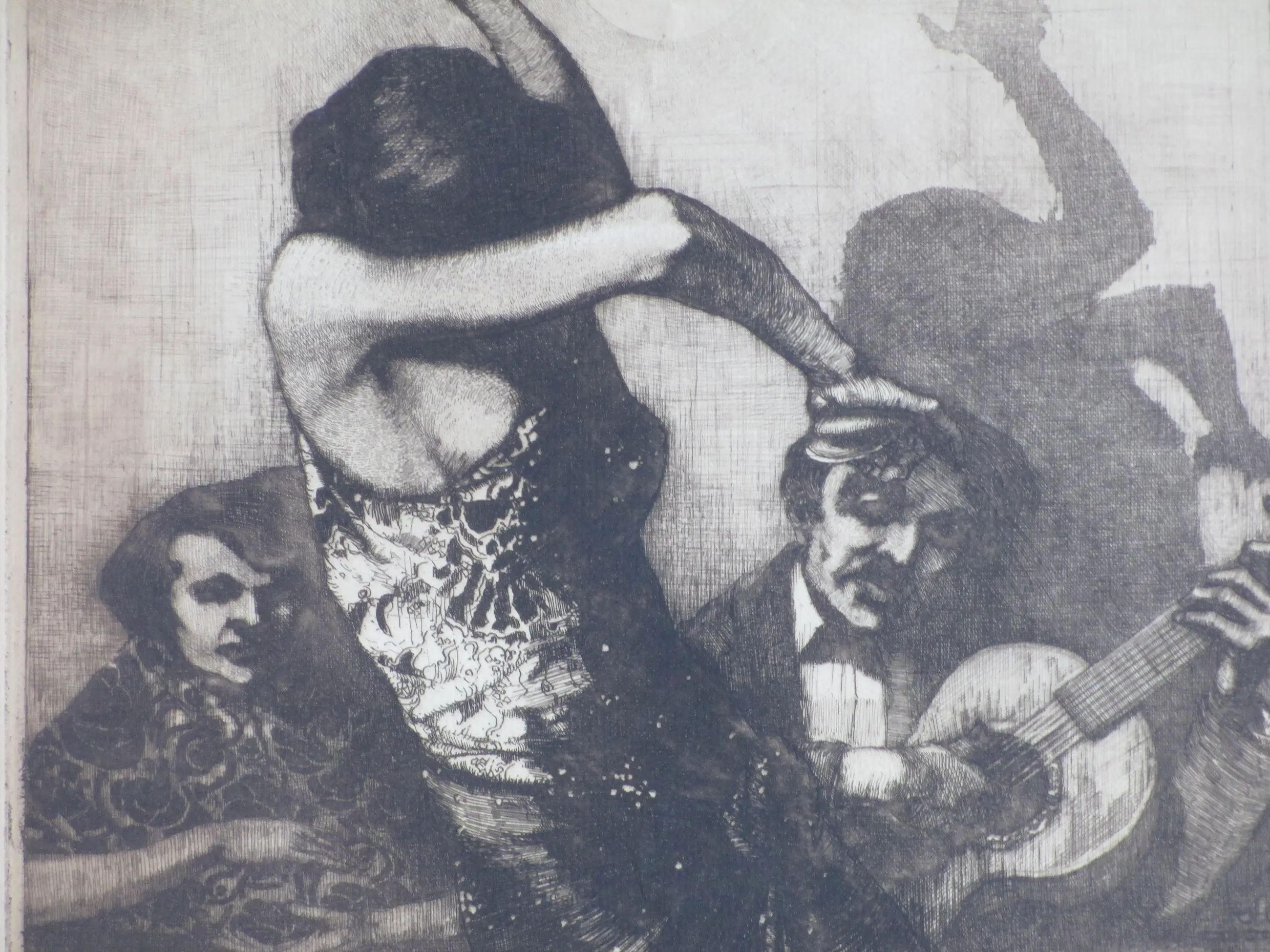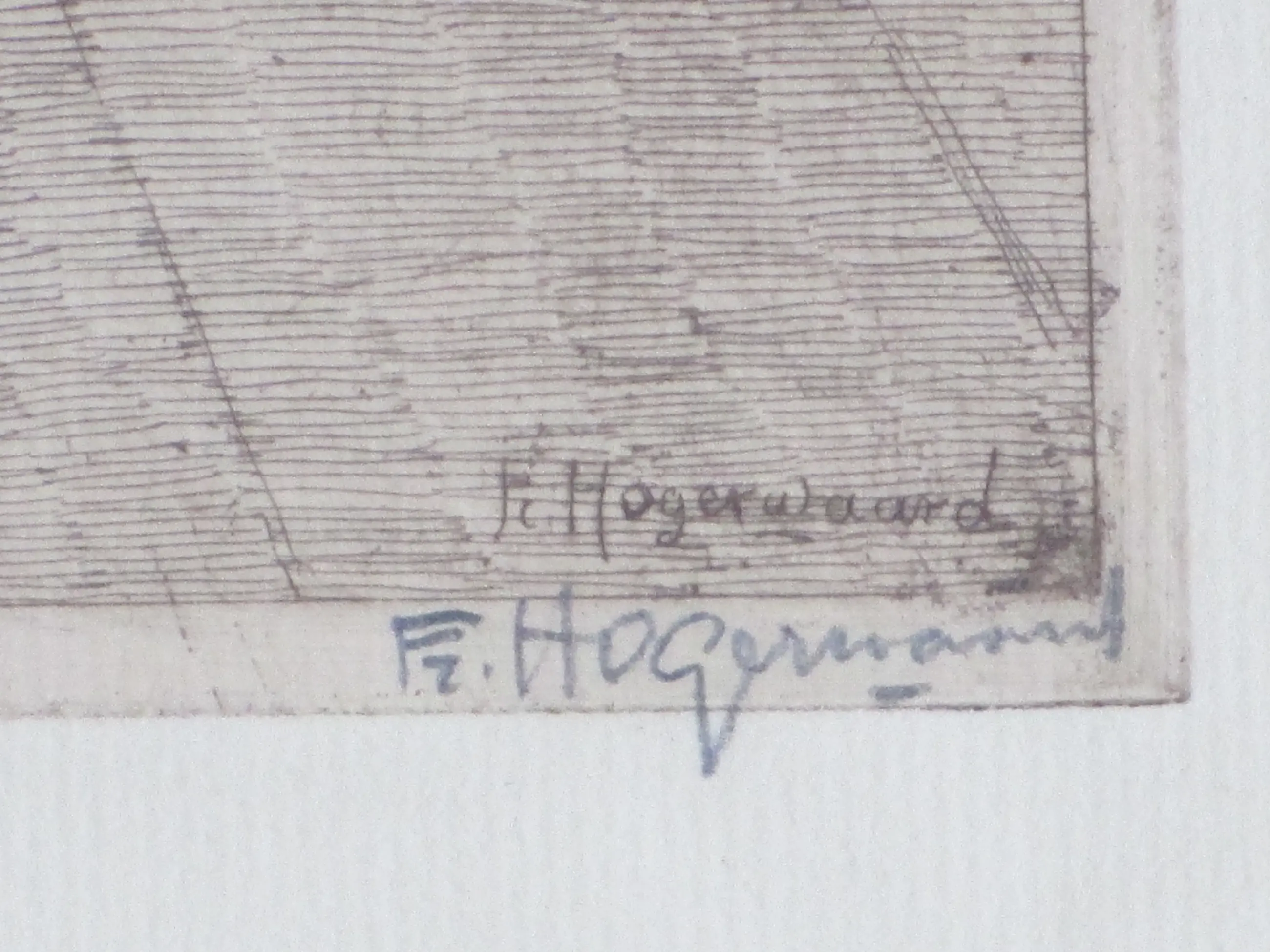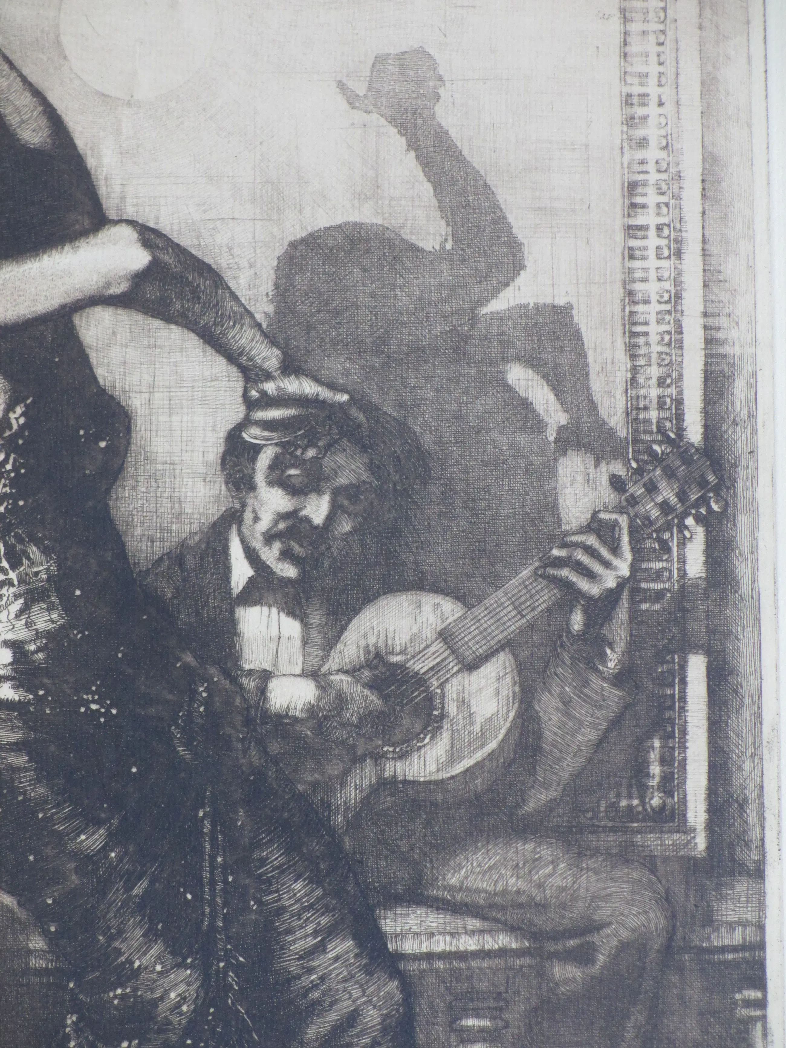 Fraaie compositie in ets door Frans Hogerwaard Voorstelling van een Spaanse flamencodanseres met muzikanten op de achtergrond Losbladig, beeldmaat 44x30, bladmaat 65x50 Gesigneerd in potlood r.o.: 'Fr. Hogerwaard' Tevens gesigneerd r.o. in de druk