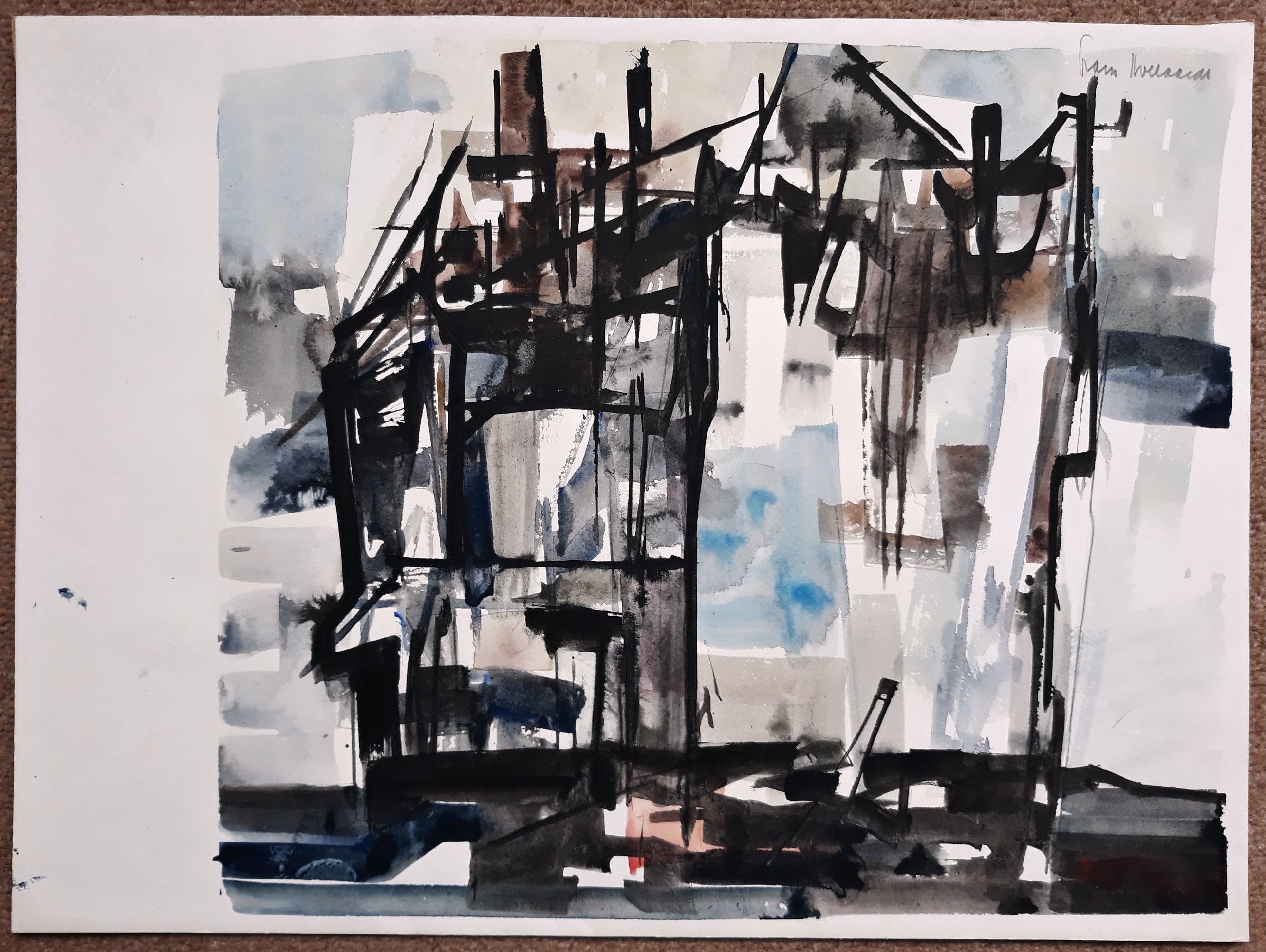 Karakteristiek industrieel landschap van Frans Hollaardt. Aquarel op papier, voluit gesigneerd rechtsboven, te dateren midden tot eind jaren 50. In goede conditie; blad heeft ingelijst gezeten want er zitten taperesten langs de randen aan de achterkant. Opnieuw ingelijst met passe-partout is het werk uitstekend. Herkomst: privé collectie. Dit werk is ook te zien op de site www.francoishollaardt.eu (zie laatste foto).