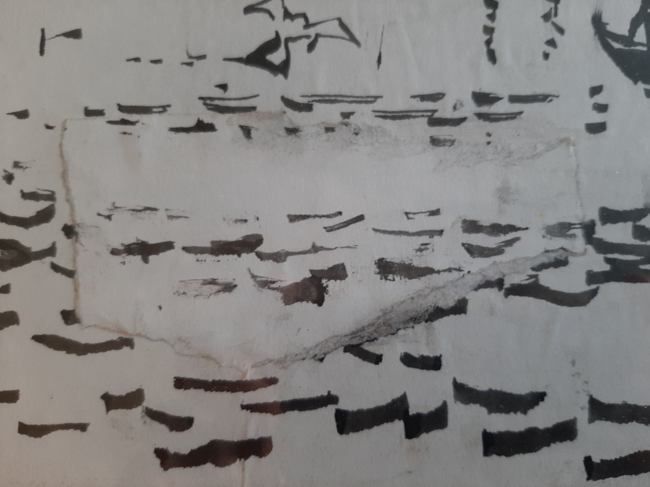 Het lijkt of er scheuren in het werk zitten, dit is niet zo! Hij heeft op verschillende plekken (mogelijk over fouten) papier geplakt en daar weer op gewerkt.