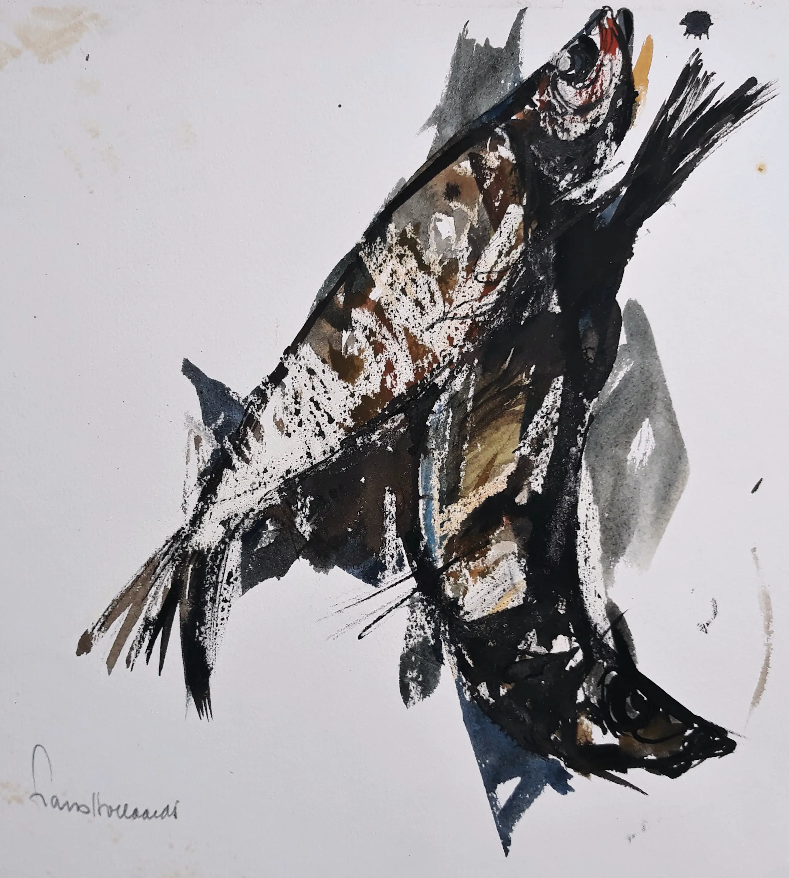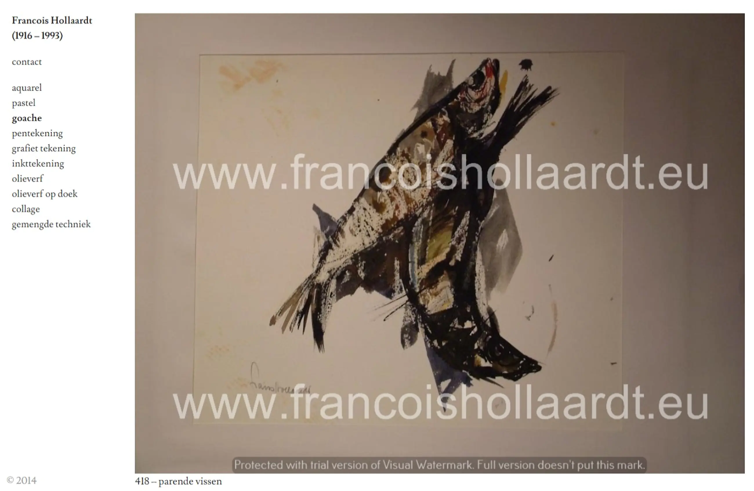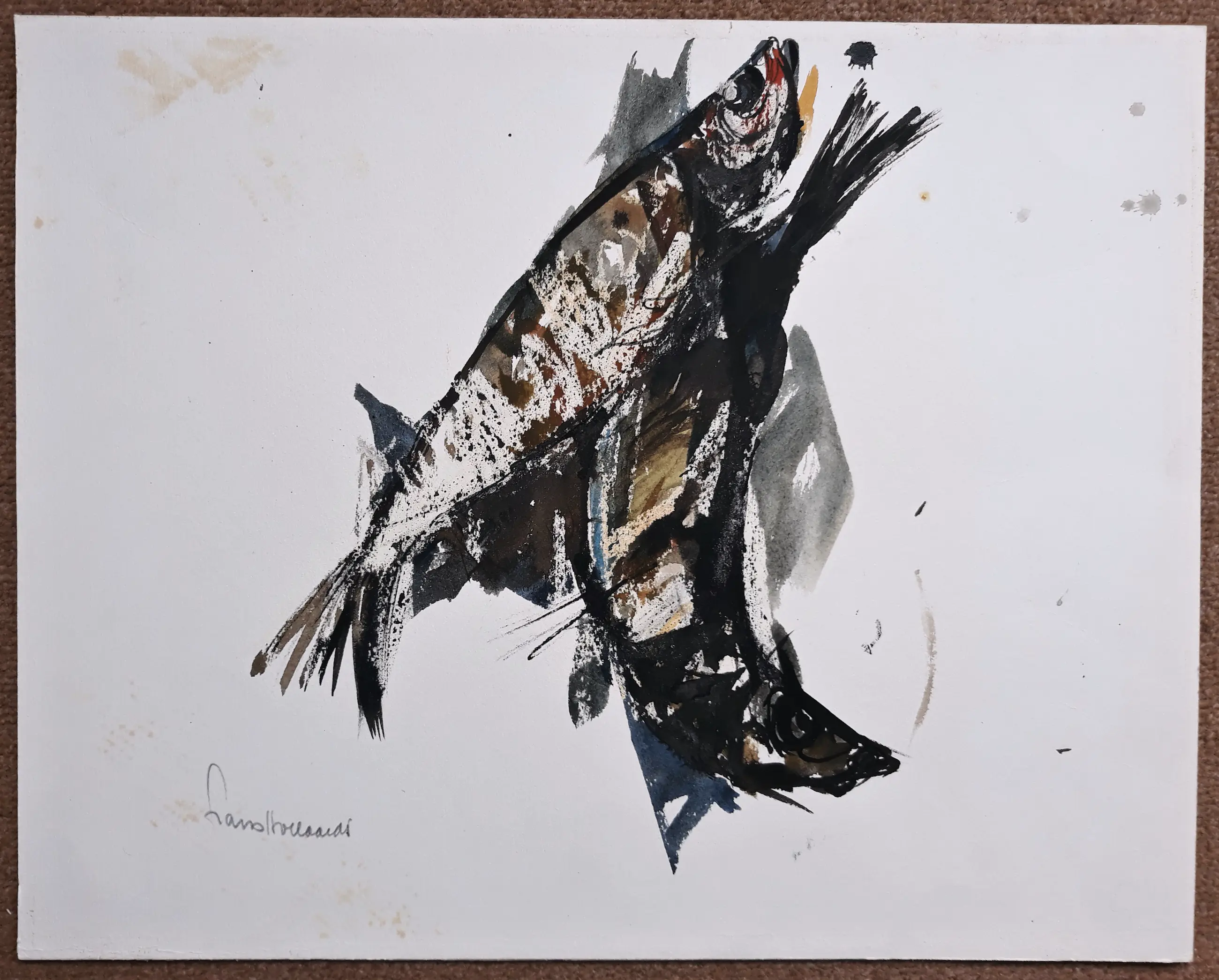 Karakteristiek werk van Frans Hollaardt. Gouache op papier, voluit gesigneerd linksonder, te dateren midden tot eind jaren 50. In redelijk goede conditie. Herkomst: privé collectie. Dit werk was te zien op de site www.francoishollaardt.eu onder nummer 418 (parende vissen).