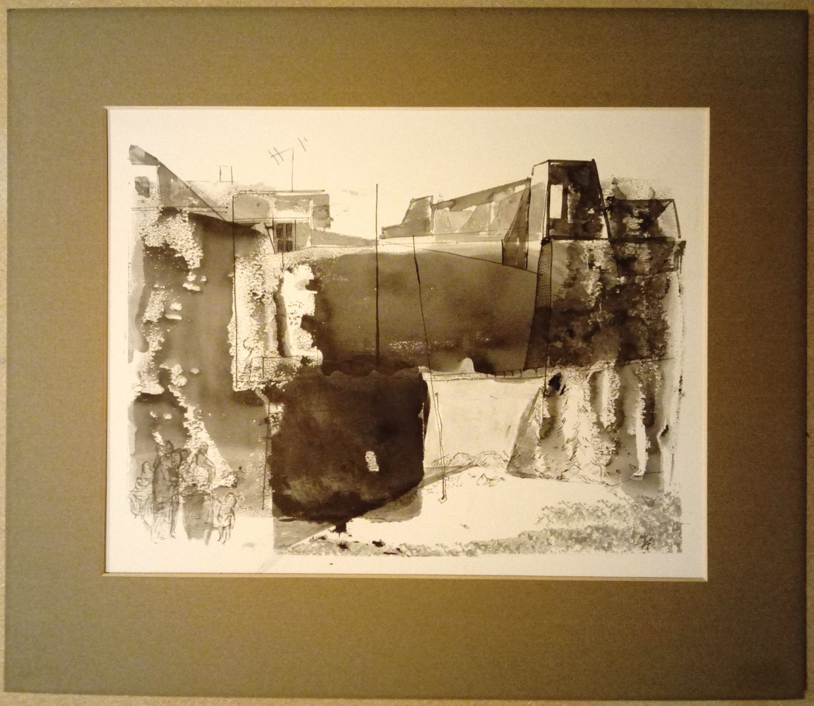 Het aquarel is 54 cm x 39 cm, het karton waarop het geplakt is heeft de afmetingen 60 cm x 51,5 cm. Het thema van dit kunstwerk is uiterst actueel en toont gevluchte mensen in een stadse omgeving. Gesigneerd met monogram fH (frans/francois Hollaardt).