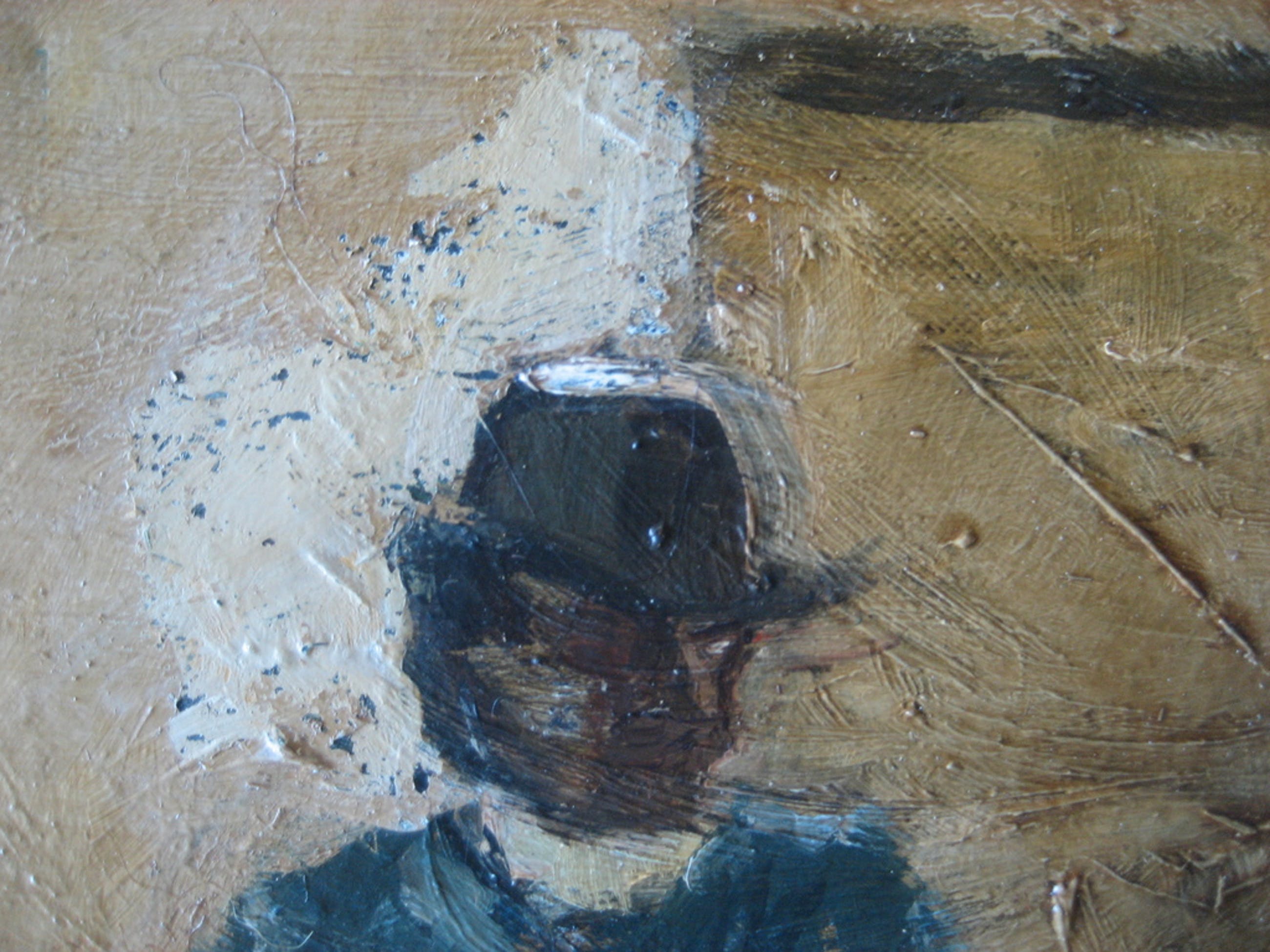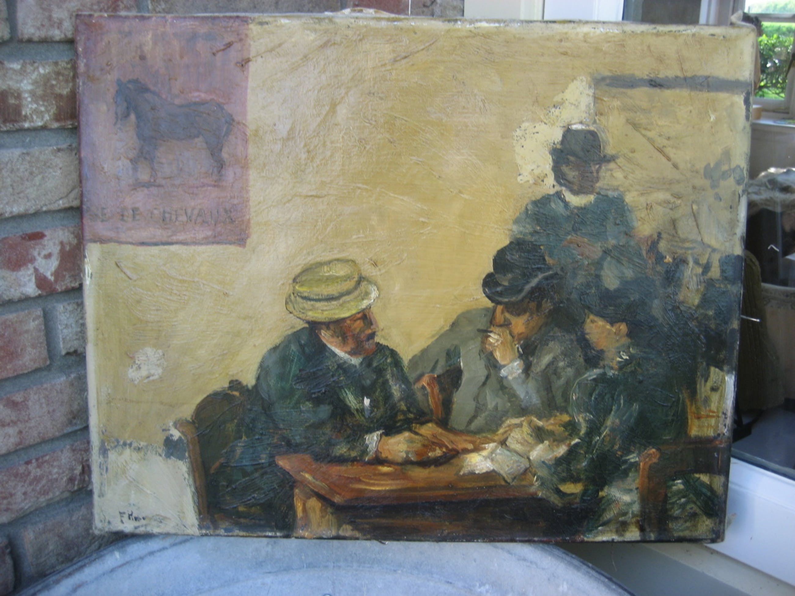 Dit schilderij verkeert niet in erg goede staat.Er is een poging gedaan tot verwijdering van de bruine oppervlaktelaag.Dit is op enkele plekken gelukt maar daarna gestaakt.De onderliggende verflaag is op enkele stukjes na intakt De signatuur lijkt van F.Hoos te zijn.Ik heb geen verdere expertise(zie foto's).Het doek is niet beschadigd.Het is dus een restauratie object.Gezien vorengaande is de beginprijs op 1 euro gezet .