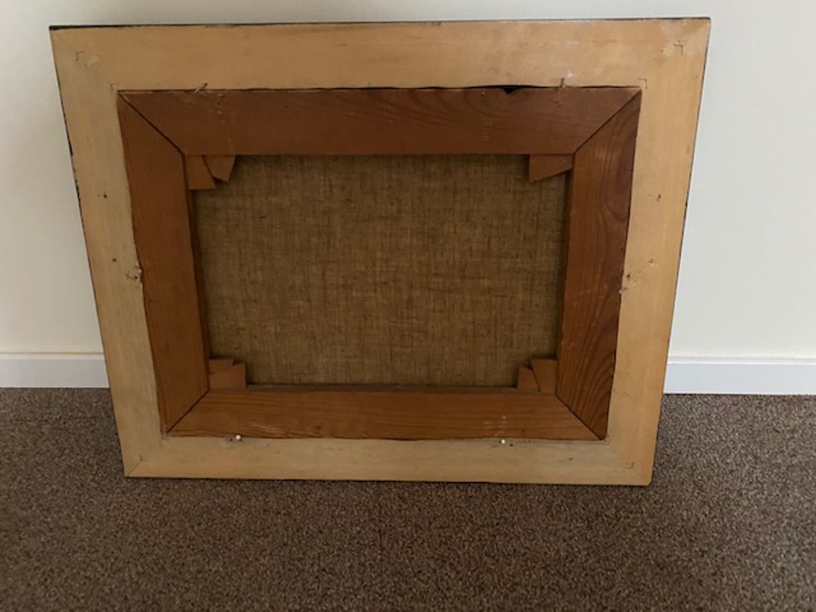 het schilderij is gekaderd in een zwart gelakte houten lijst welke licht beschadigd is.
