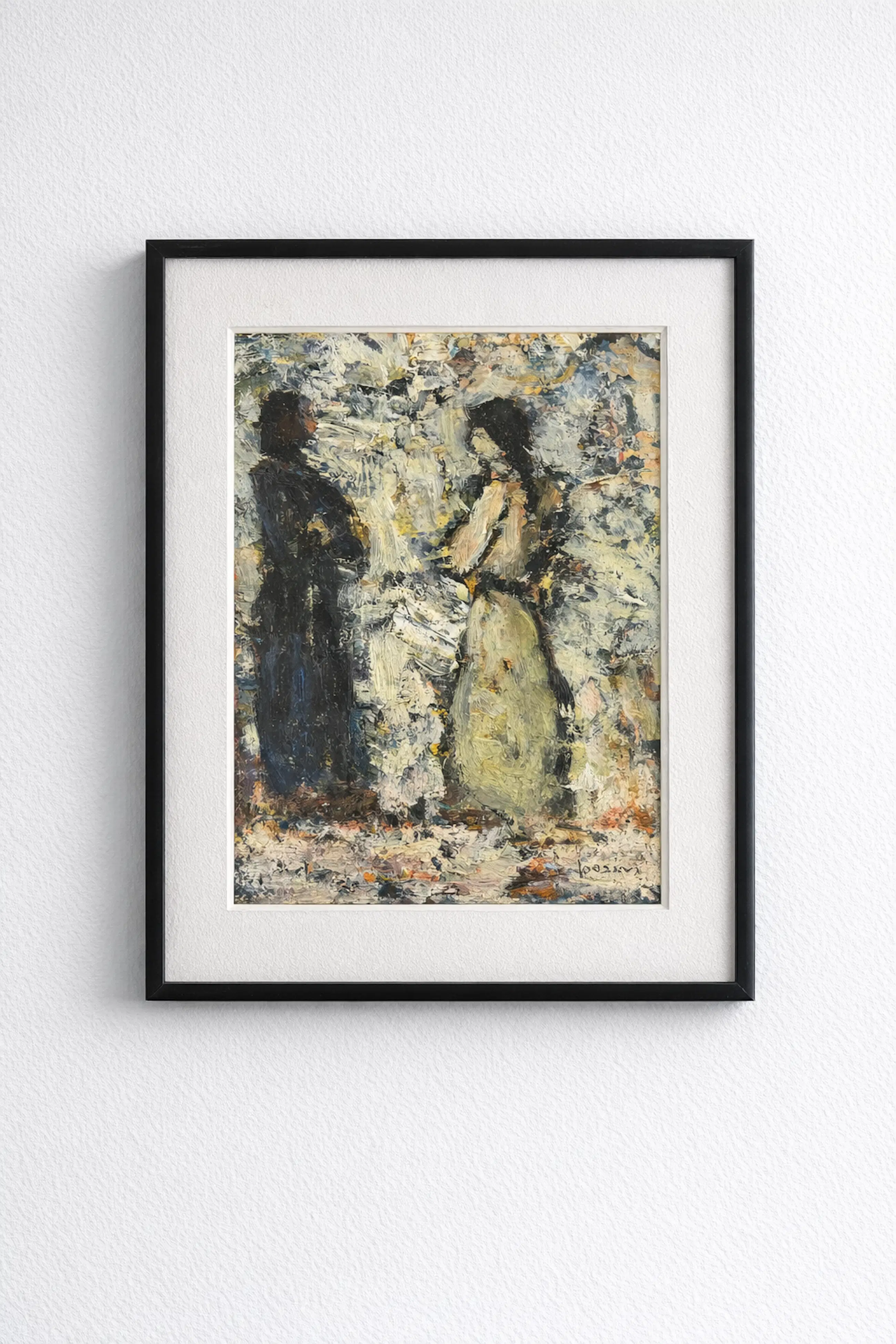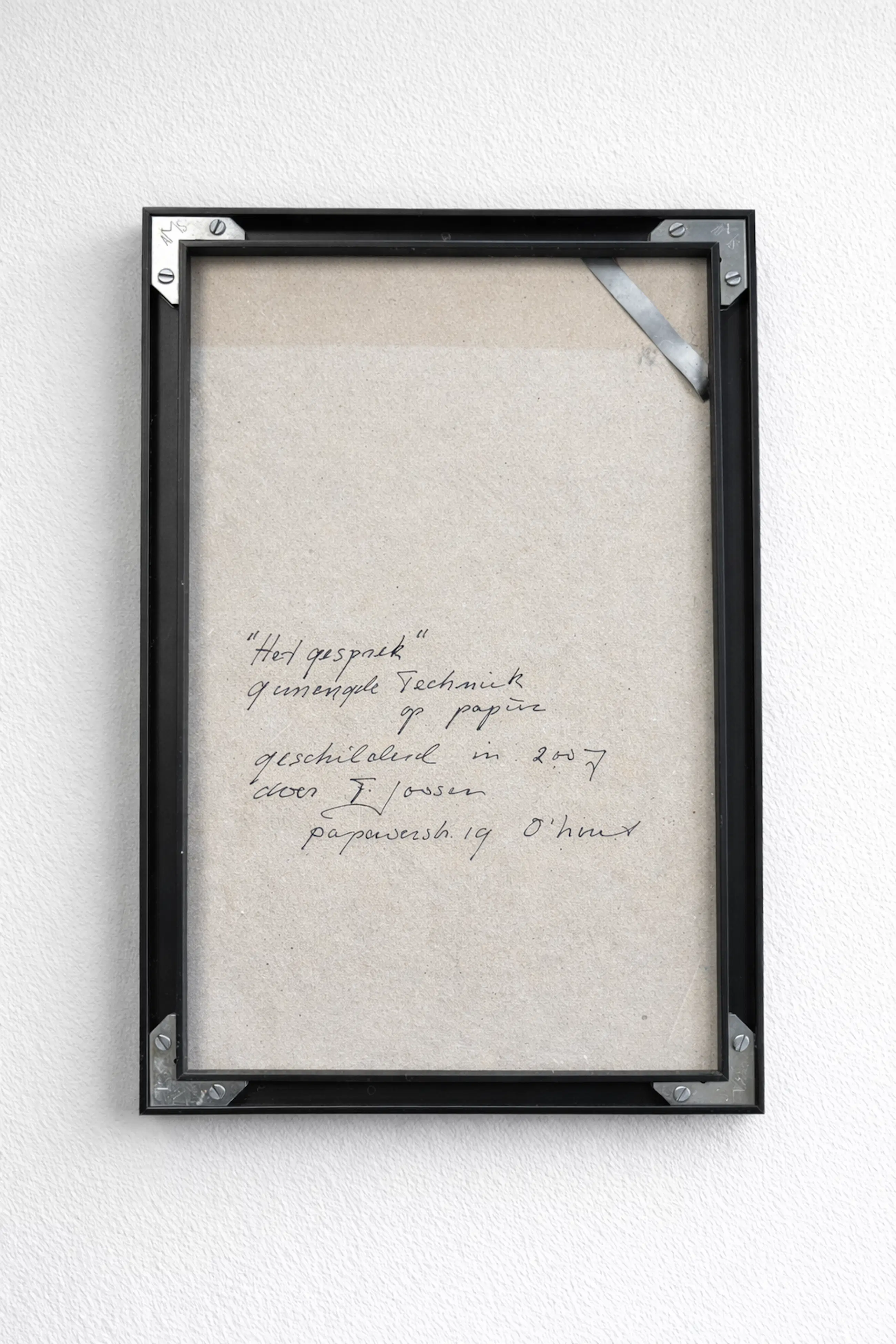 Origineel kunstwerk van Frans J. Joosen (1932–2021), getiteld Het gesprek, vervaardigd in 2007. Het werk is uitgevoerd in gemengde techniek op papier en toont een expressieve, figuratieve voorstelling van twee figuren in interactie. De losse penseelvoering en gelaagde structuur geven het werk een sterke emotionele lading en dynamiek.