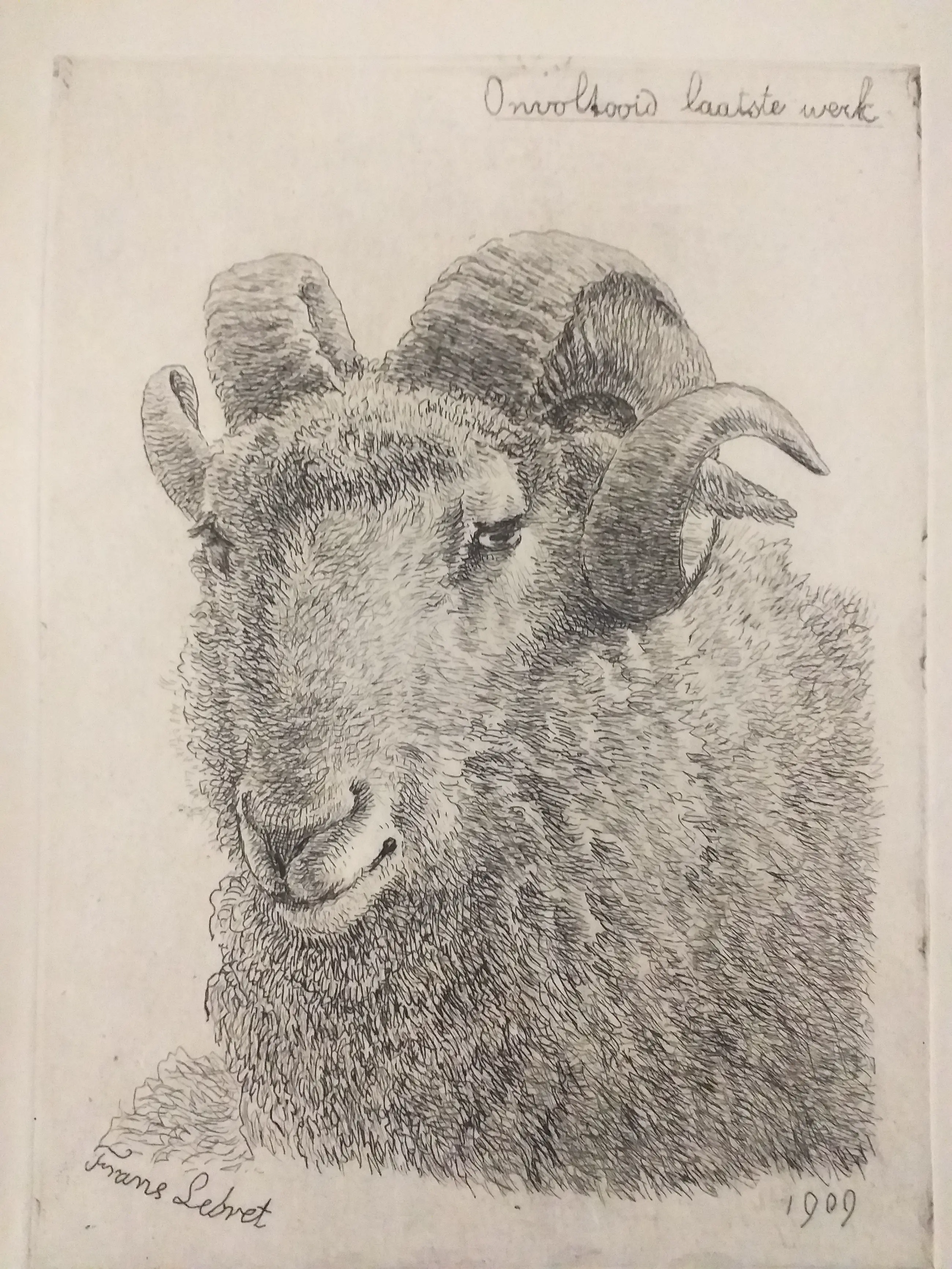 Gedateerd in 1909 en gesigneerd met Frans Lebret. Tevens staat er een vermelding op: onvoltooid laatste werk.