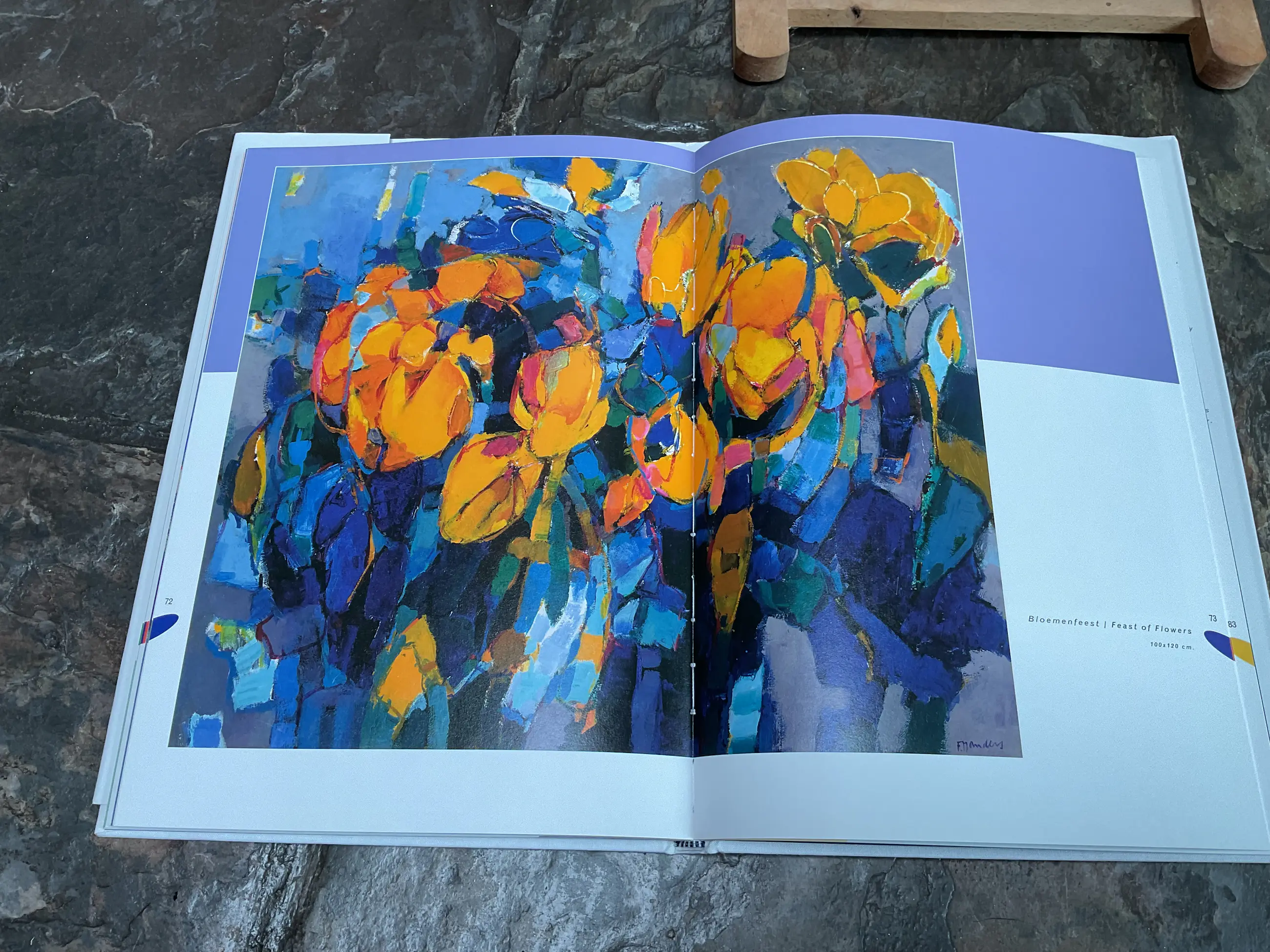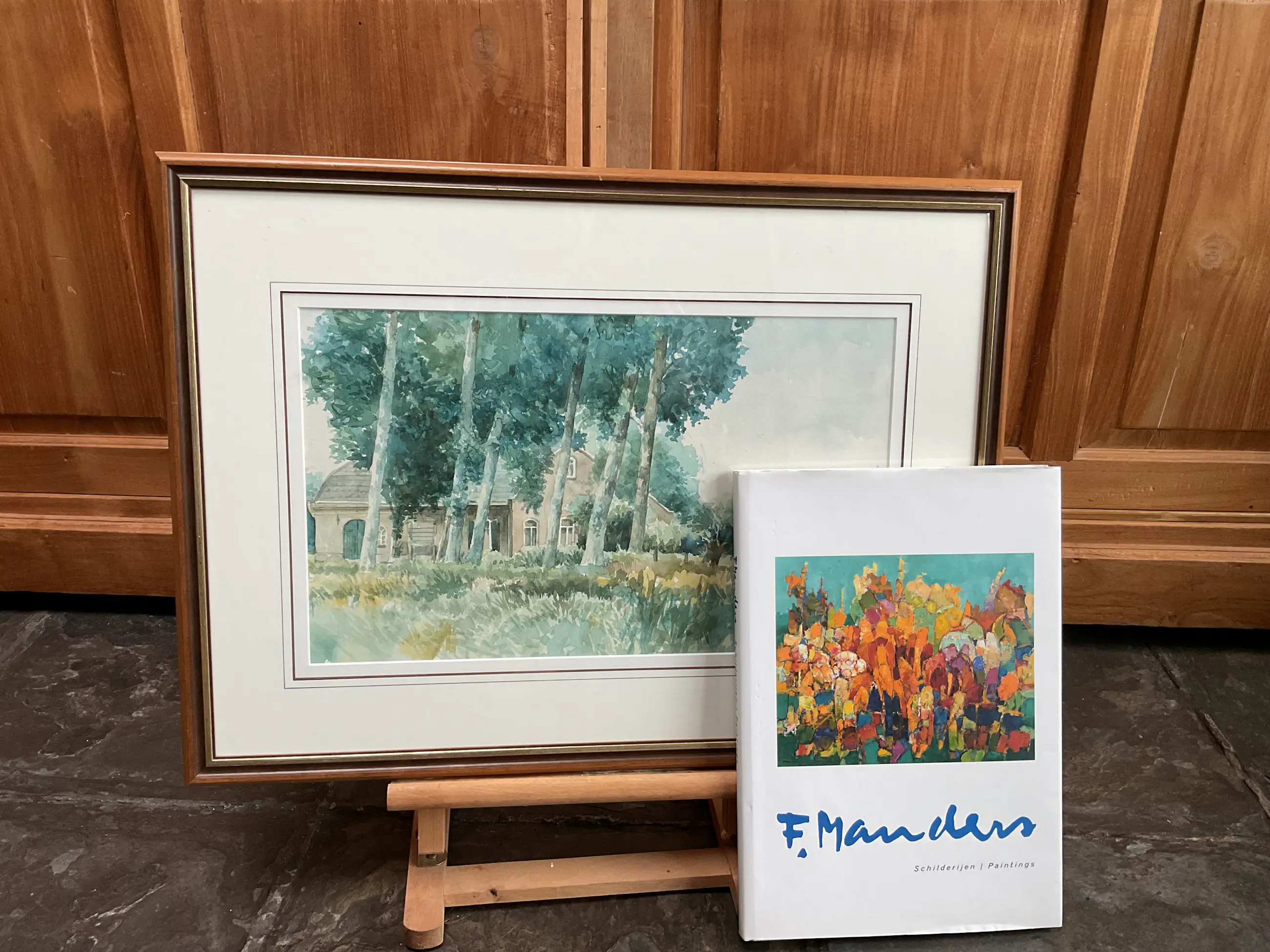 Frans Manders(1939) volgde de ‘Academie voor Industriële Vormgeving’ in Eindhoven en wordt in 1961 grafisch vormgever en illustrator. In 1978 wordt hij zelfstandig kunstenaar en schilderde aanvankelijk het Brabants Landschap en hij trekt op met Theo van Oorschot, Jos Leurs, Lambert van der Velden en Henri Hess. Later werk hij veel op het Franse platteland. Zijn aanvankelijk wat donker kleurpallet heeft hij dan losgelaten. In 1995 is zijn atelier afgebrand. Het werk dat hij daarna maakte was totaal anders, bijna abstract en fel en vrolijk van kleur. Expressief. Dat is wat in het boek te zien is.